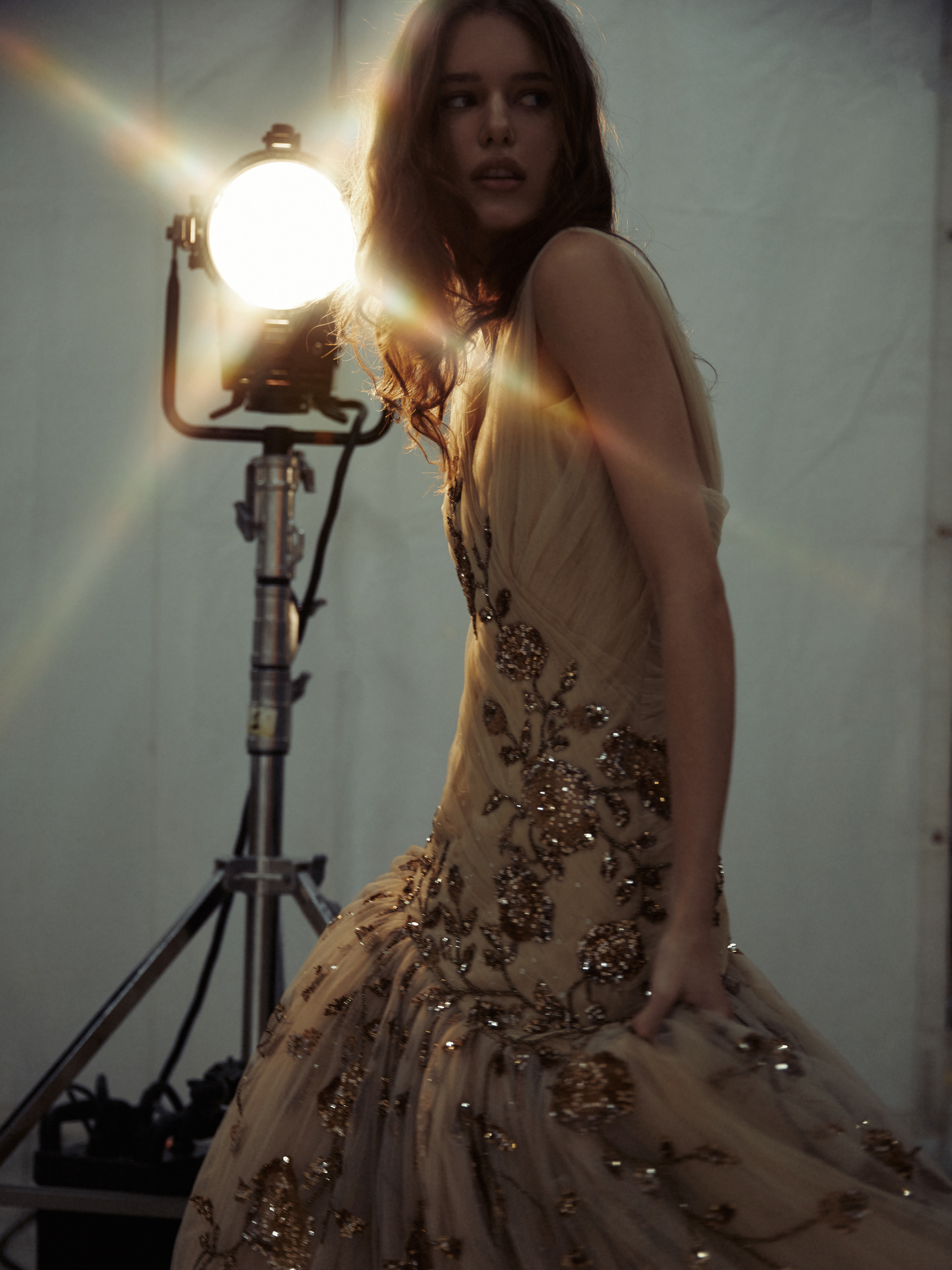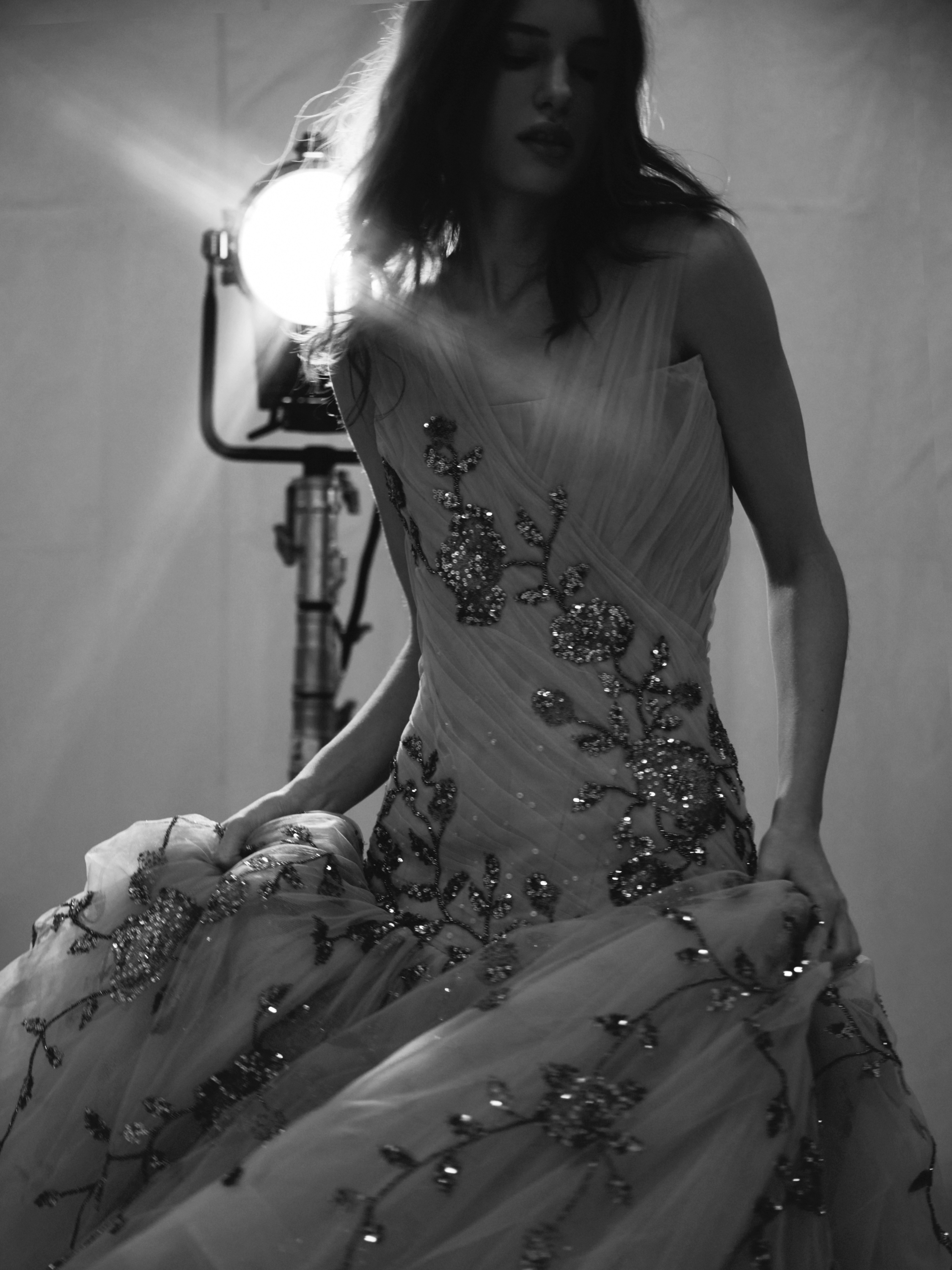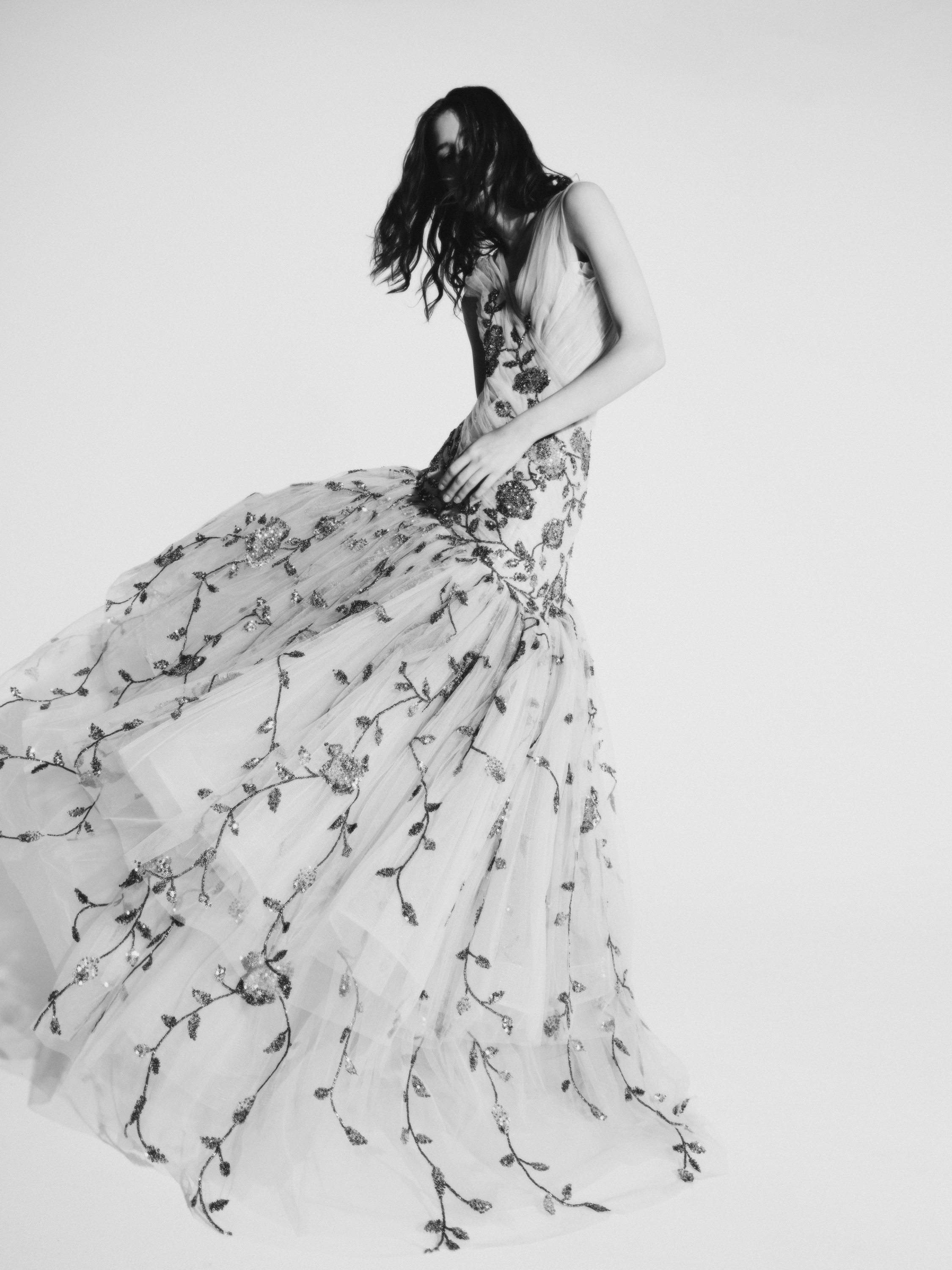 A romantic evening gown with a voluminous asymmetric floor-length skirt is made of beige tulle. The model is decorated with floral embroidery with sequins and beads. Smooth cross draping on the bodice. It took the craftsmen of the Yana fashion house 77 hours of handwork to create this dress.