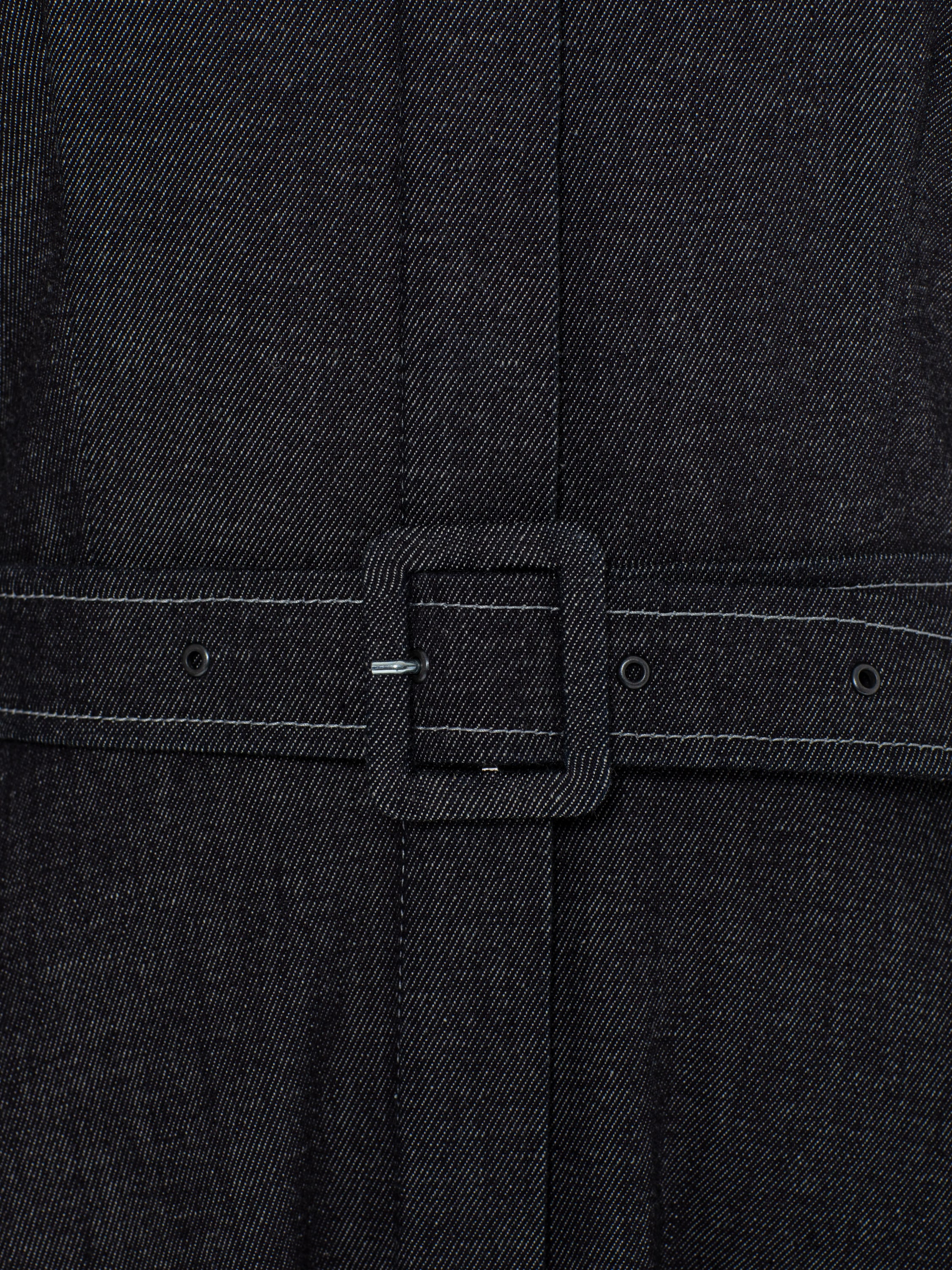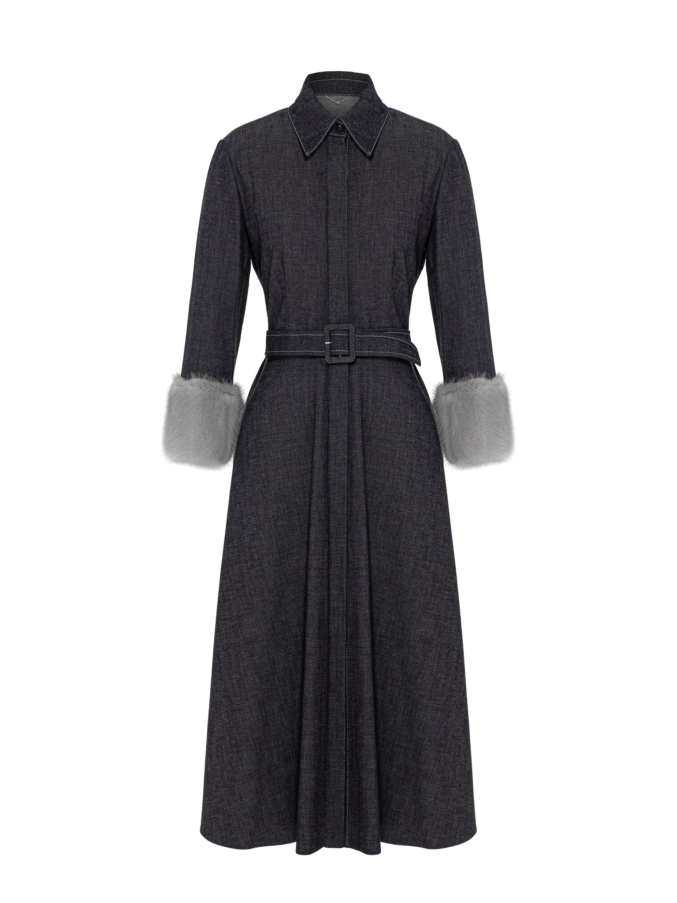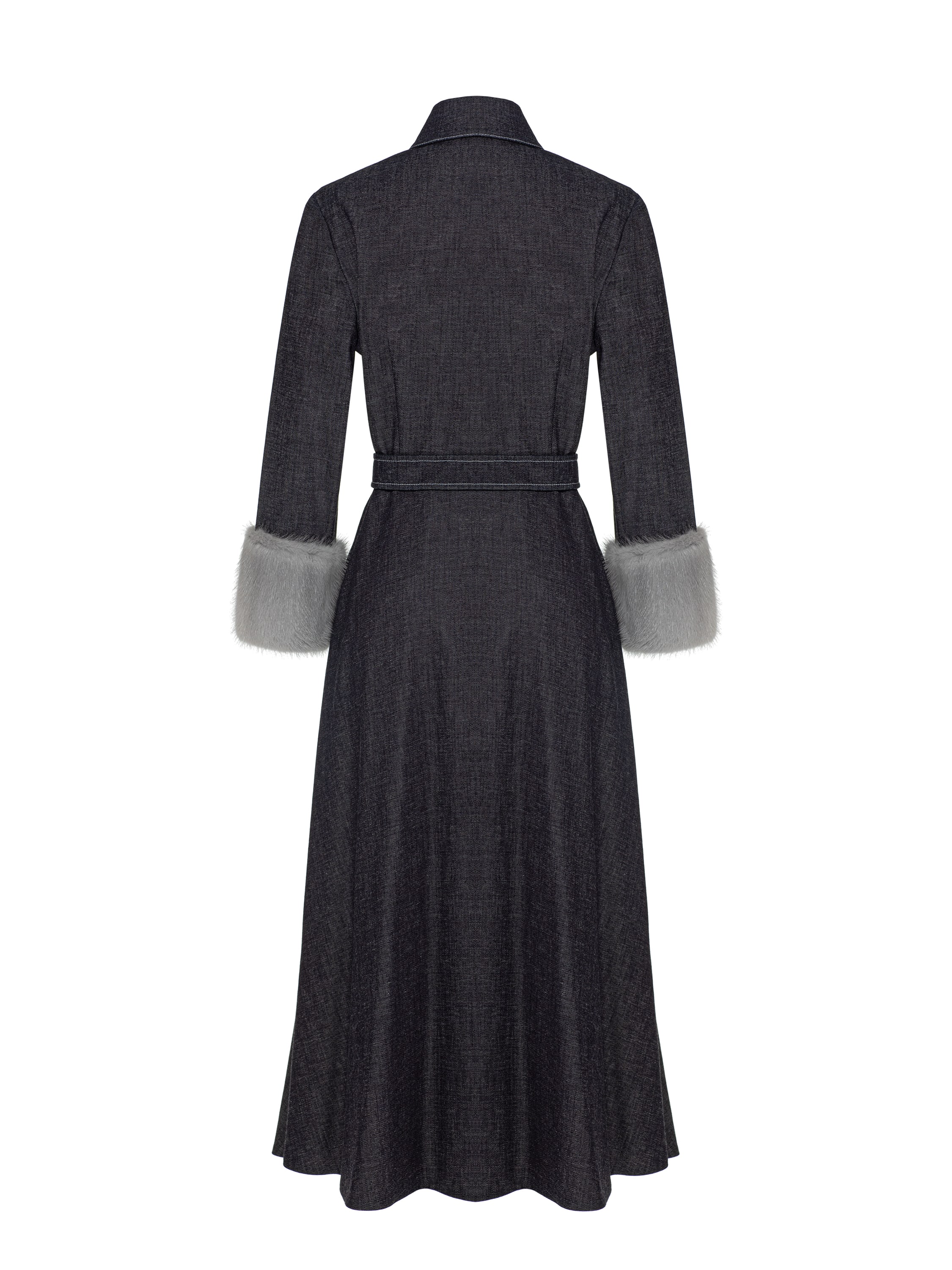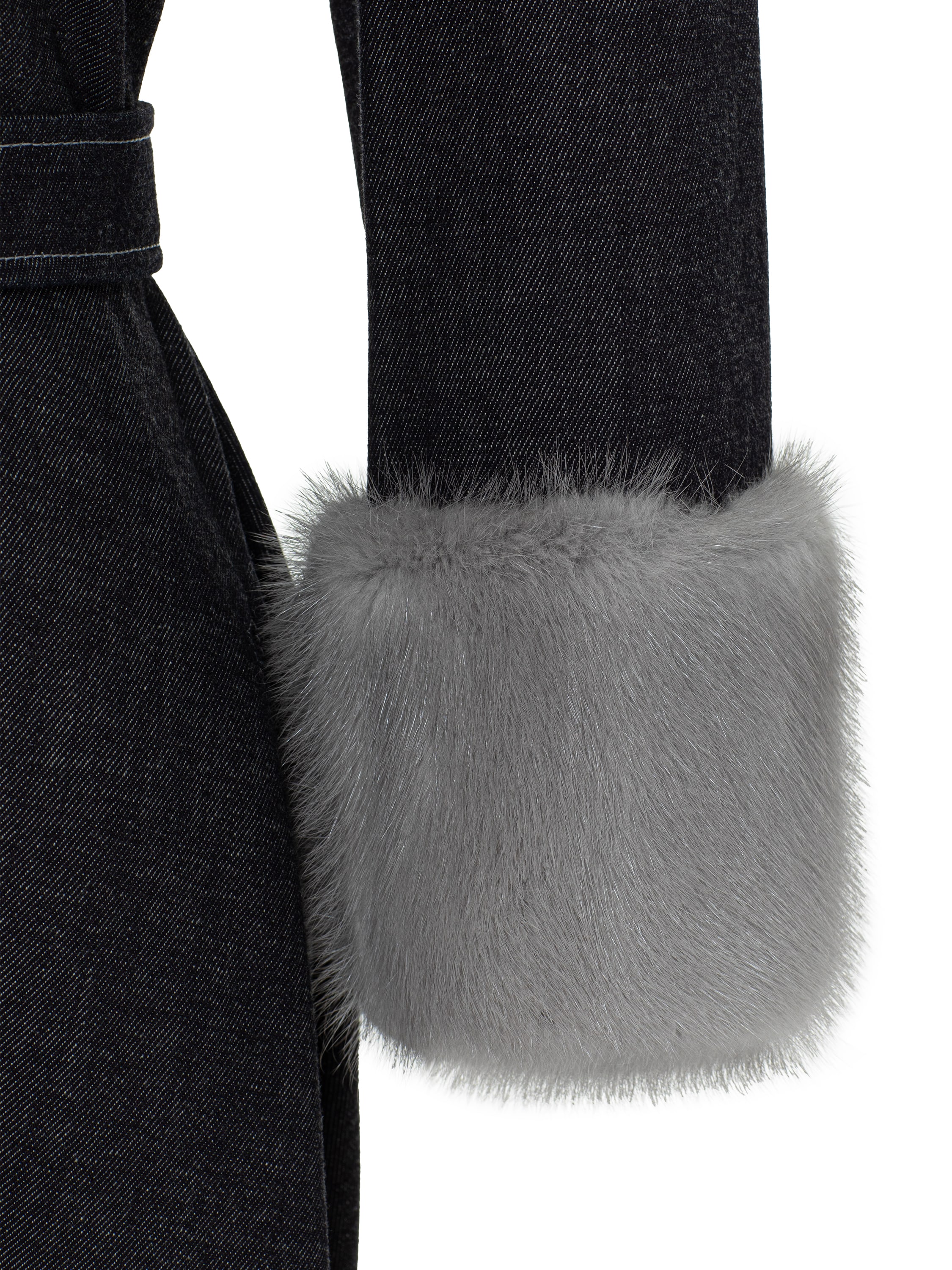 The black midi dress made of practical denim looks extraordinary thanks to the grey mink fur cuffs. The classic model with a turn-down collar is complemented by a waist belt and decorative white topstitching.
