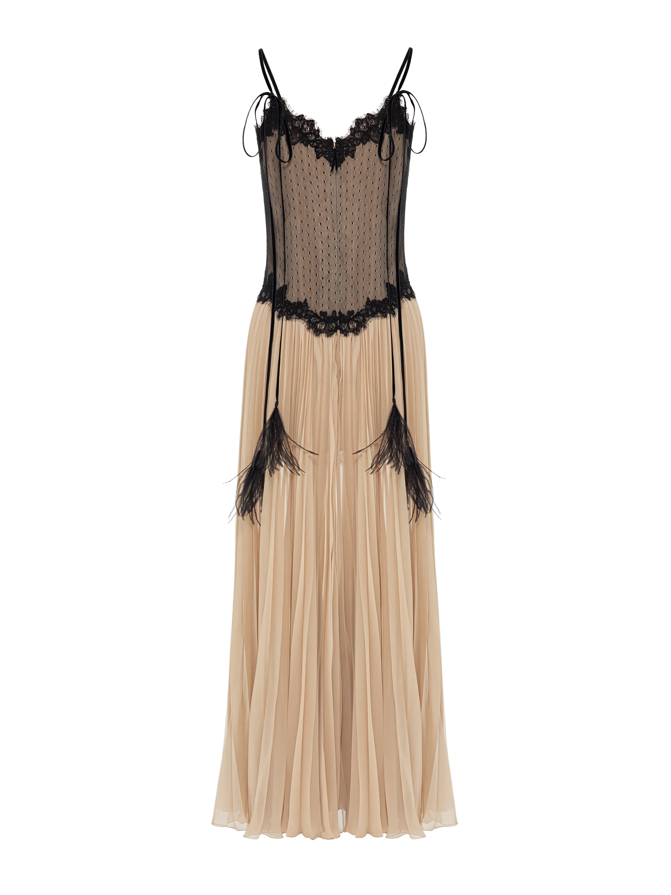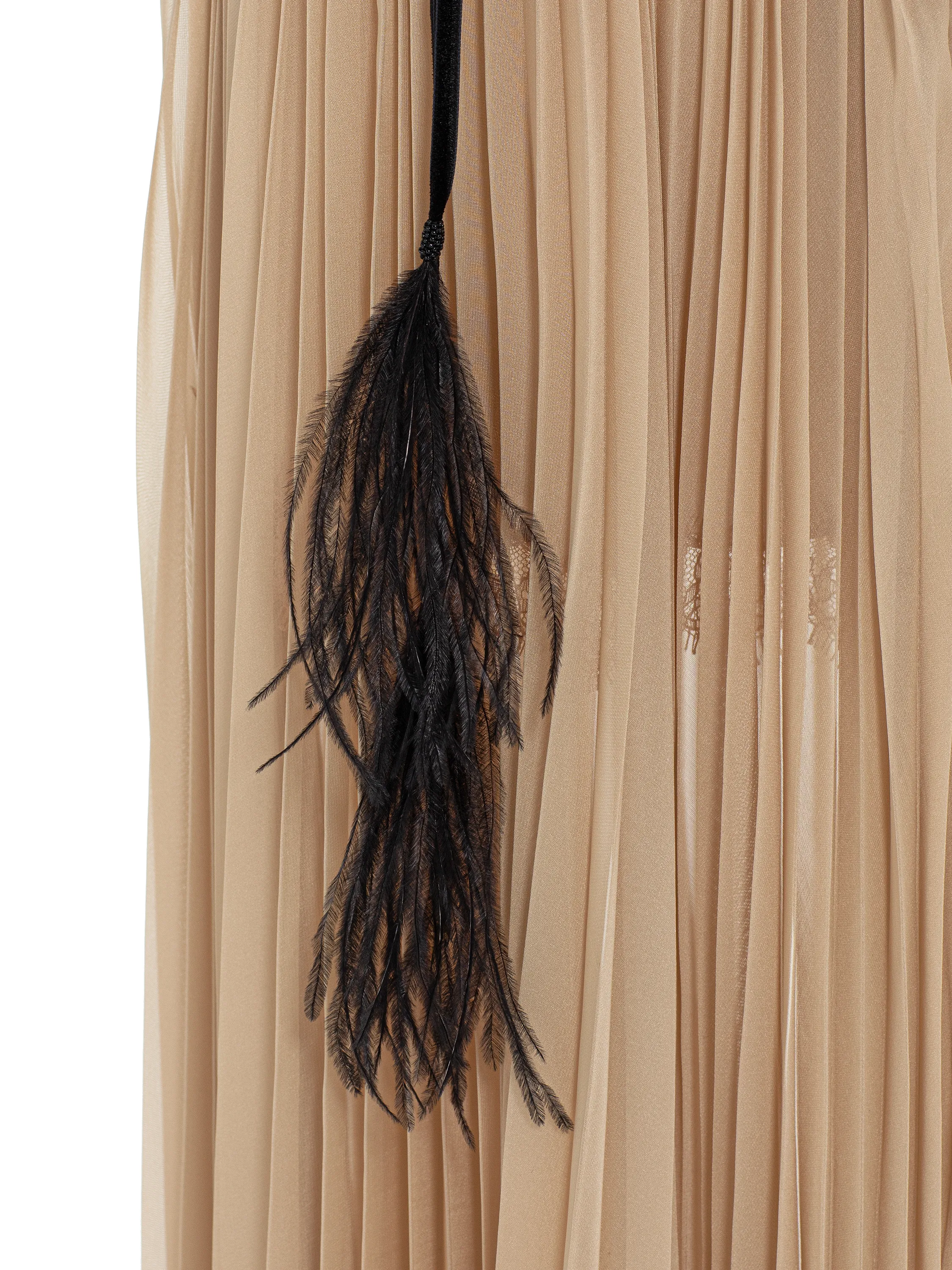 The beige pleated chiffon midi dress is made as romantic as possible with the addition of semi-sheer black lace and tassel ties with feathers. The elegant model with a V-neckline delicately accentuates the décolleté. Complete the look with graceful stiletto sandals from Yana Dress. It took the fashion house Yana’s craftsmen 37 hours of handwork to create the dress.
