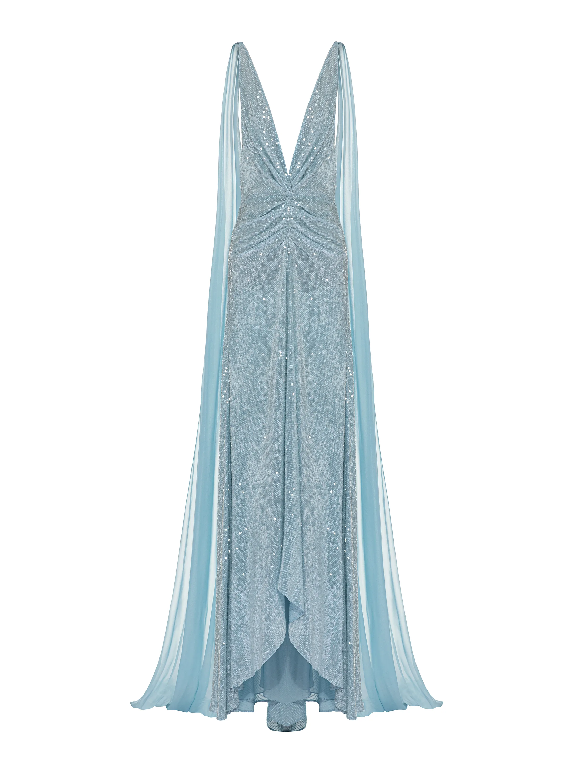 The exquisite sky-blue silk maxi dress embroidered with shimmering sequins looks like a true work of art. The model is complemented by a deep front neckline, draping at the waist and an open back. Chiffon straps smoothly transition into a train. Match the dress with jewelry from Yana Jewellery to emphasize its radiance.
