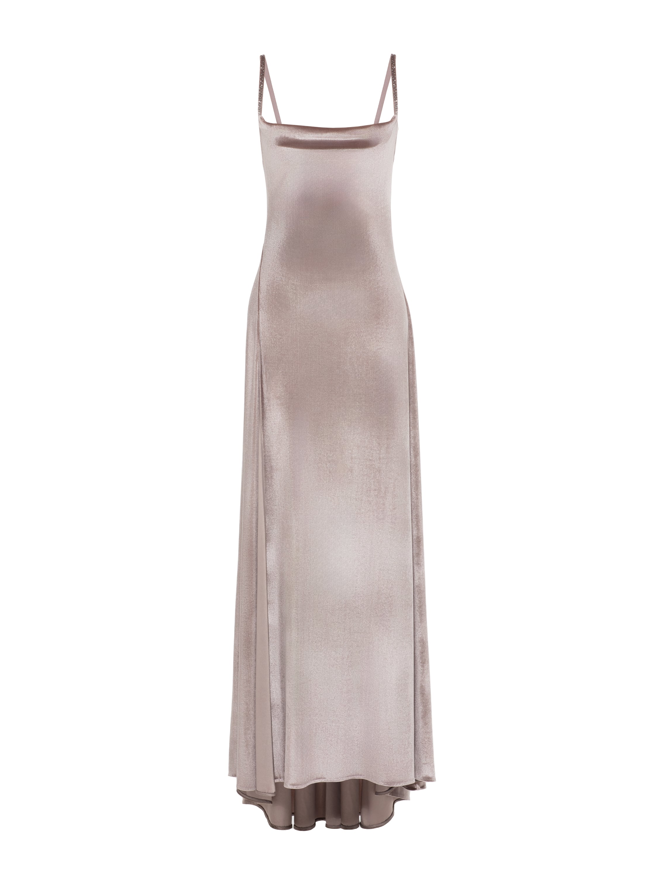 A figure-hugging maxi dress in brown velvet guarantees a flawless evening look. The minimalist design emphasizes the silhouette, creating an ideal hourglass shape. Smooth draping along the neckline and shimmering rhinestones on the straps. High slit at the front.