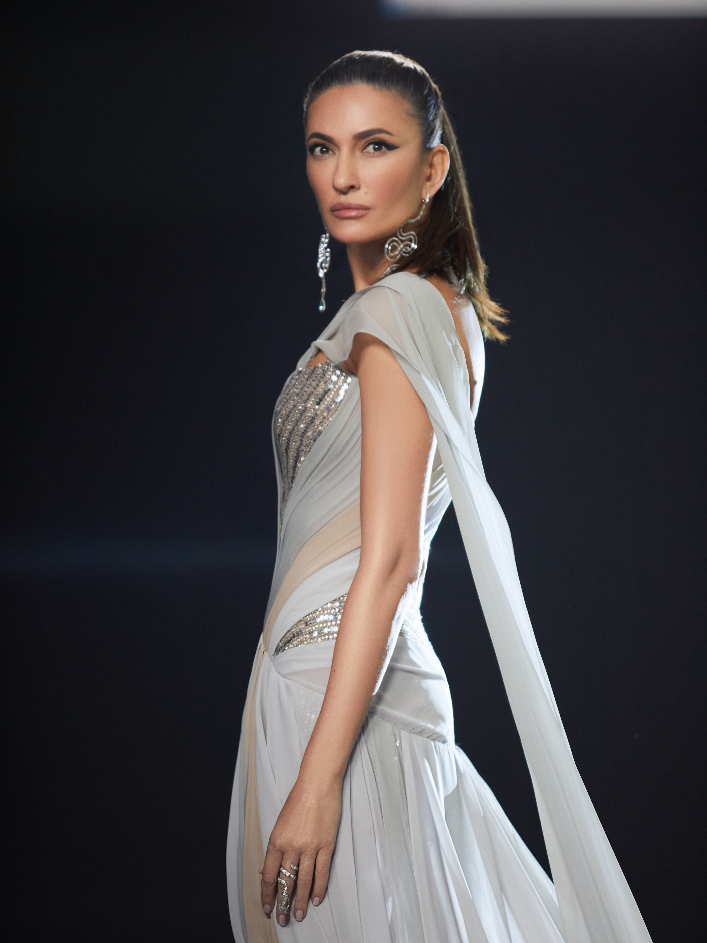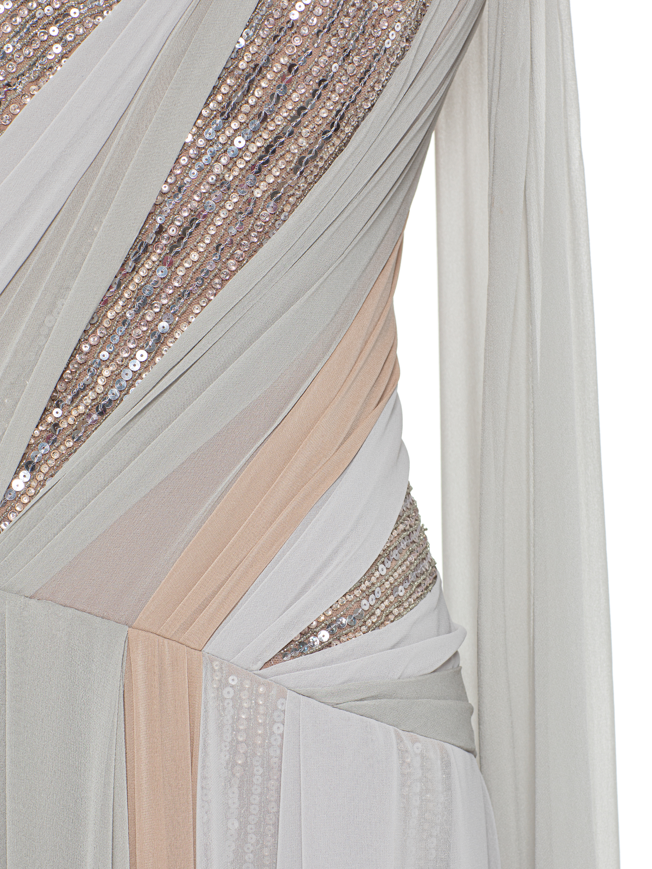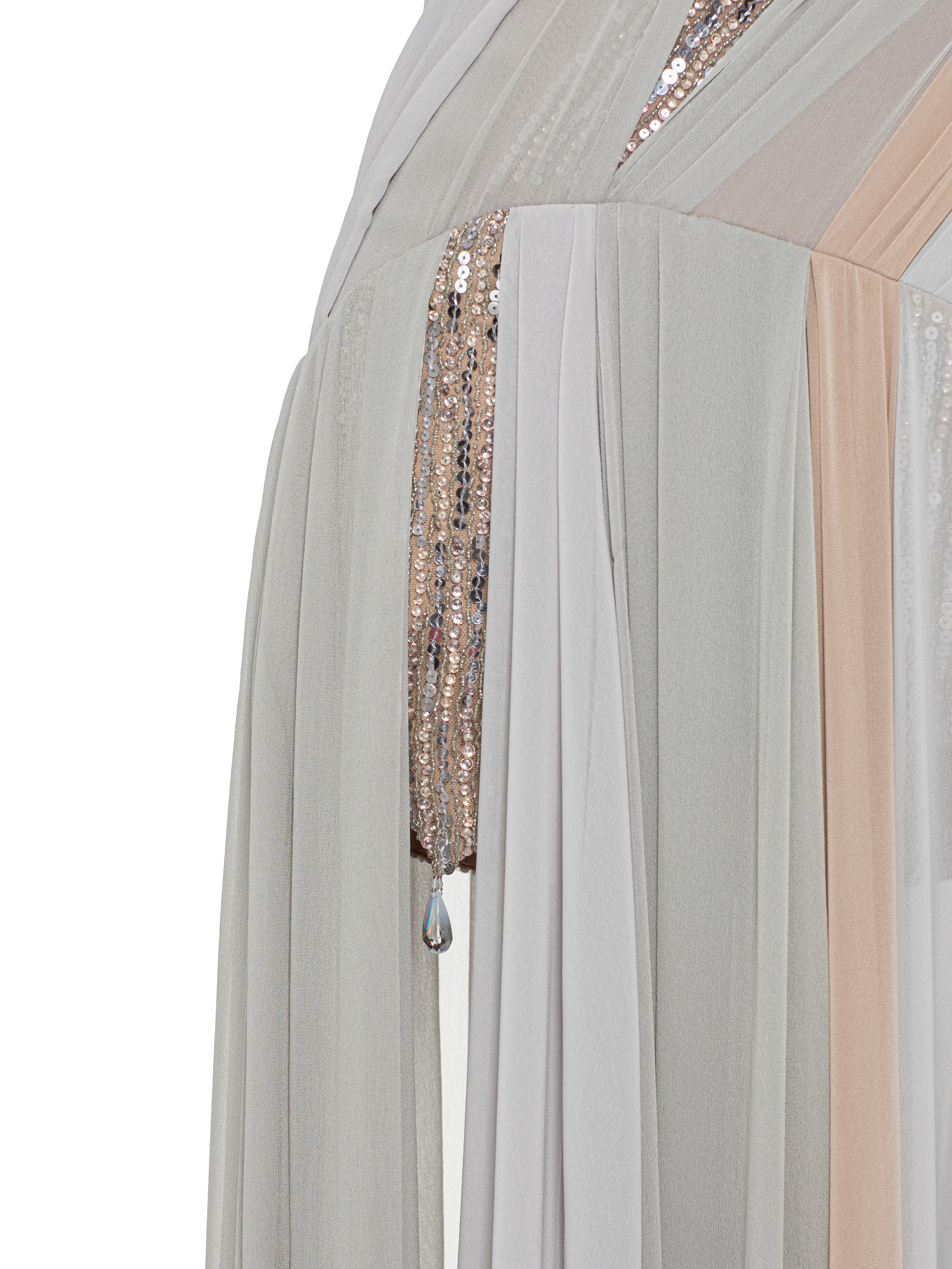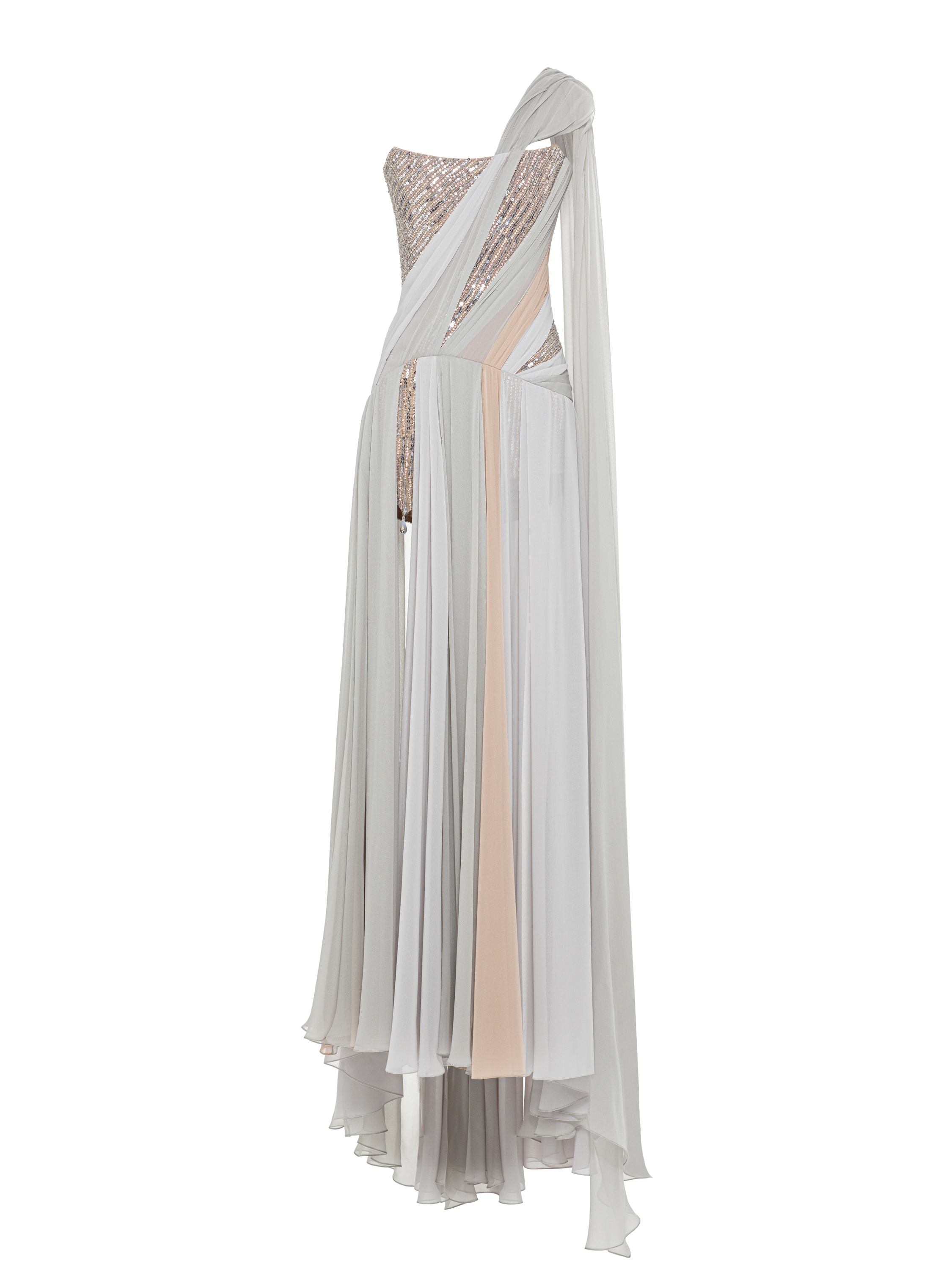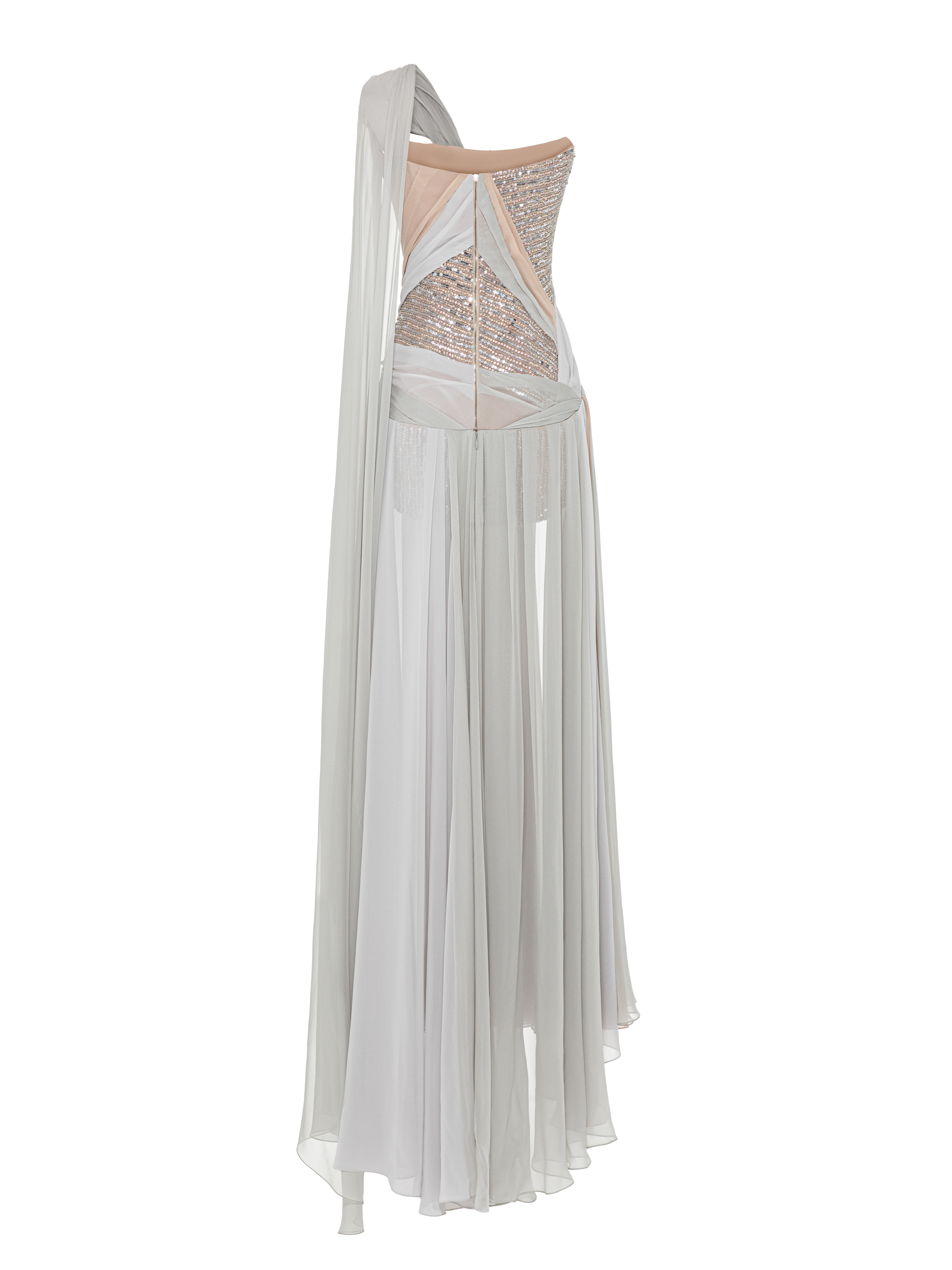 An exquisite corset dress embroidered with shimmering silver sequins looks like a true work of art. Draping made of grey-blue chiffon on the bodice, smoothly transitioning into a train, transforms the length of the dress from mini to maxi. Pair the dress with jewelry from Yana Jewellery to highlight its radiance.