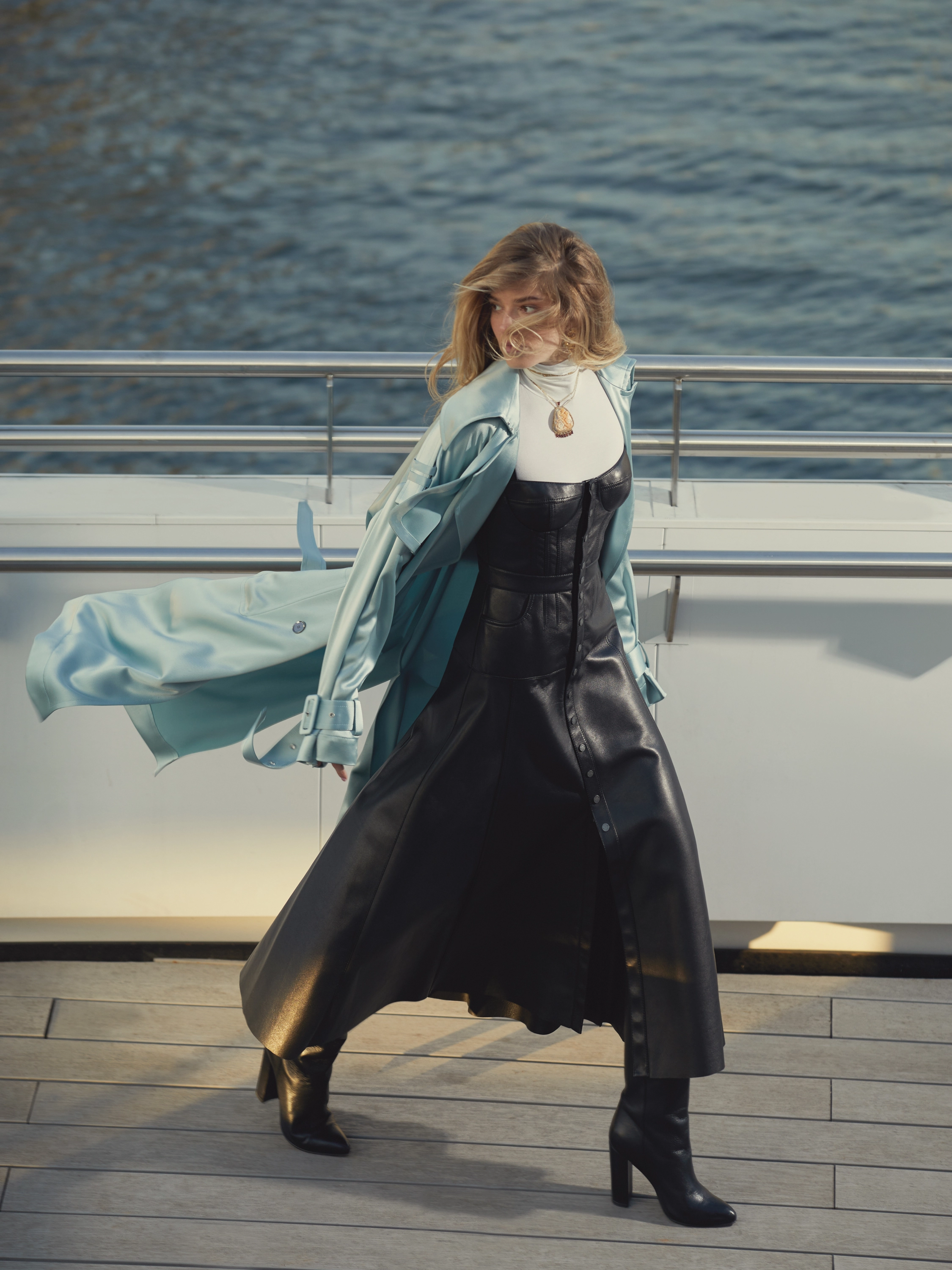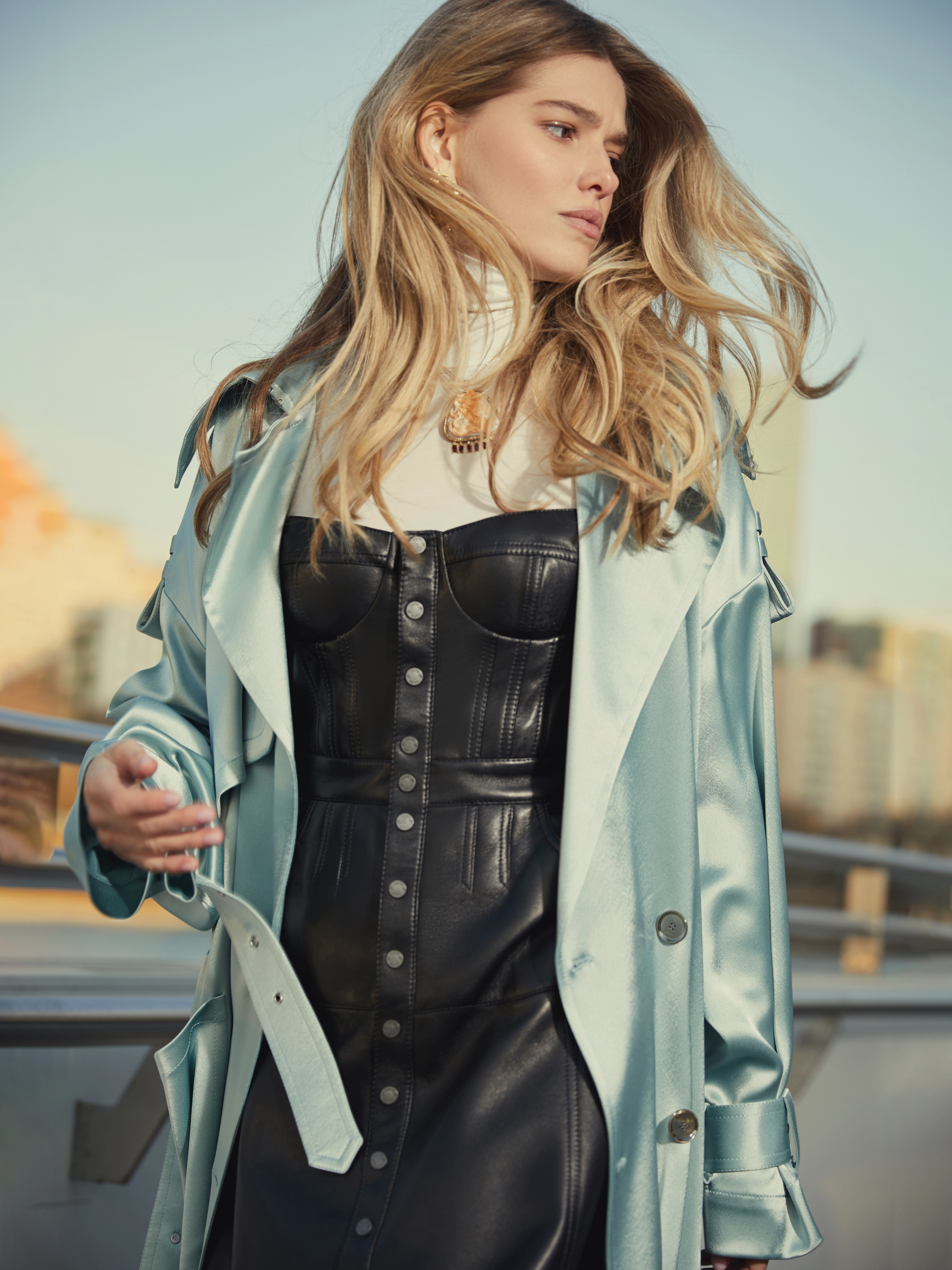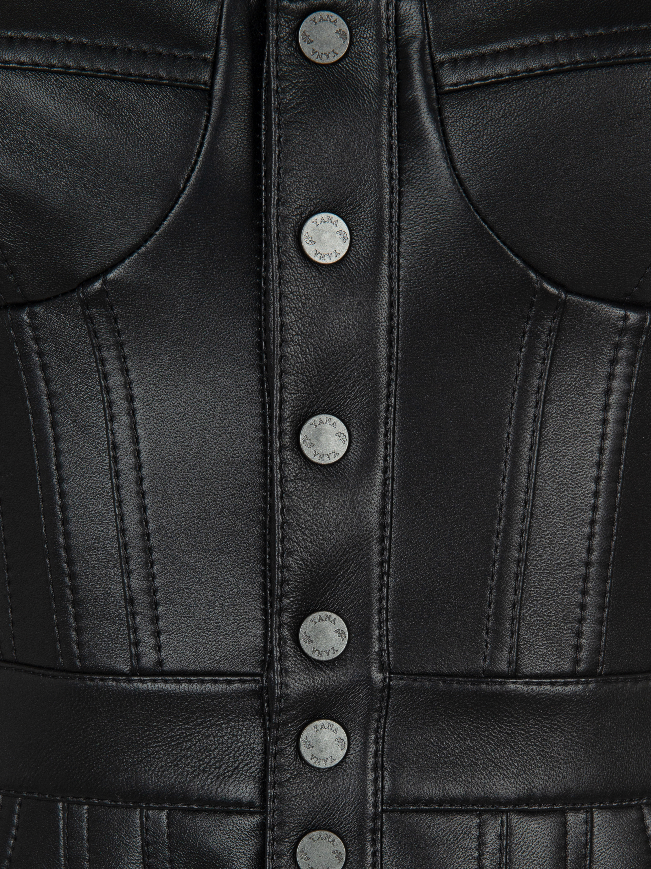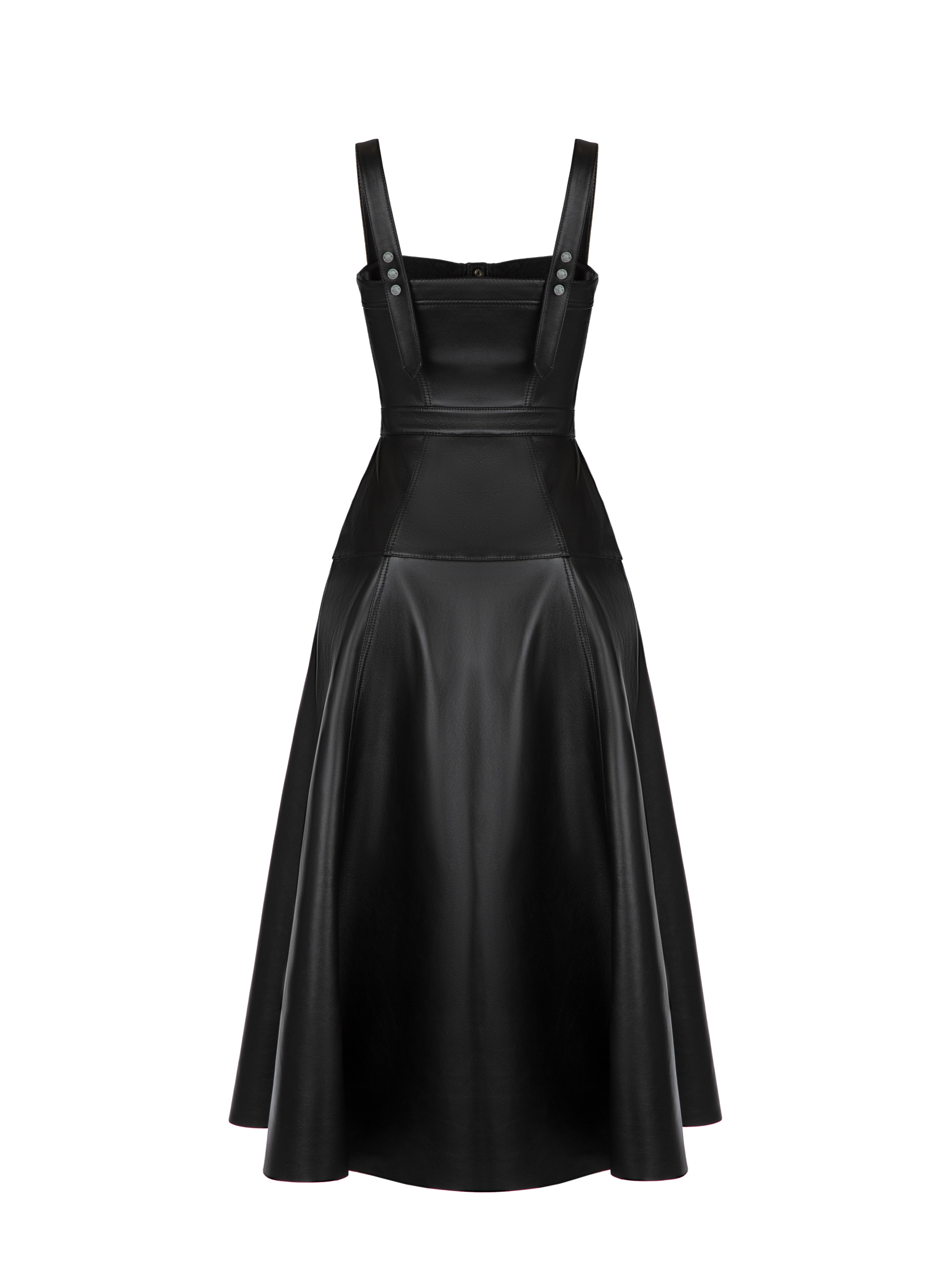 The black midi dress with straps is made of genuine leather. The fit can be conveniently adjusted with back snap-button straps. Flared hem and front snap-button closure.