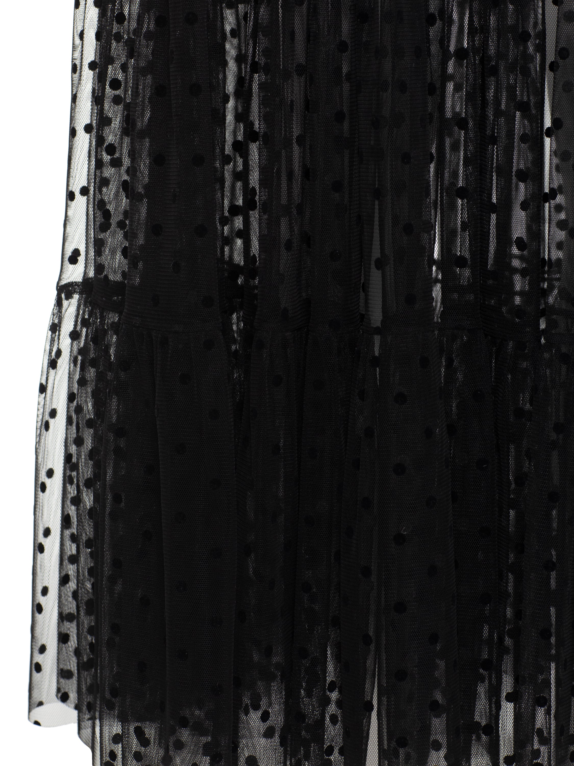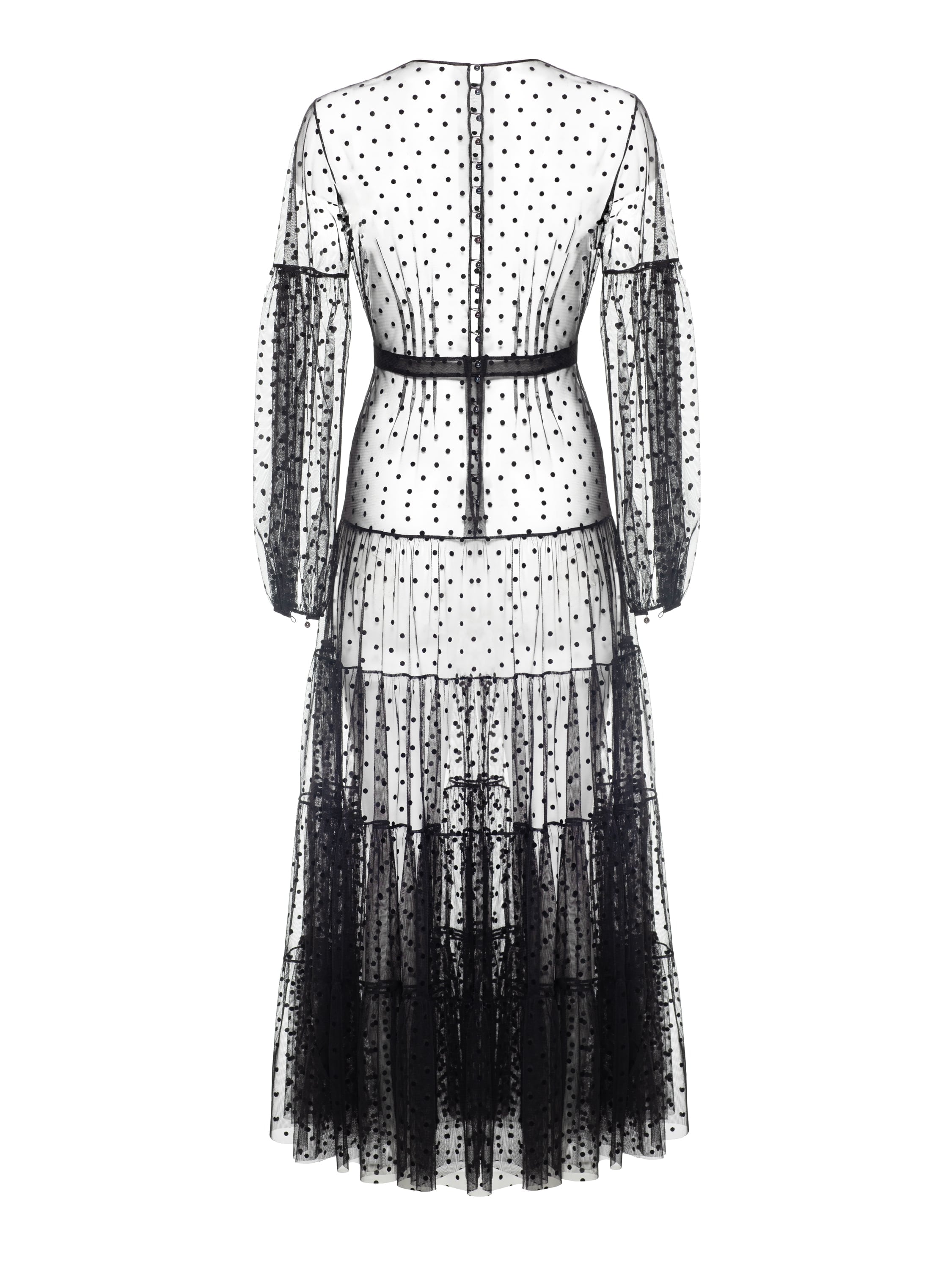 The black maxi dress with voluminous sleeves is made of semi-sheer polka-dot mesh. Complete the look with a classic silk slip.