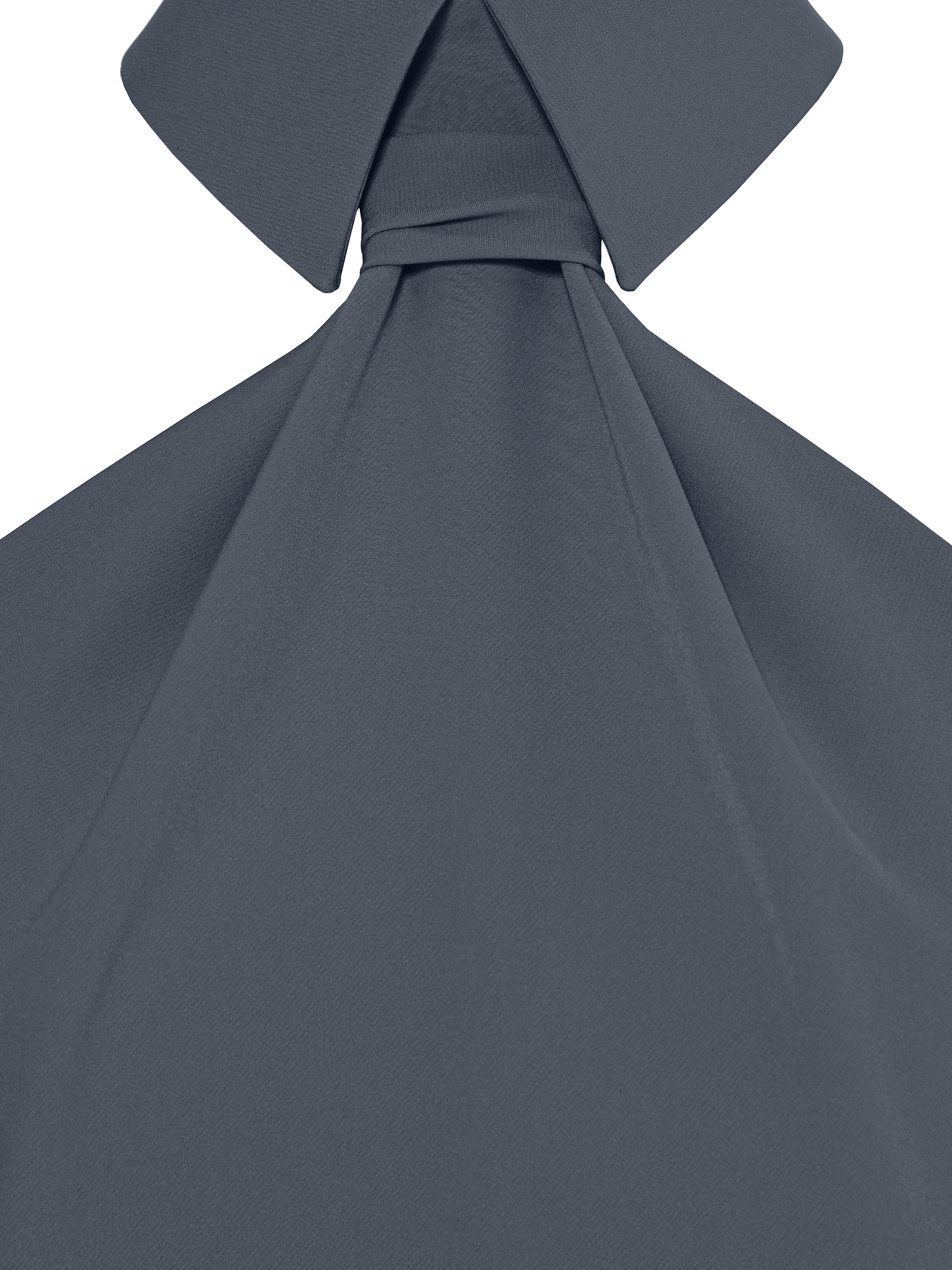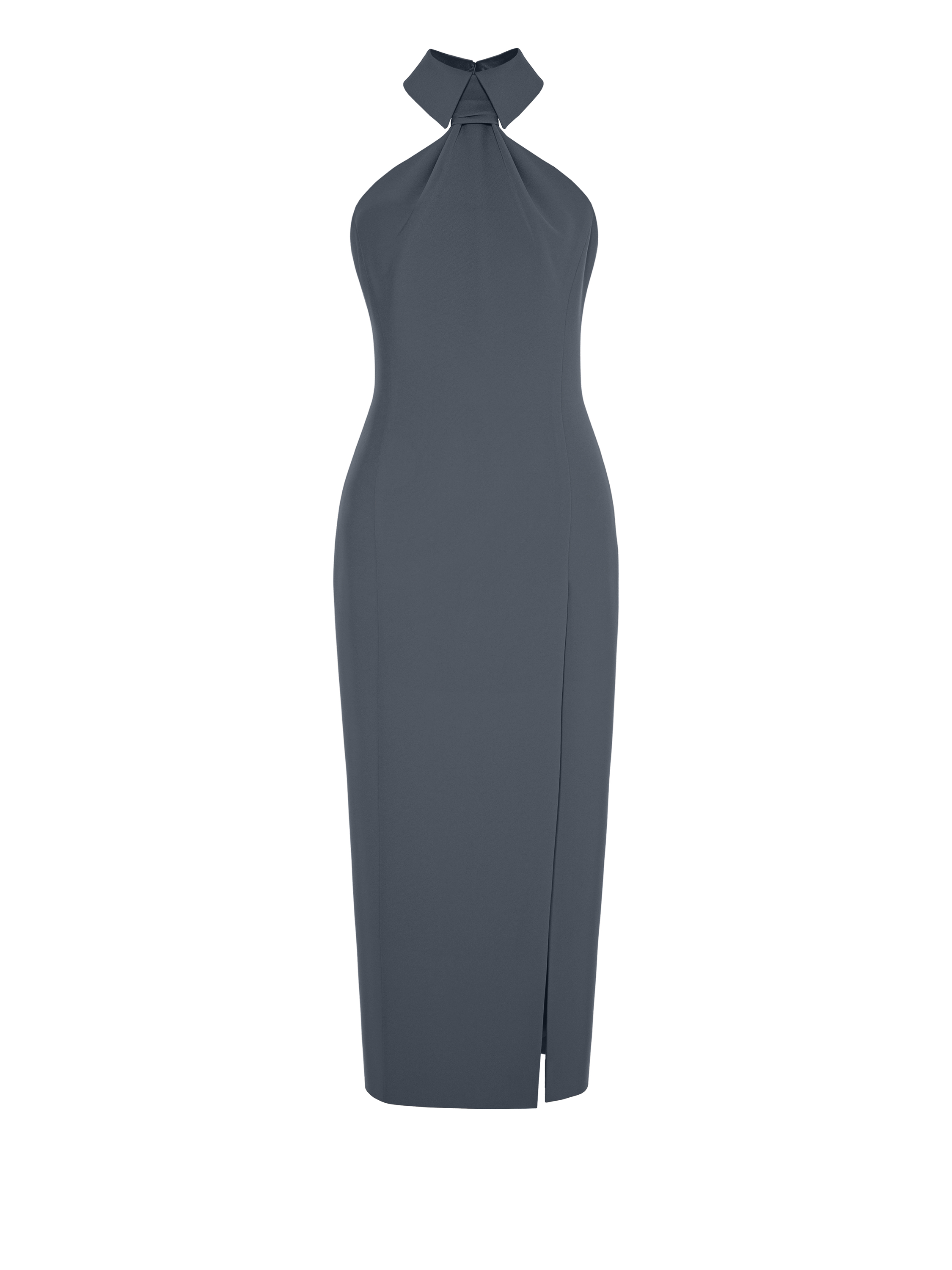 A grey fitted sleeveless midi dress is made of viscose that drapes softly at the bust. The model is complemented with a turn-down collar with a tie imitation and a high front slit. It fastens with buttons and a zipper at the back.