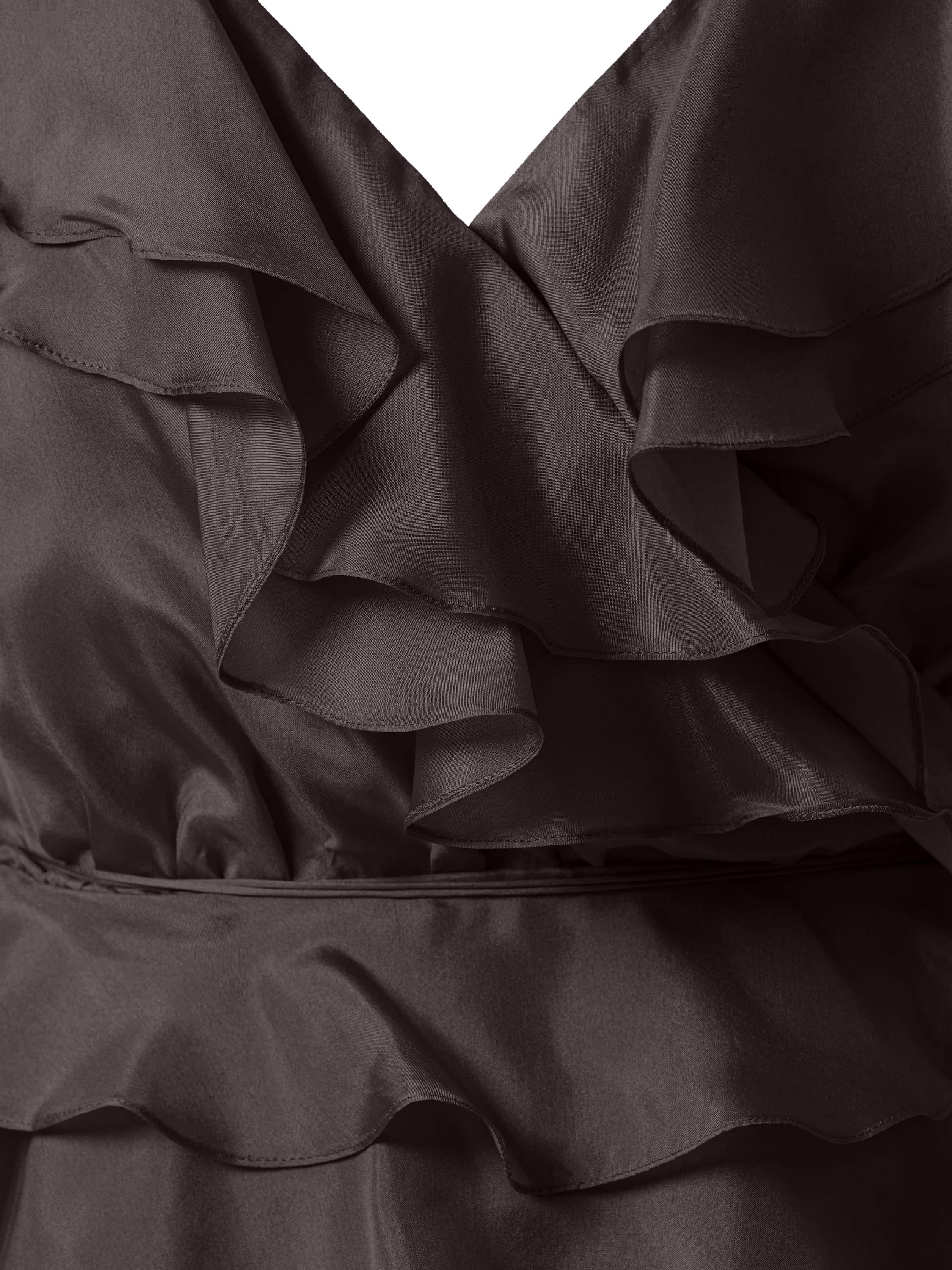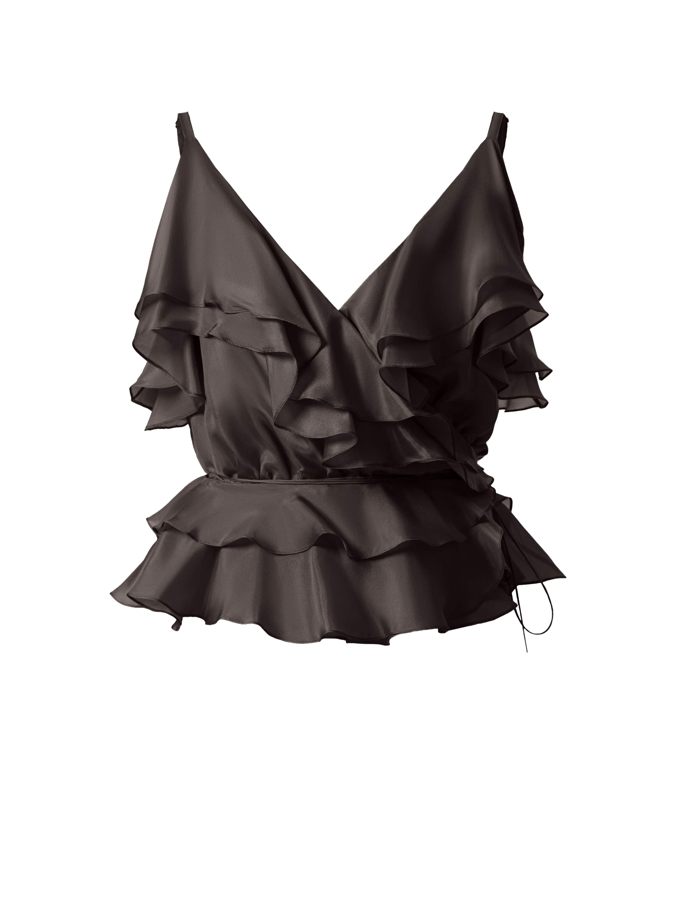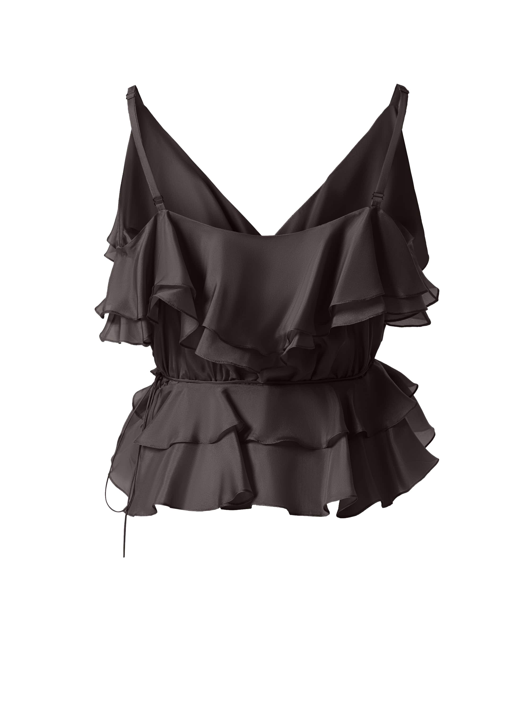 A top with thin adjustable straps made of dark brown silk. The model is decorated with multi‑tiered flounces that add airiness to the silhouette. It features a tie at the waist.
