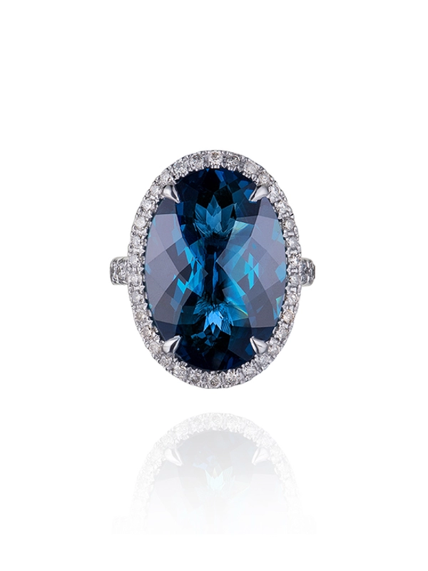 White gold ring with London Blue topaz in oval cut weighing 11.20 ct. and 44 round cut diamonds weighing 0.50 ct. Product weight-8.89 g