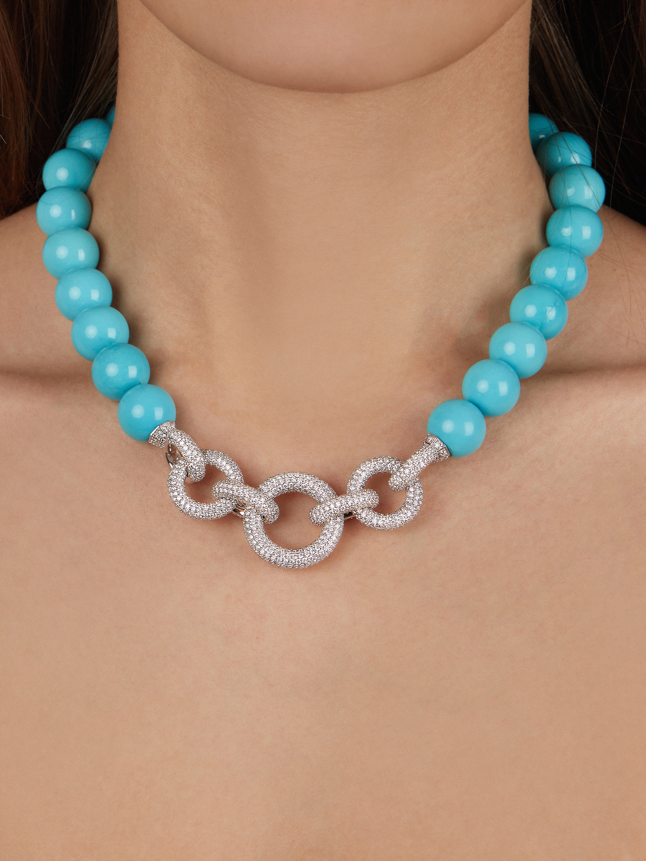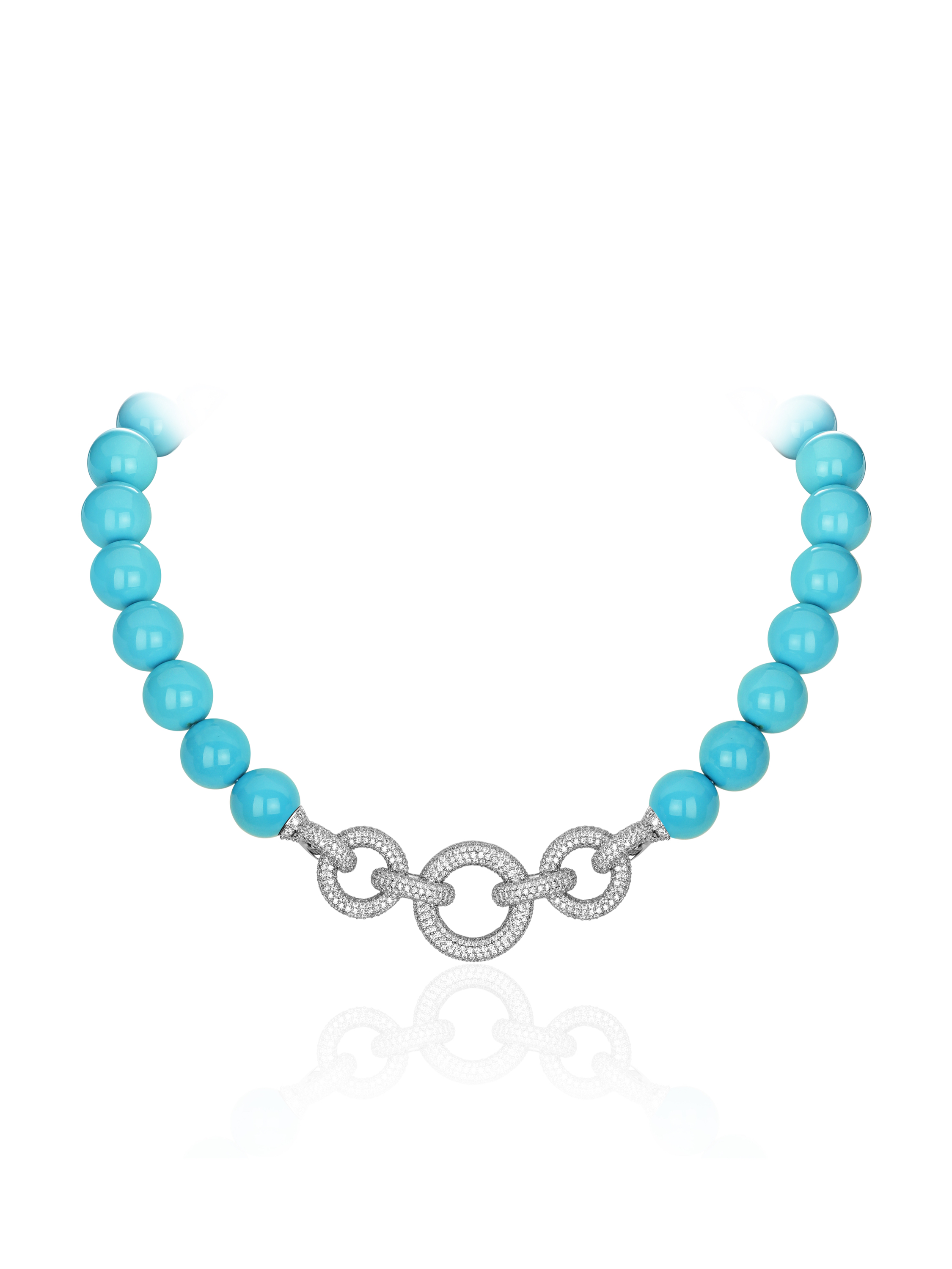 White gold necklace inlaid with 25 turquoise beads weightning 81.78 g. and 13.75-14 mm in diameter and 1,095 round-cut diamonds weighing 8.77 ct.