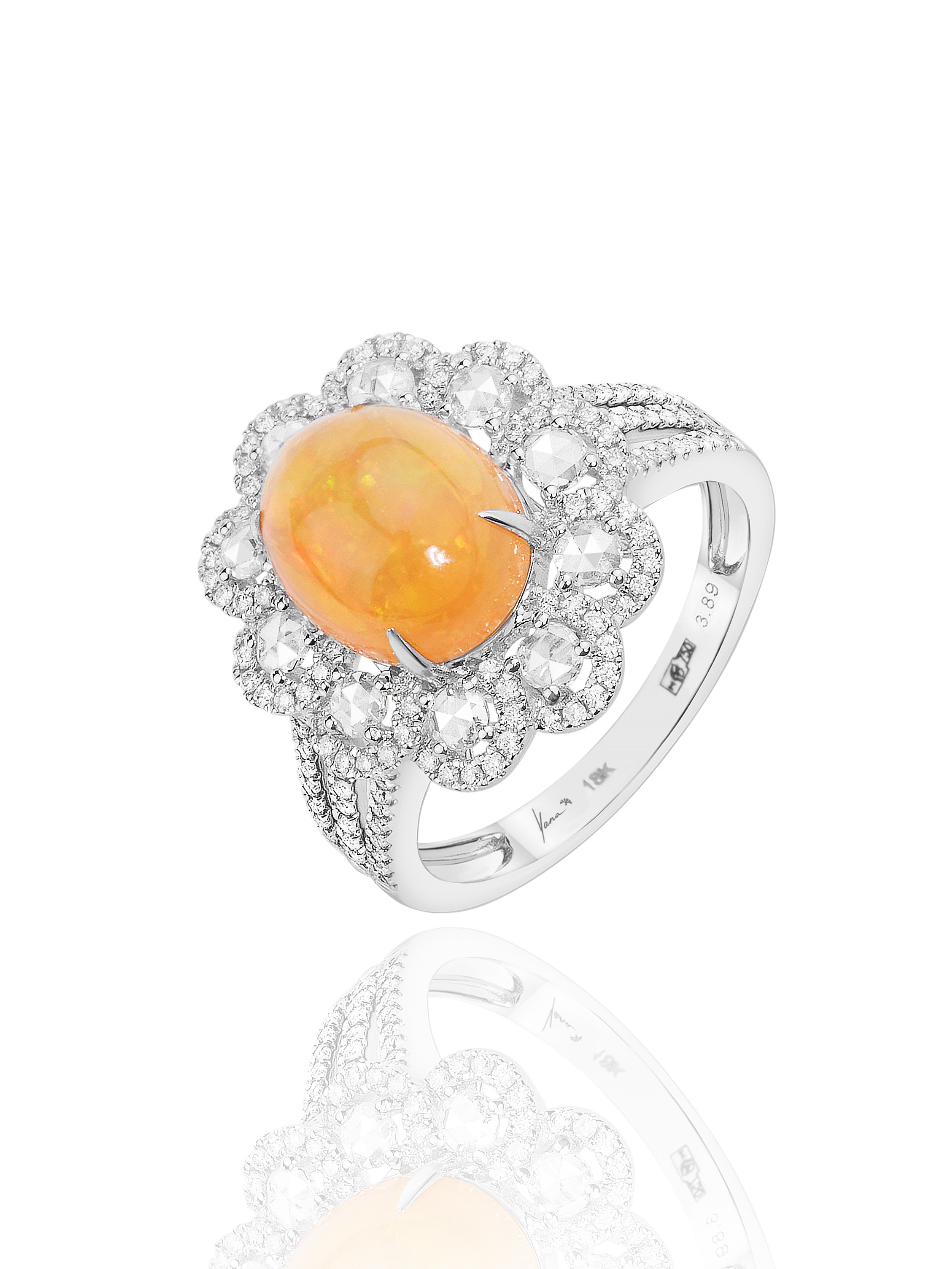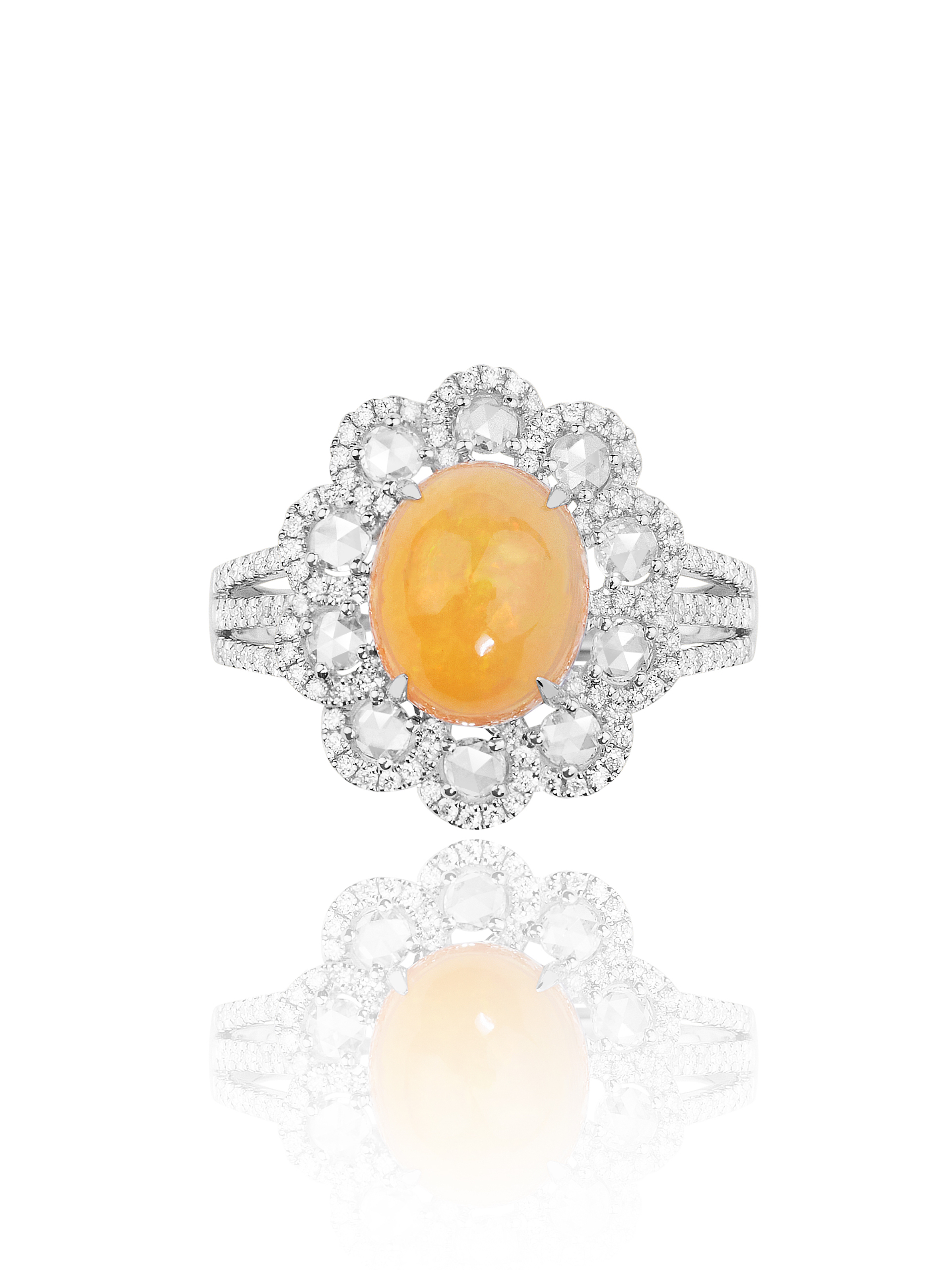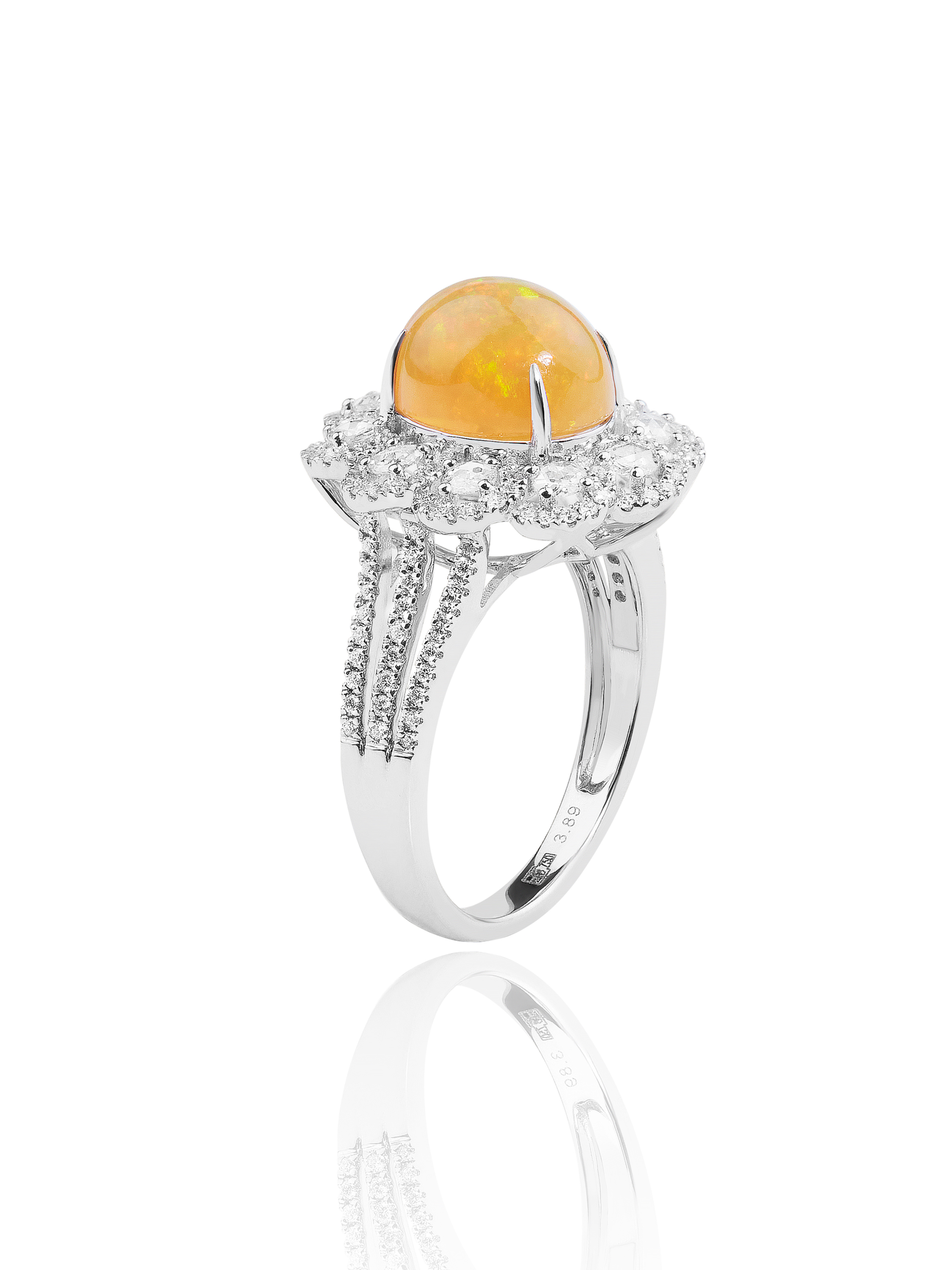 White gold ring with opal (total weight of 3.21 ct), 10 rose-cut diamonds ( (total weight of 0.33 ct) and 138 round-cut diamonds (total weight of 0.35 ct).