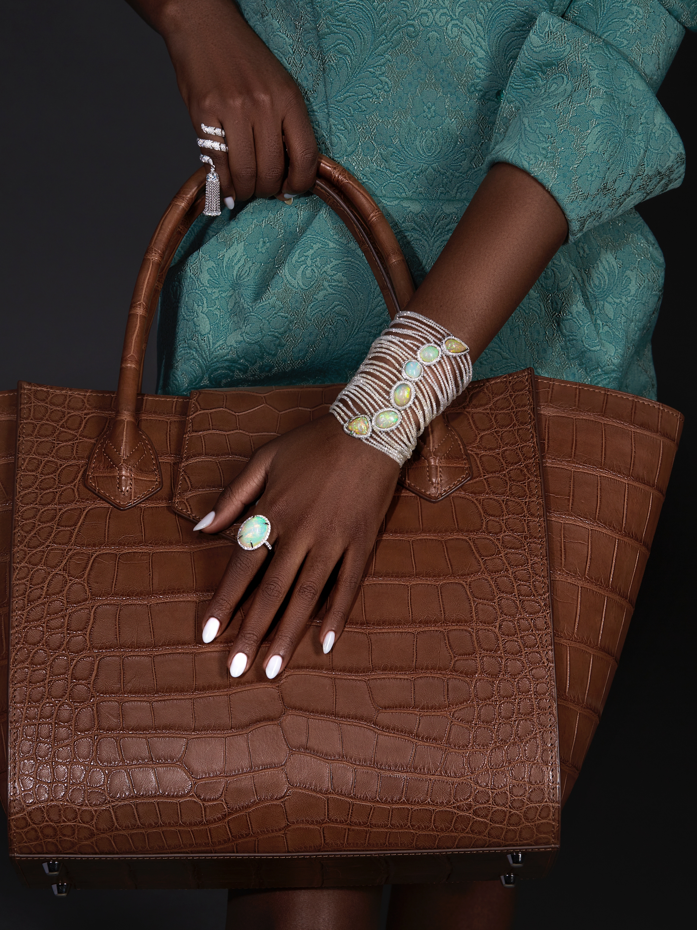 White gold Tassel ring is encrusted with 4 Marquis aquamarines (total weight 0.27 ct), 29 briolet diamonds (total weight 2.69 ct), and 353 round-cut diamonds (total weight 2.2 ct).