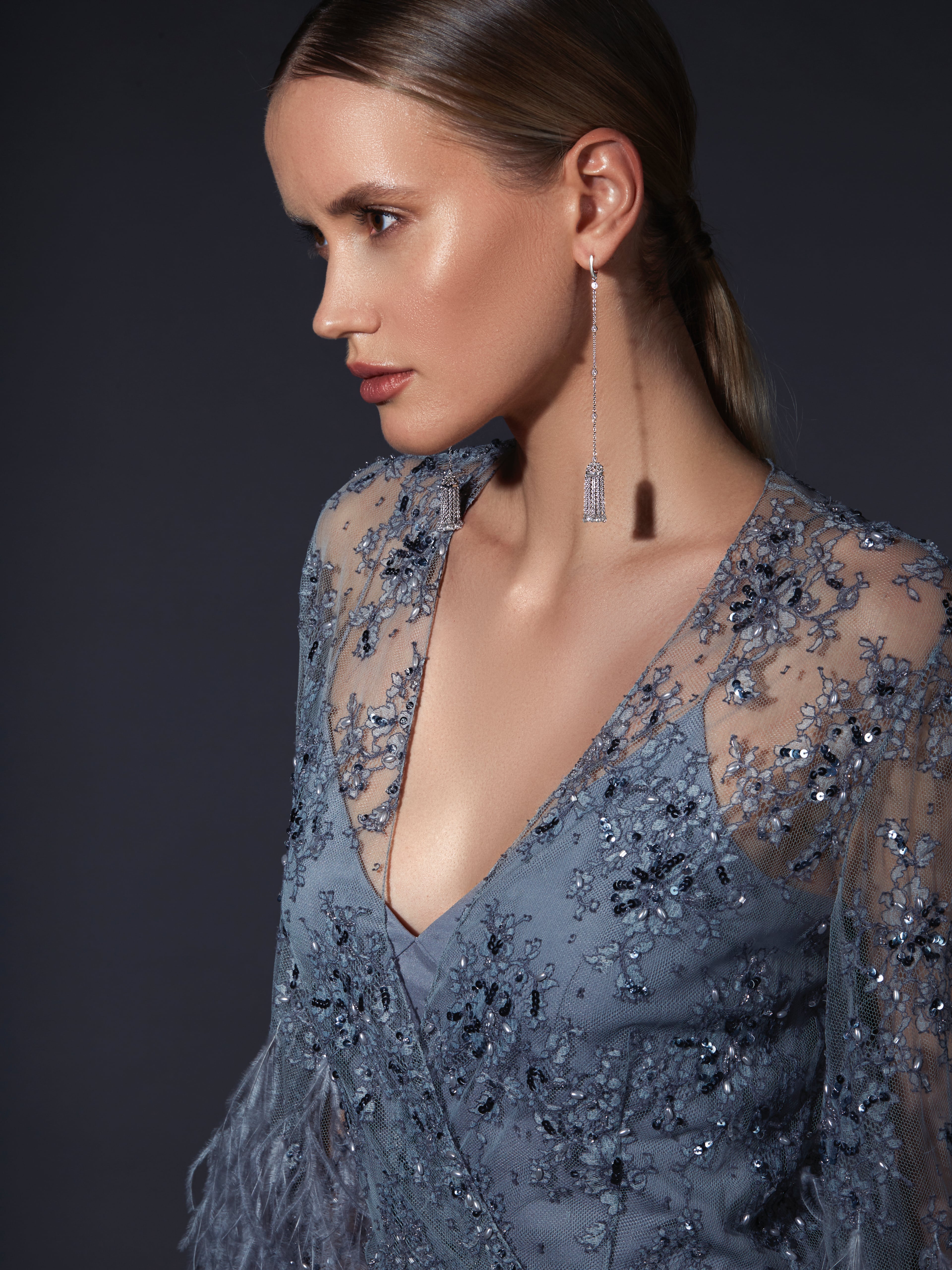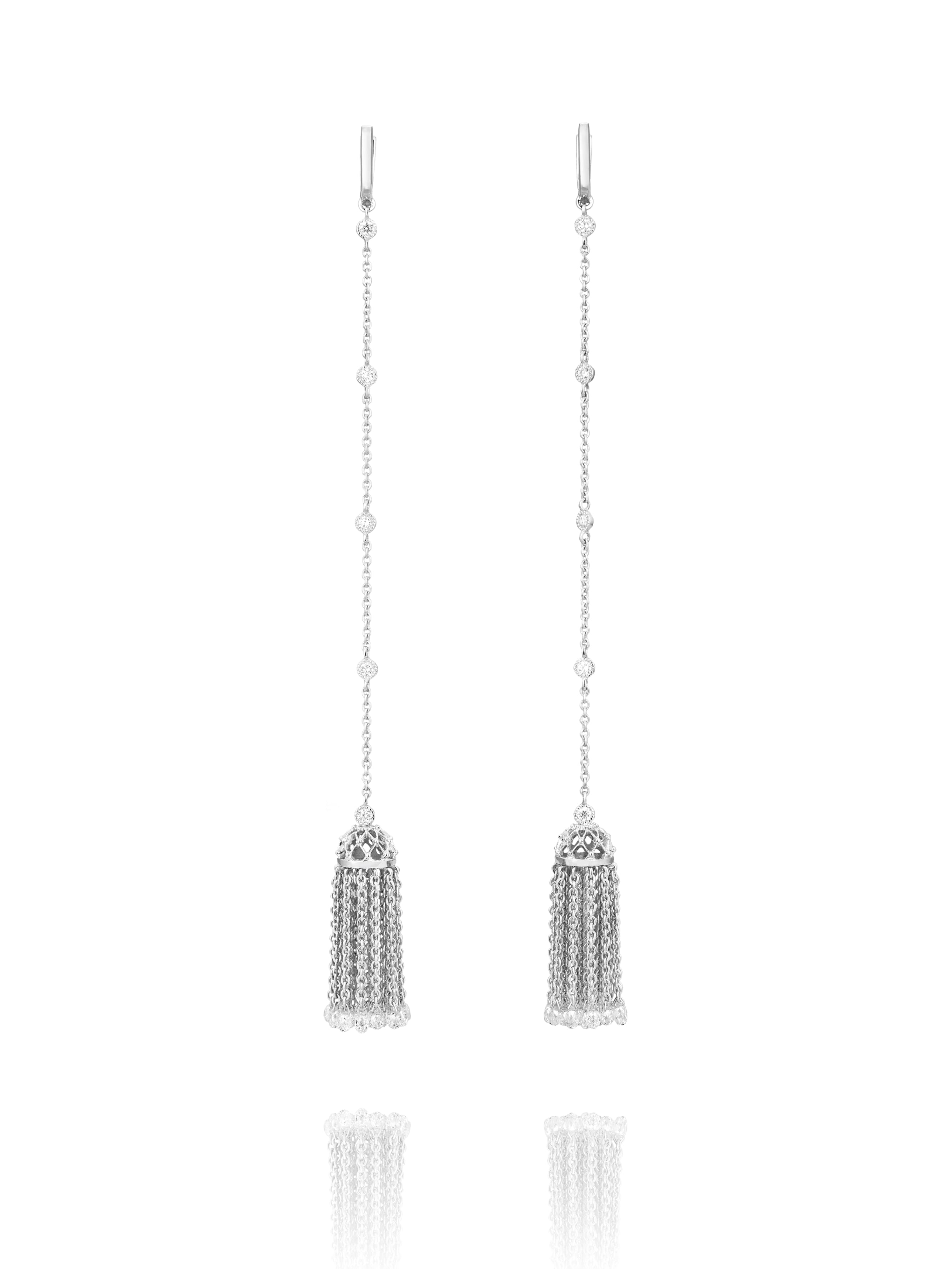 White gold tassel earrings with 50 briolet diamonds (total weight 4.73 ct) and 10 round-cut diamonds (total weight 0.33 ct). Product length-12 cm.