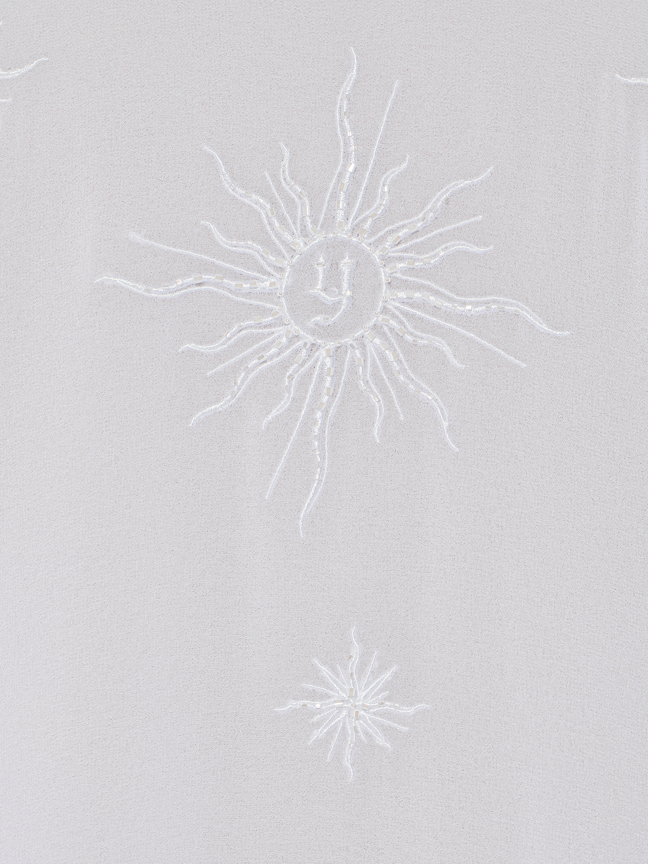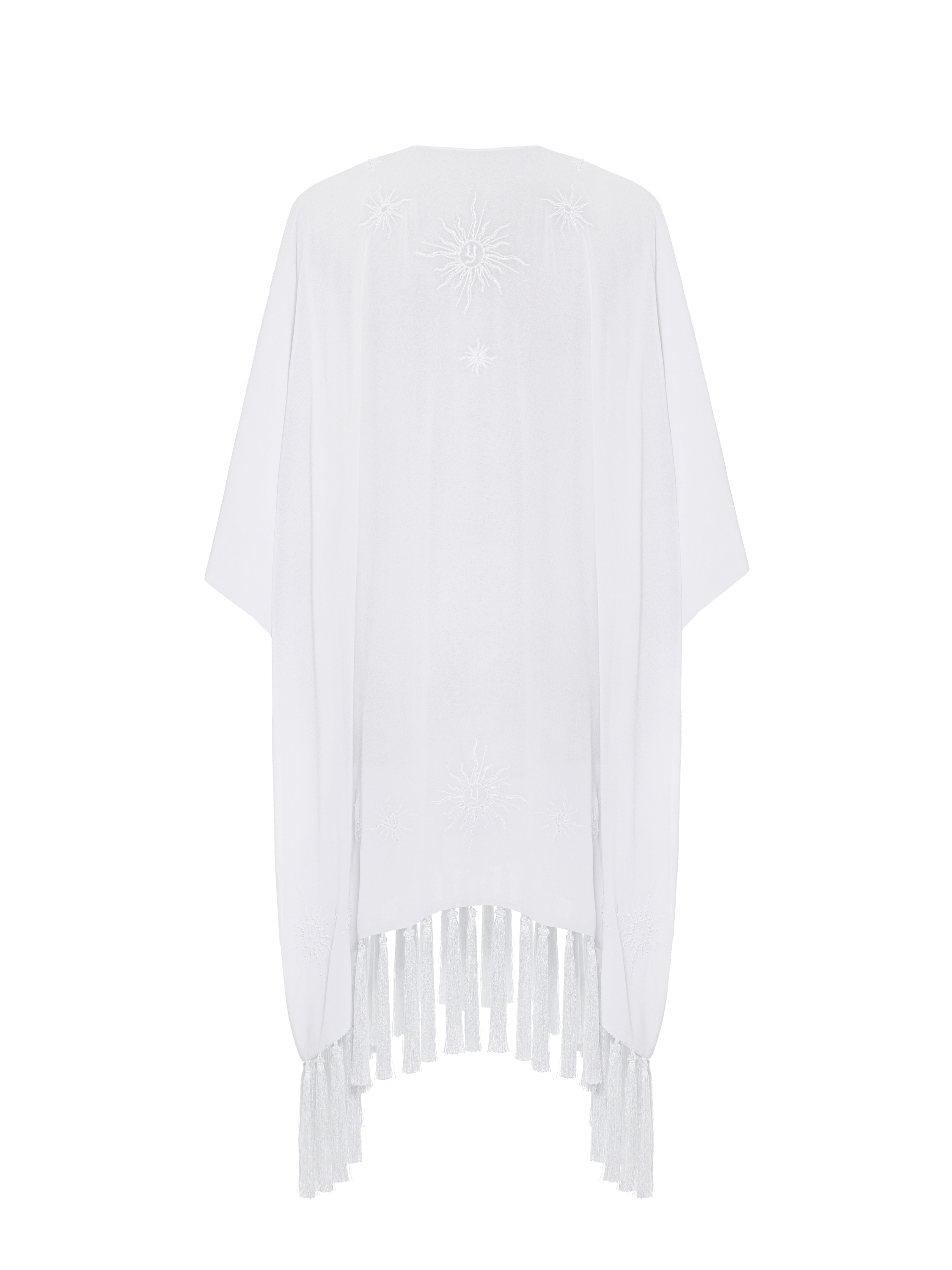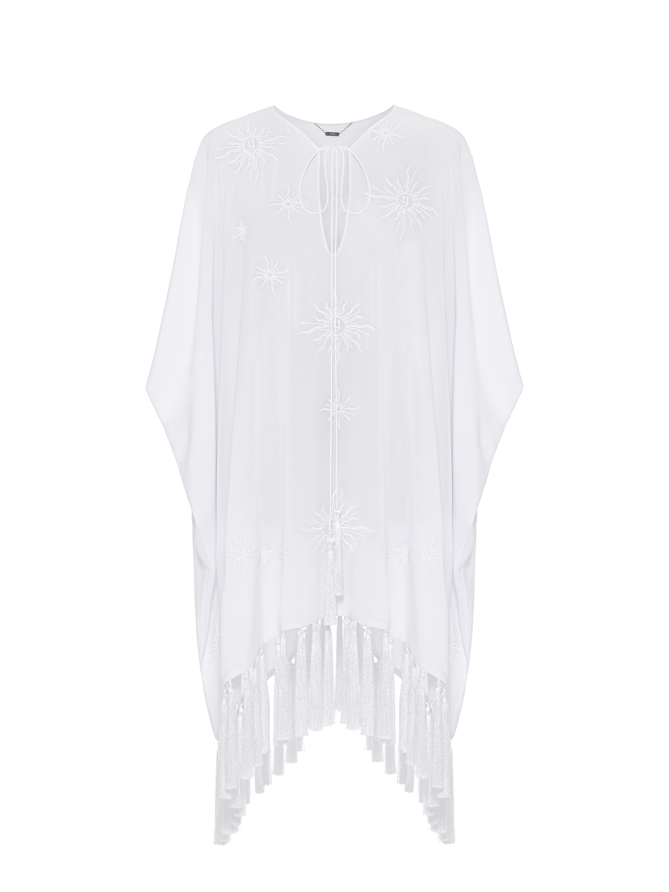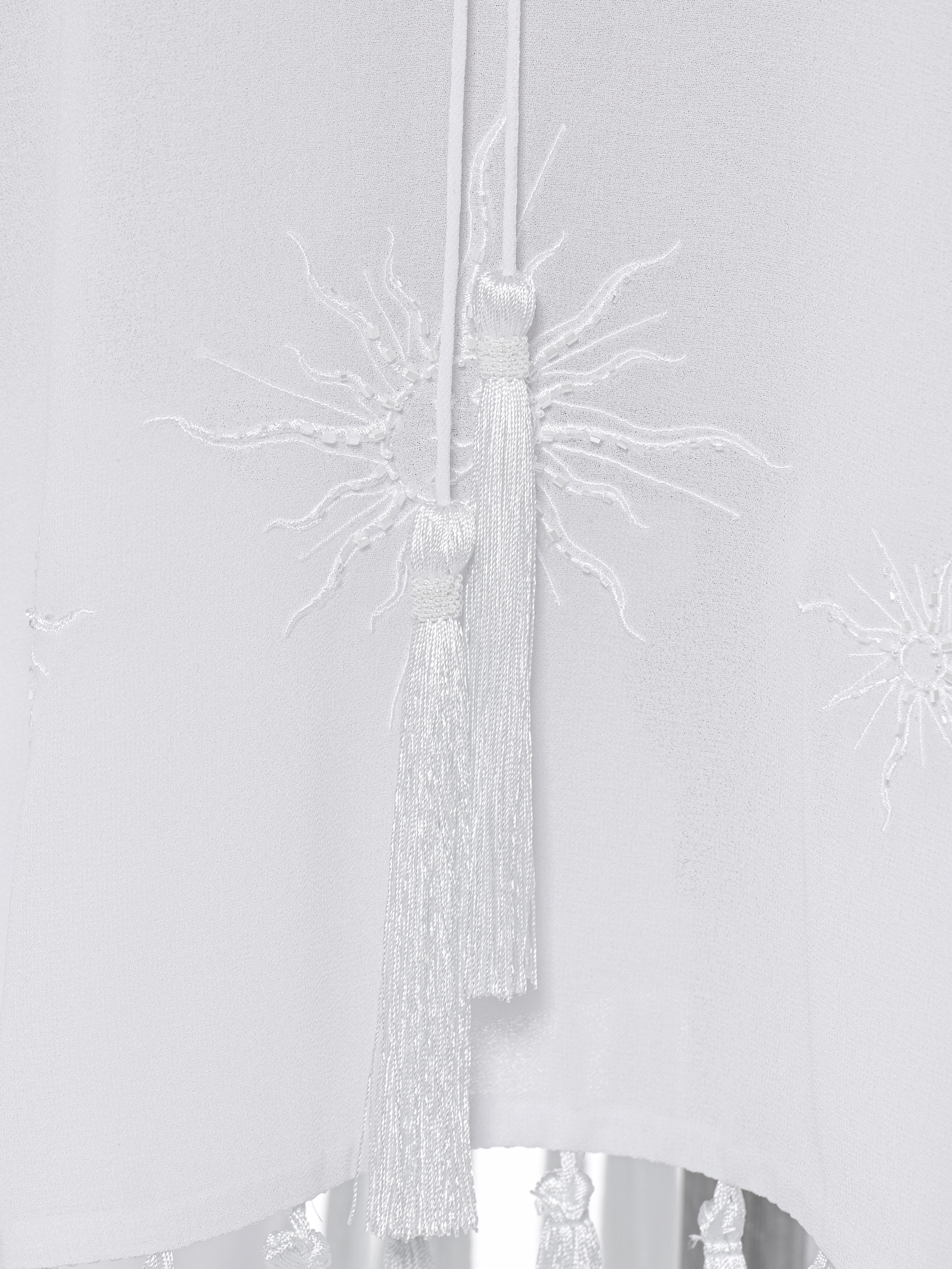 White tunic dress with a loose fit is made of light translucent chiffon. The model is complemented by a fringe of tassels to match the bottom and embroidery in the form of a sun, decorated with beads. Ties with tassels on the ches