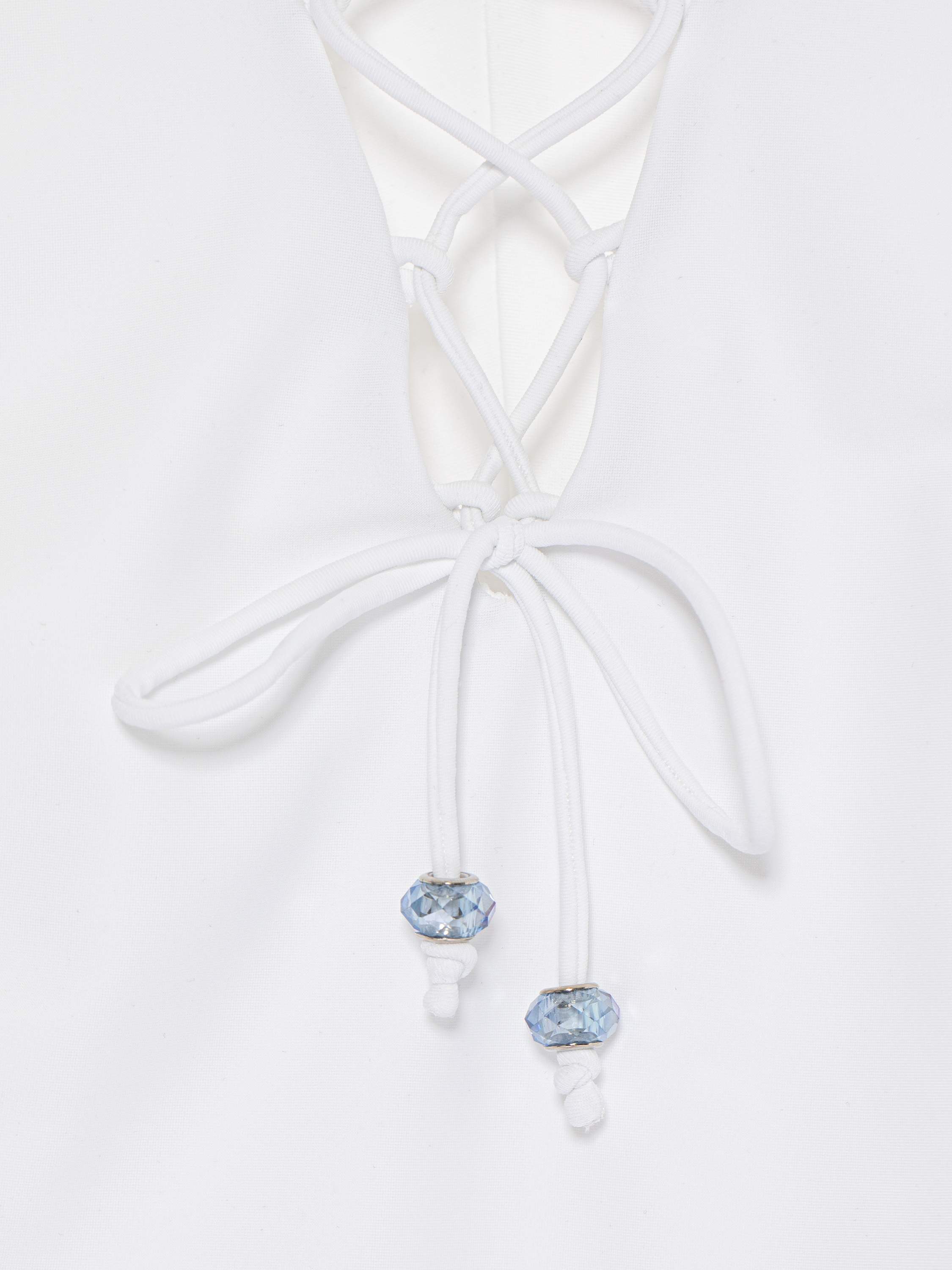 One-piece white swimsuit will help you stand out. The model was completed with decorative lacing with blue faceted beads on the chest and sides. It remains to put on striped flip-flops and your favorite straw hat from Yana Dress.