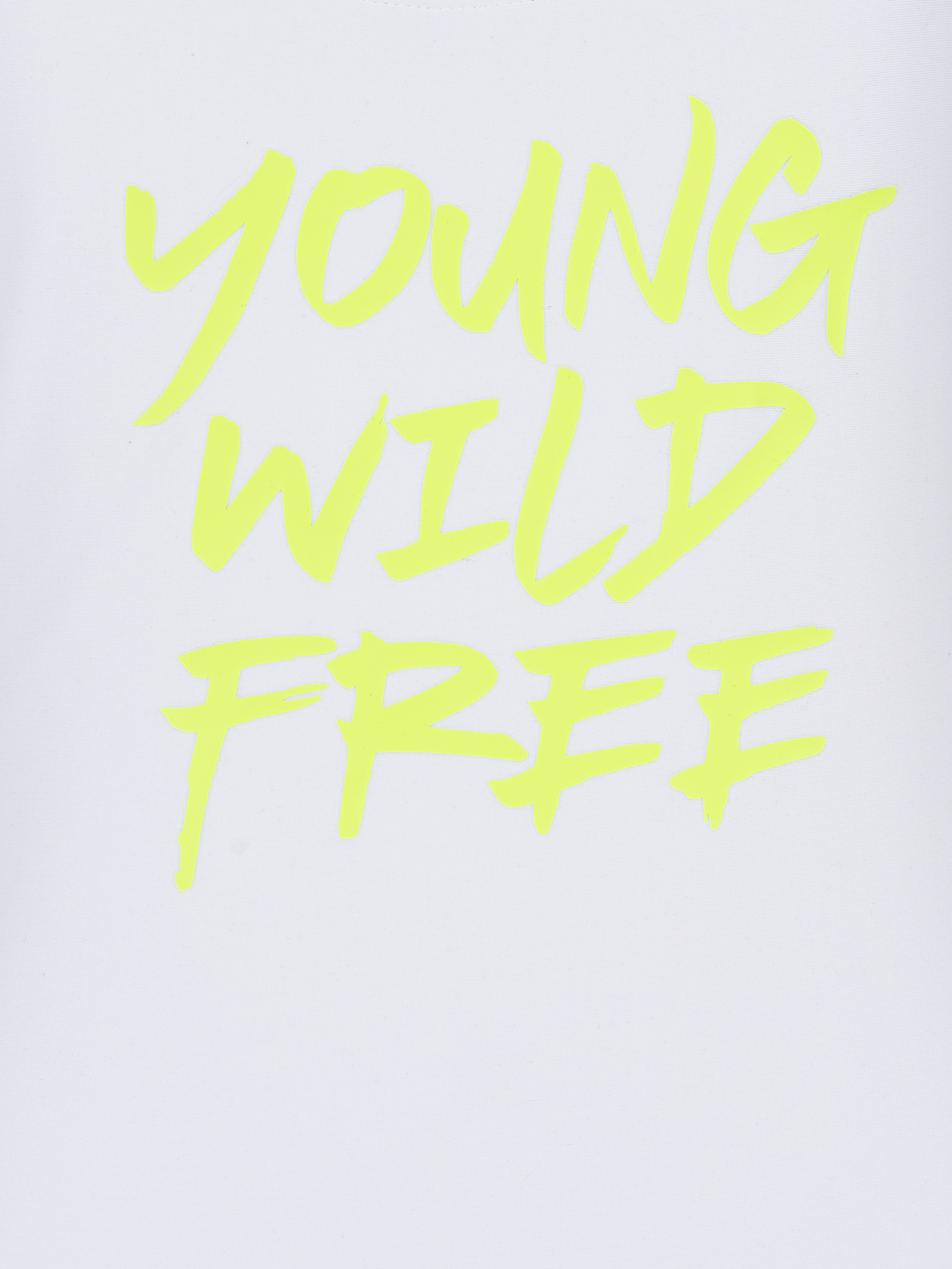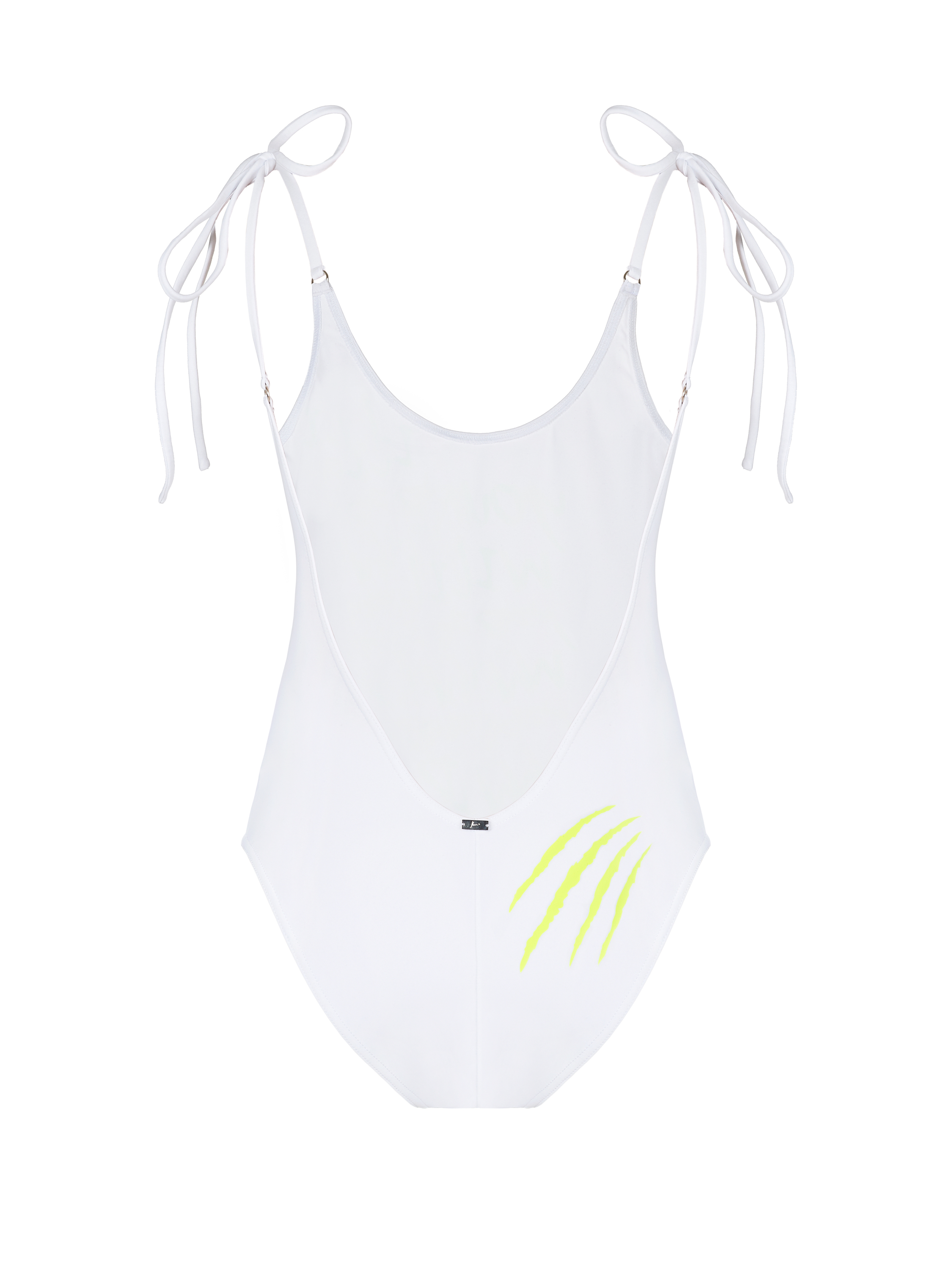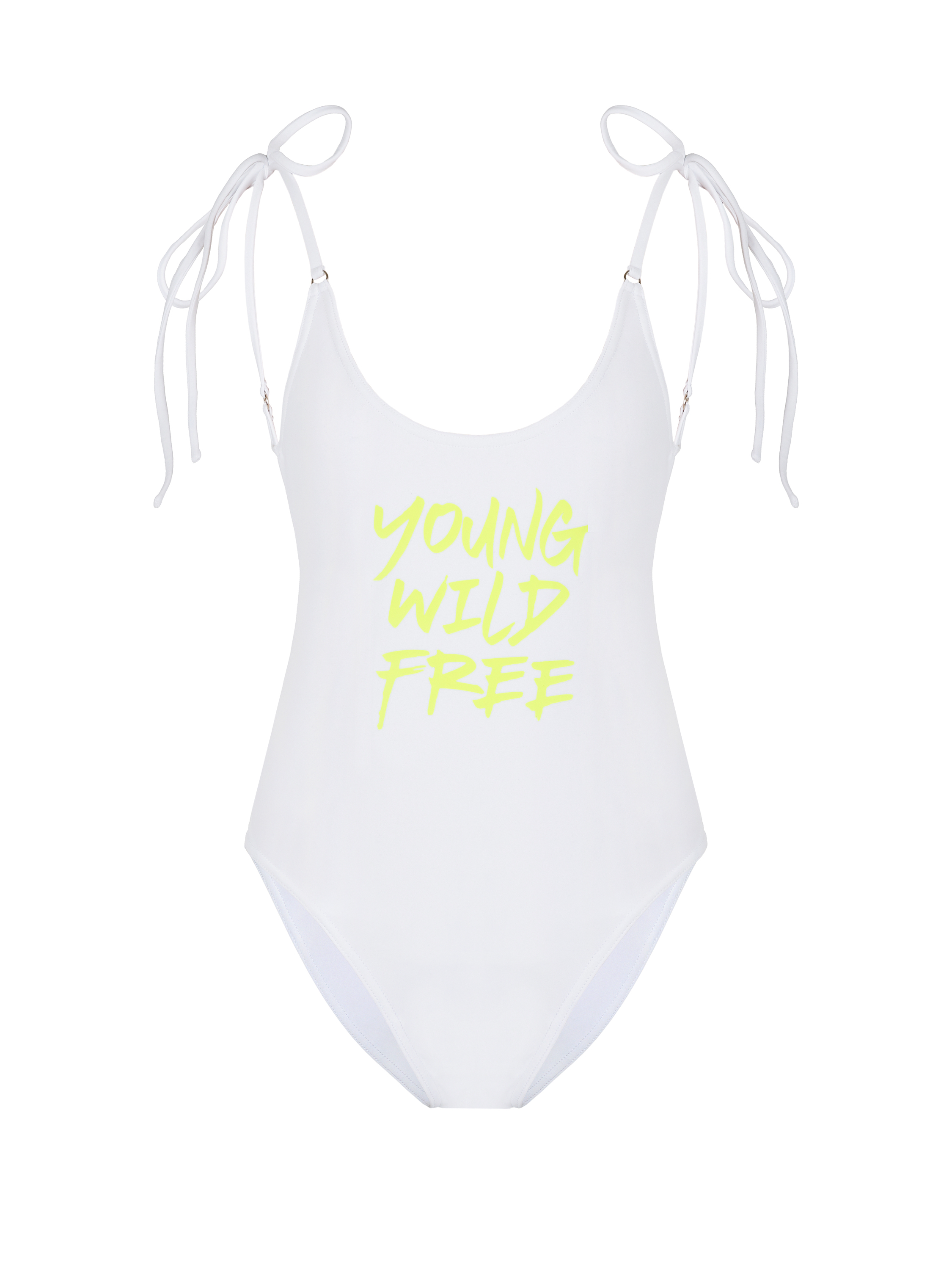 One-piece swimsuit in white color with a deep cut on the back and ties on the shoulders will allow you to demonstrate a toned silhouette and impeccable posture. The model was decorated with a neon yellow print "Young Wild Free".