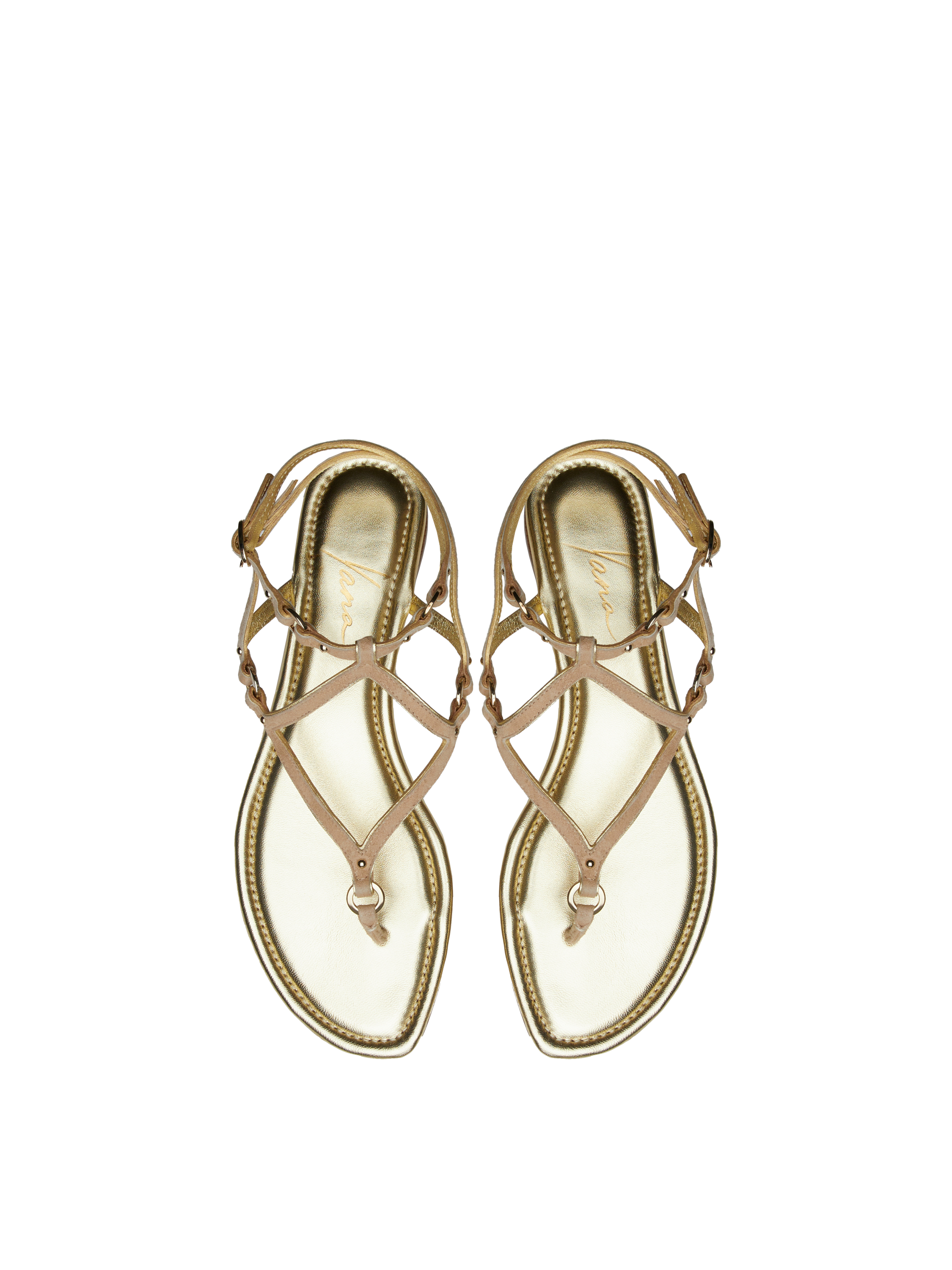 Flat-soled sandals with a bridge between the toes are made of natural suede in beige and gold colors. This shoe model is universally combined with dresses and with your favorite jeans from Yana Dress.
