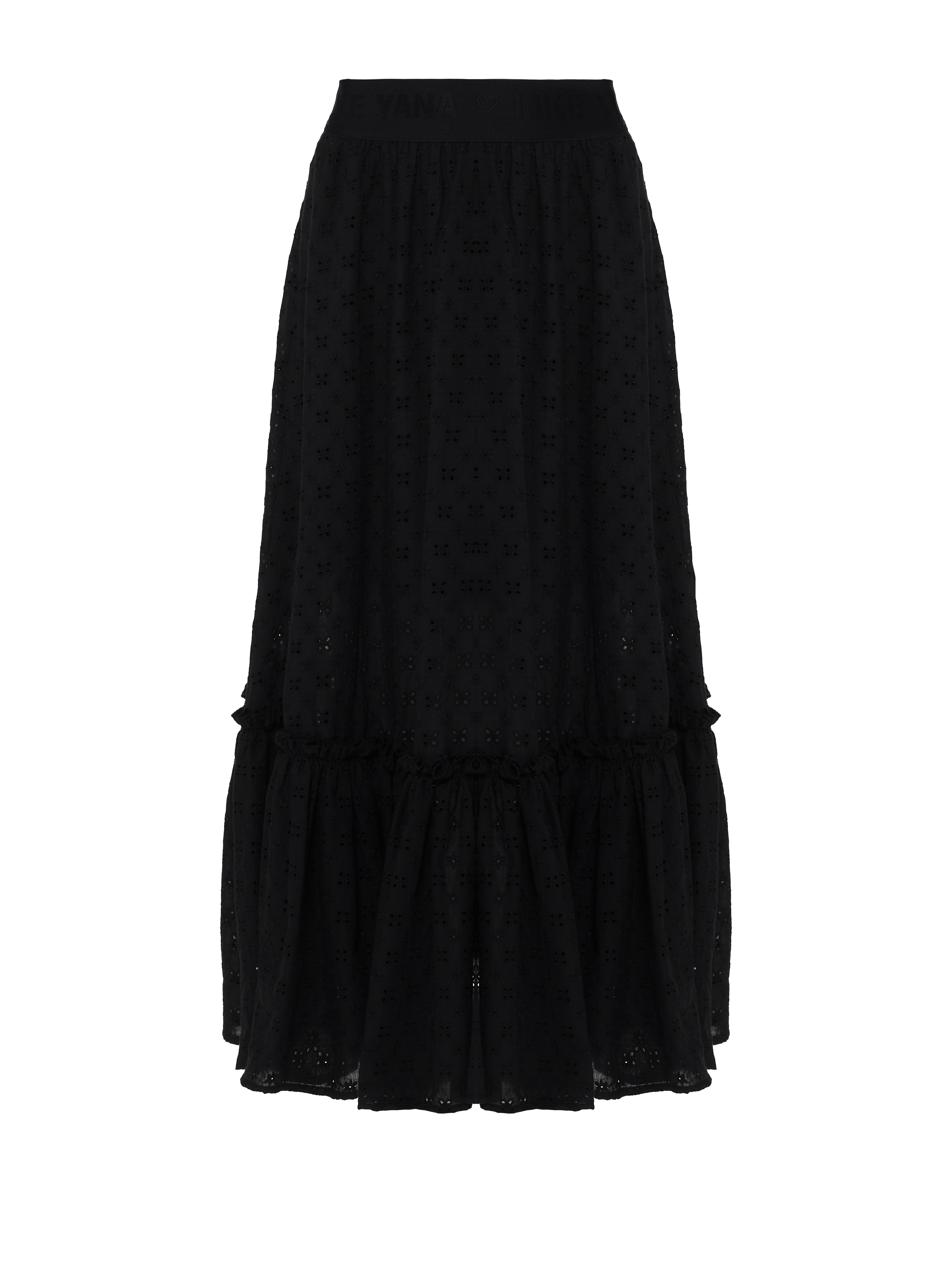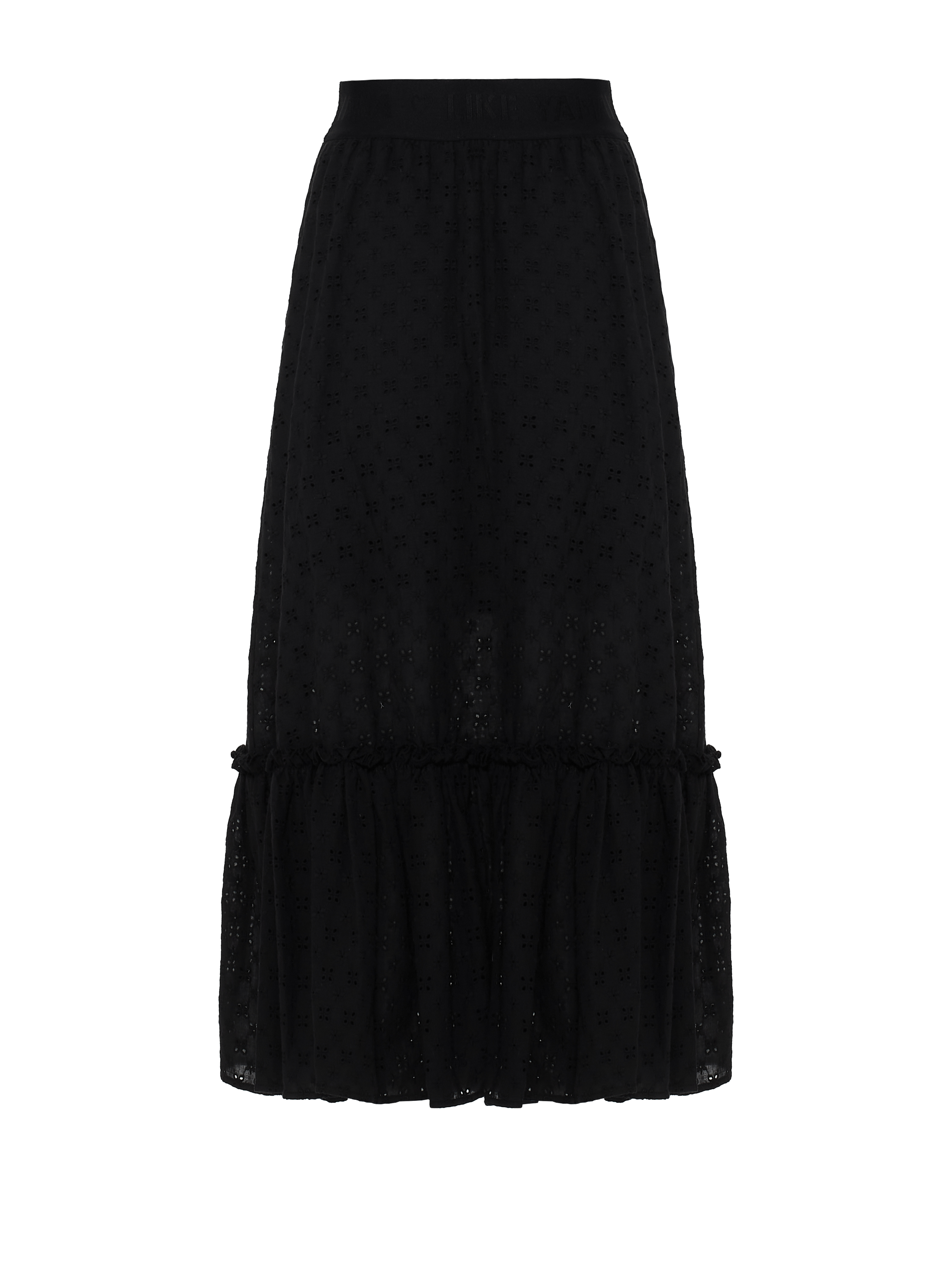 Black midi length skirt made of cotton lace. The model was completed with a cut-off flounce at the bottom and a wide elastic waistband with the brand's logo, which gently fits the waist. Wear with cropped blouses or tops.