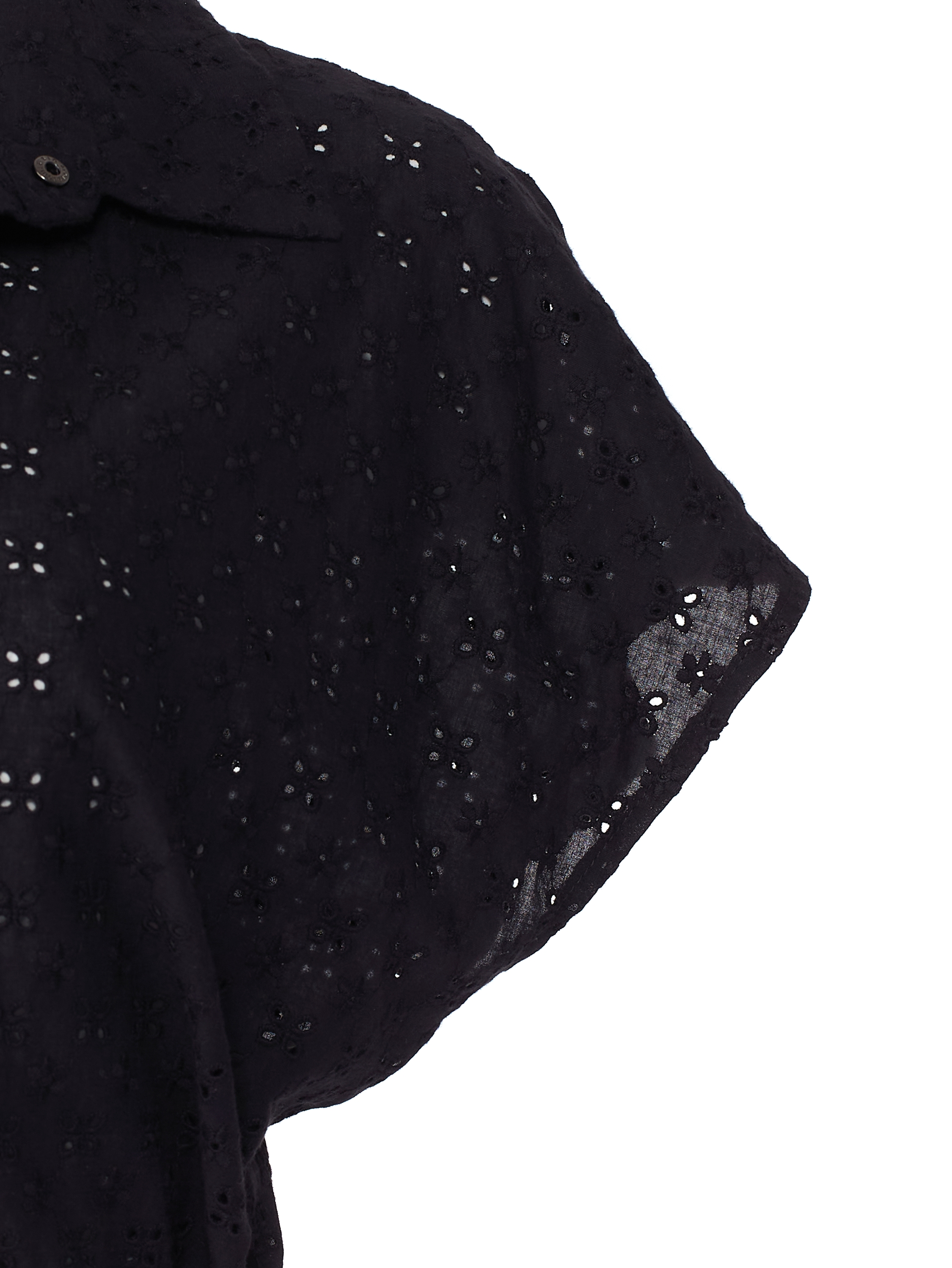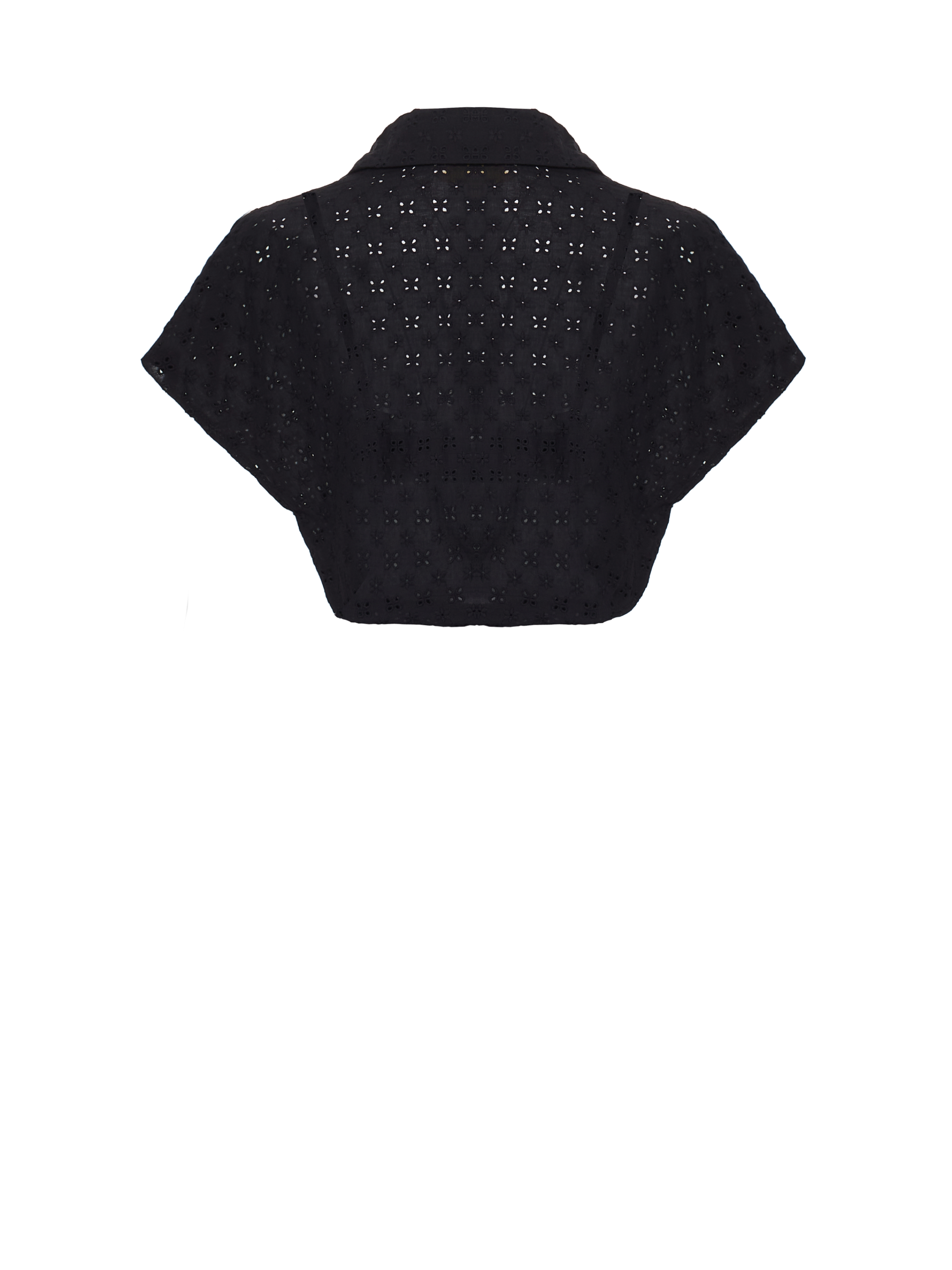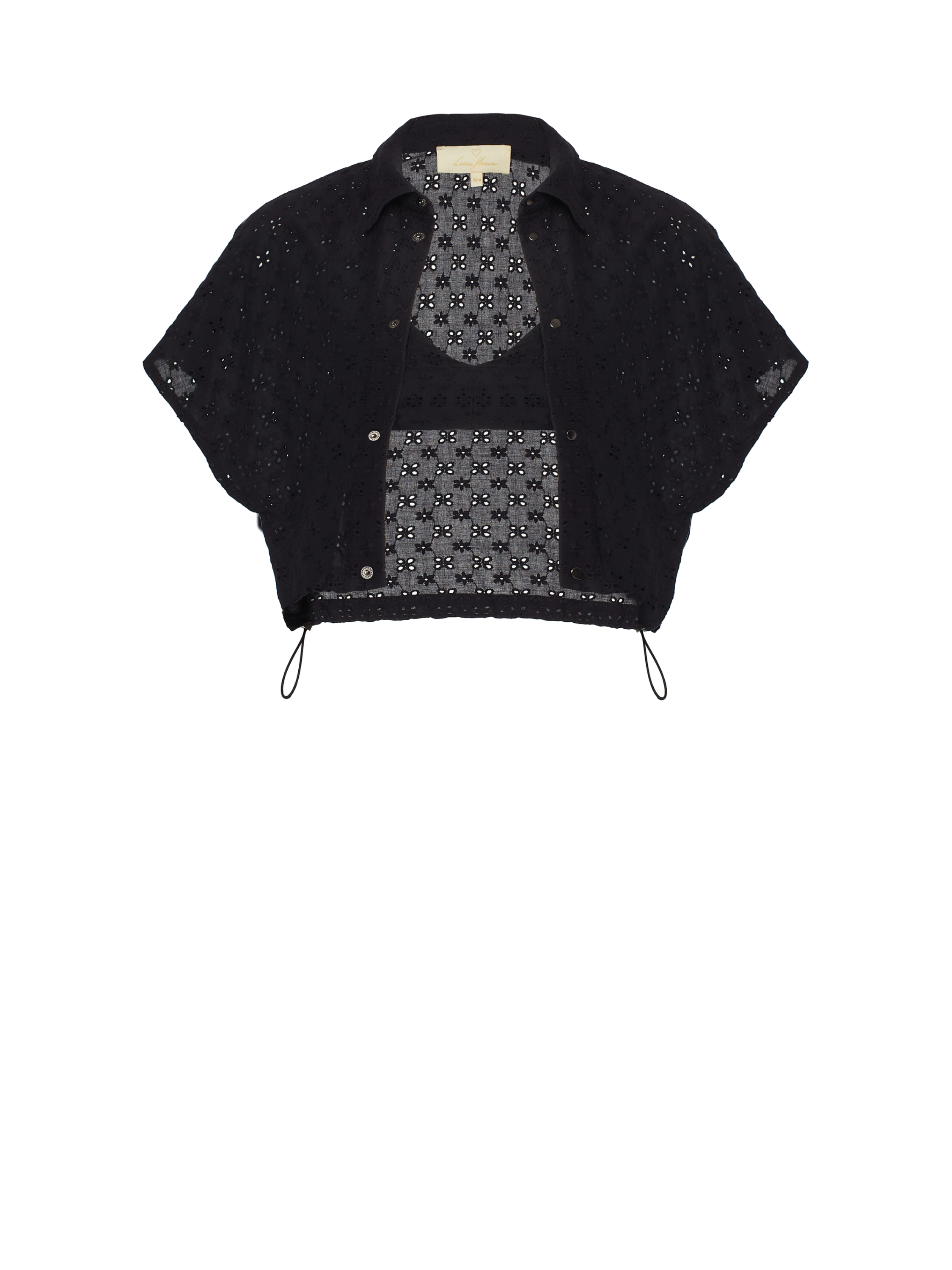 The set of a short-sleeve shirt with a puff at the bottom and a bra top with straps is made of black cotton lace. Wear with high-rise skirts made of the same material.