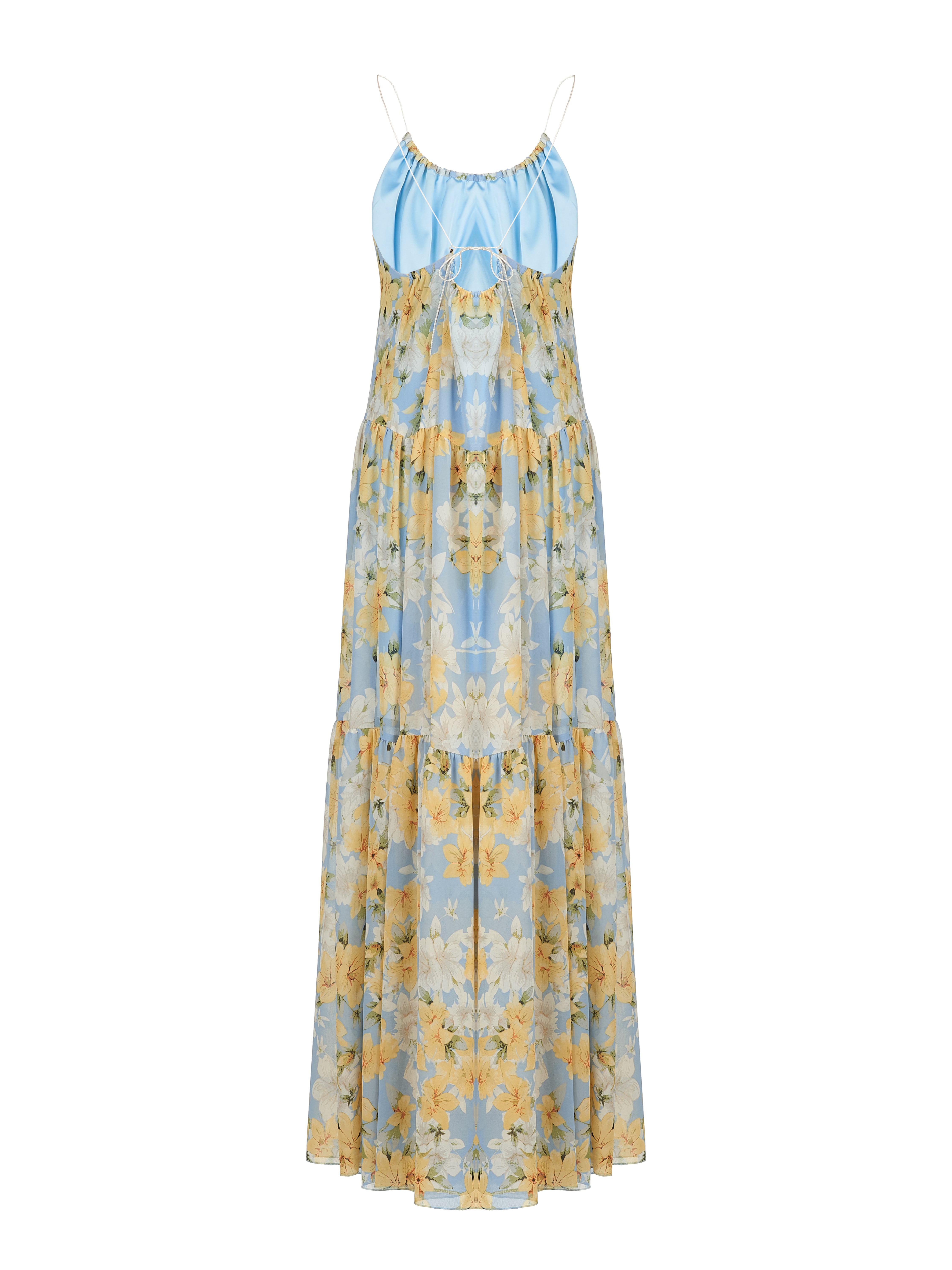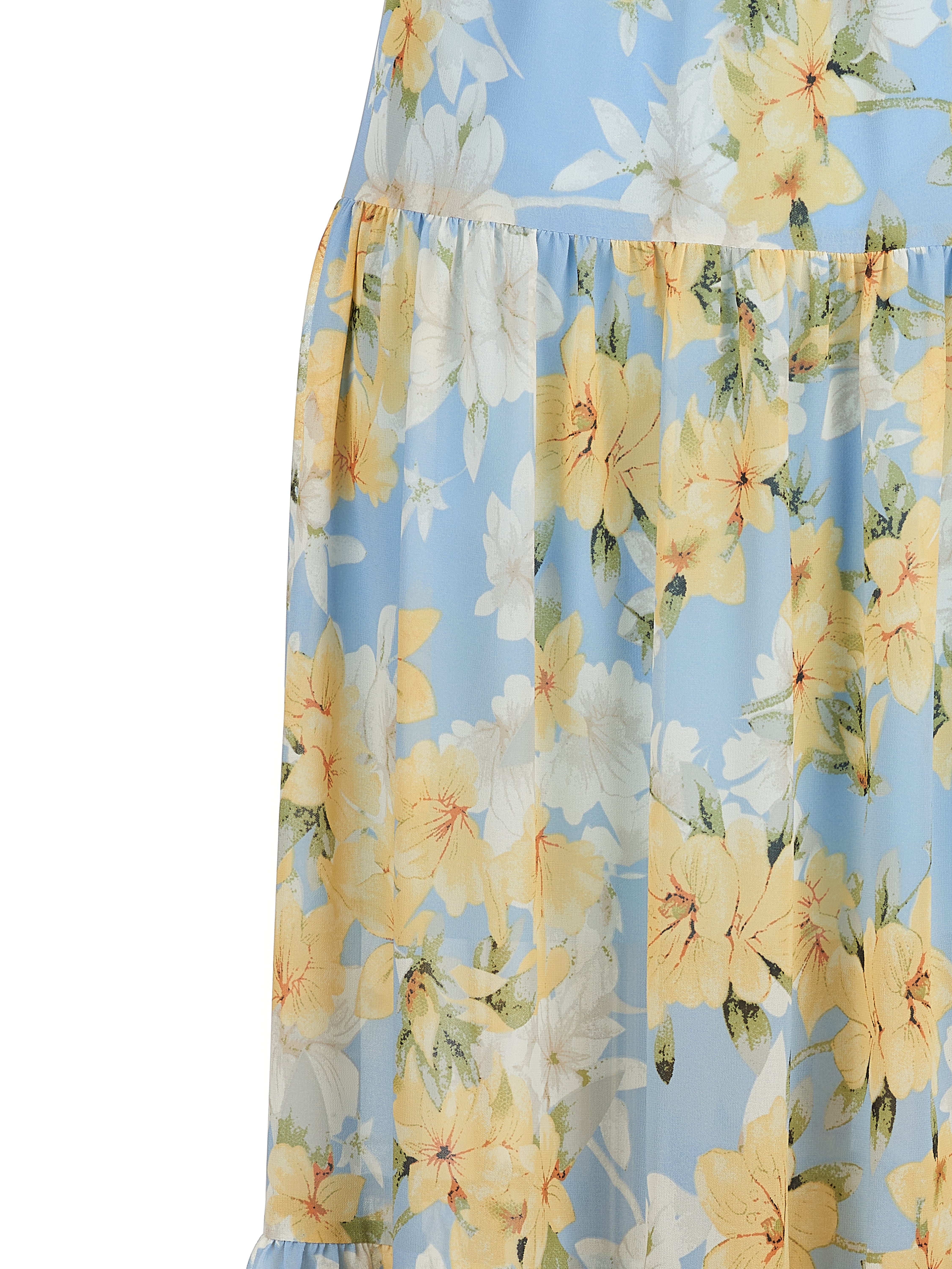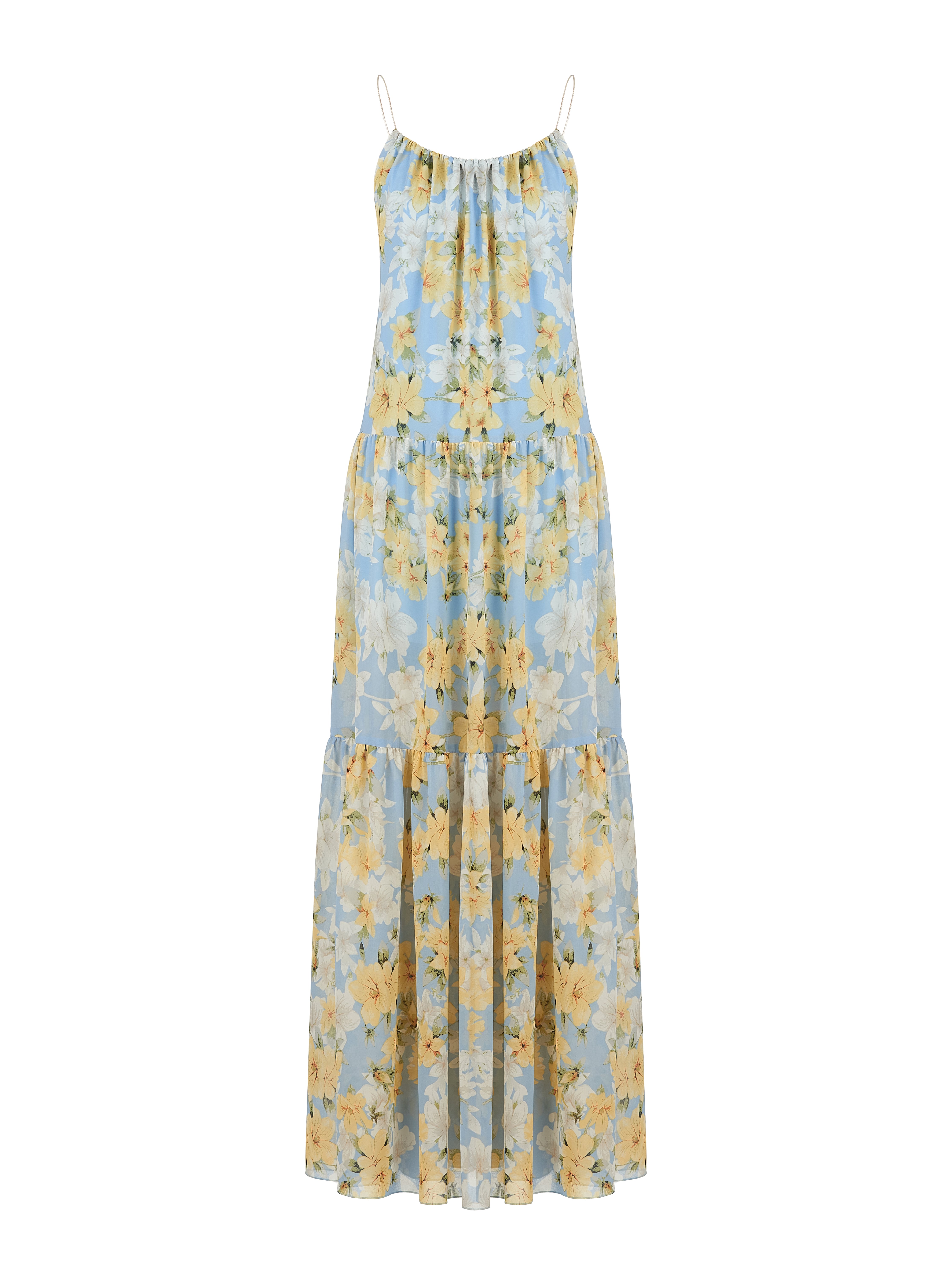 Blue maxi dress with thin straps and ties at the back is perfect for hot weather. Romance, set by a yellow floral motif and a flared hem in two tiers, is supported by the choice of material: light chiffon forms soft folds and effectively flows in motion.