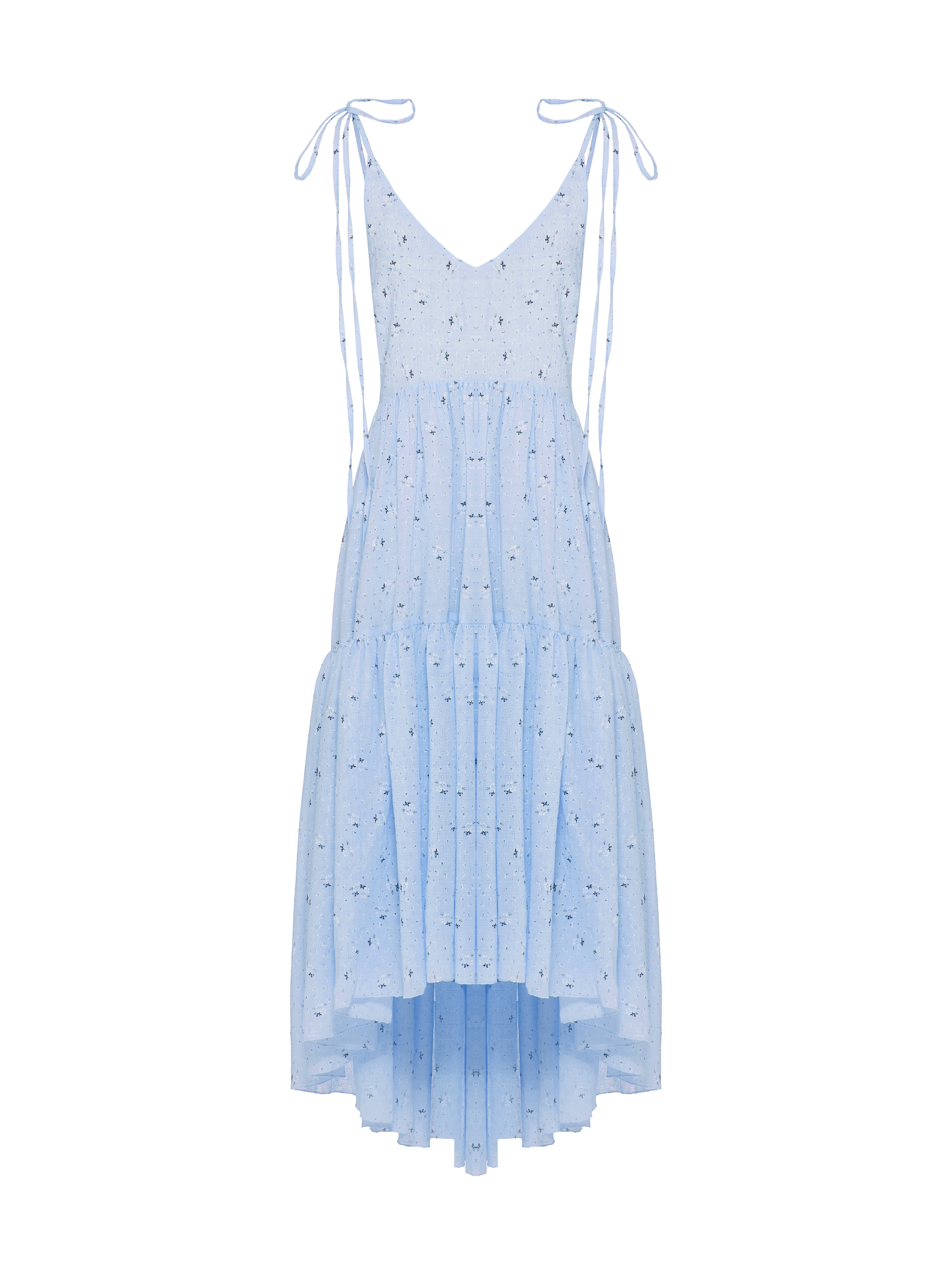 Light blue sundress with a floral print will be a great addition to your summer wardrobe. The wide-cut model with drawstrings does not restrict movement, the hem in two tiers is shortened in front, the open back is V-shaped.