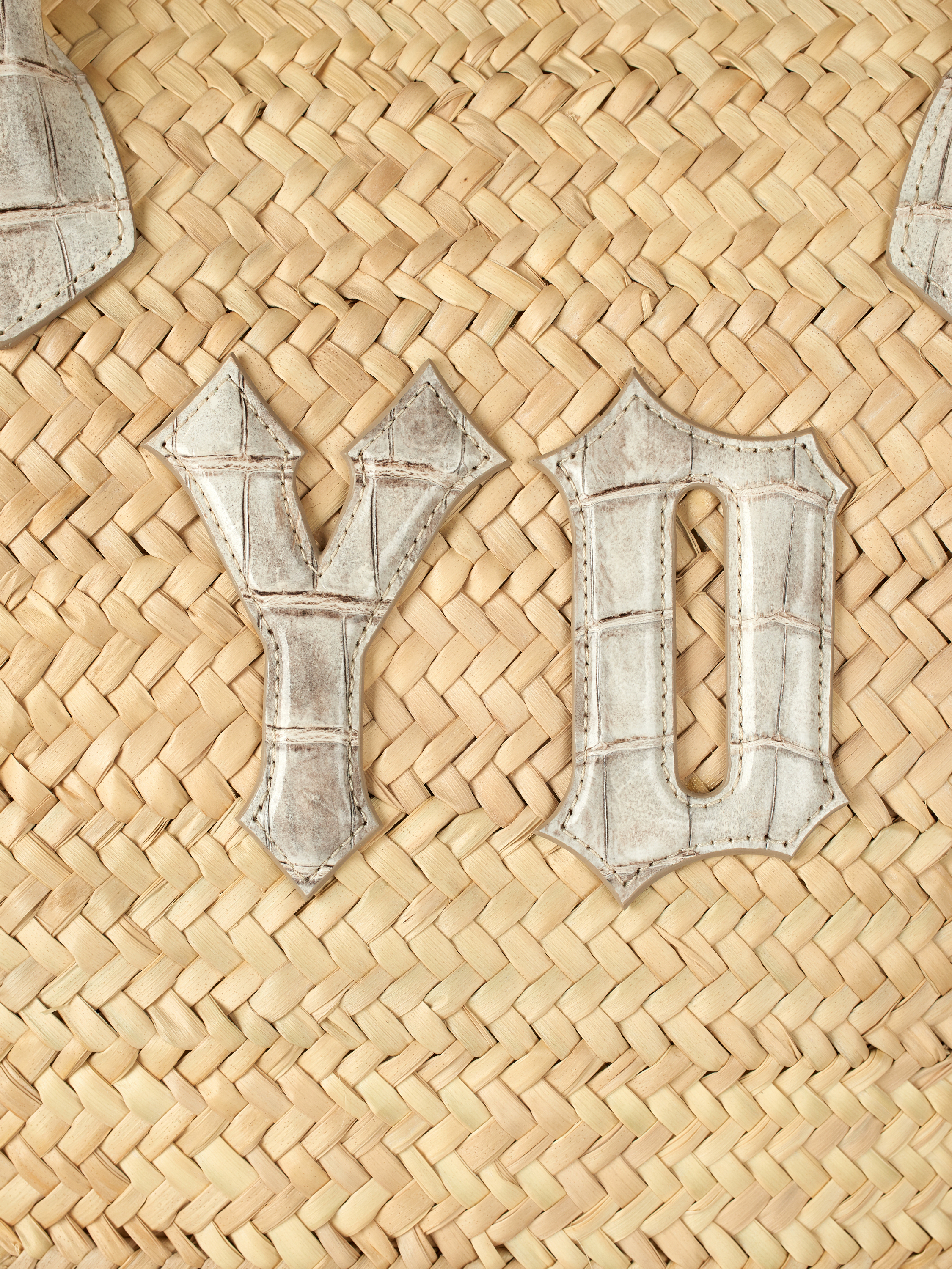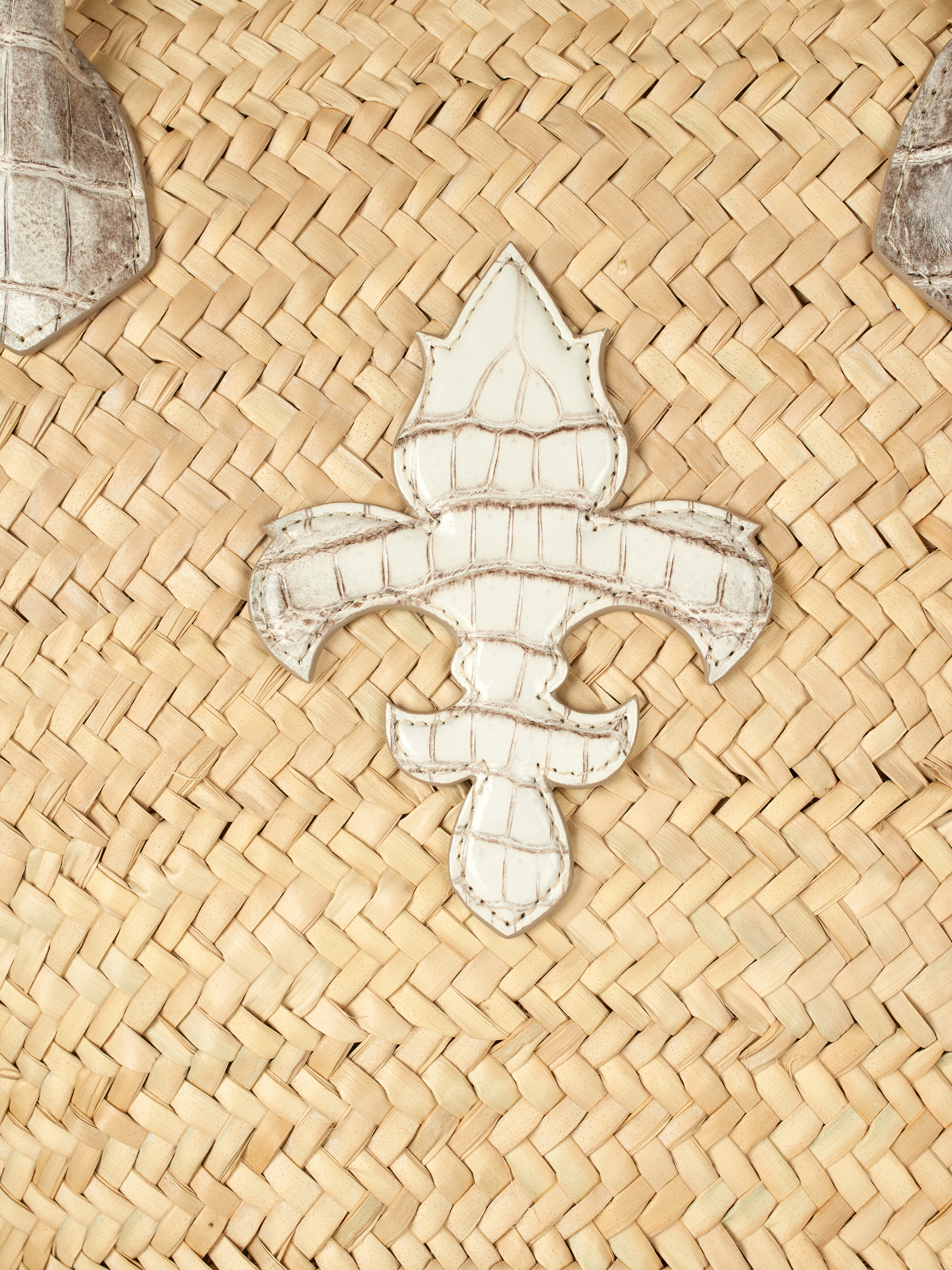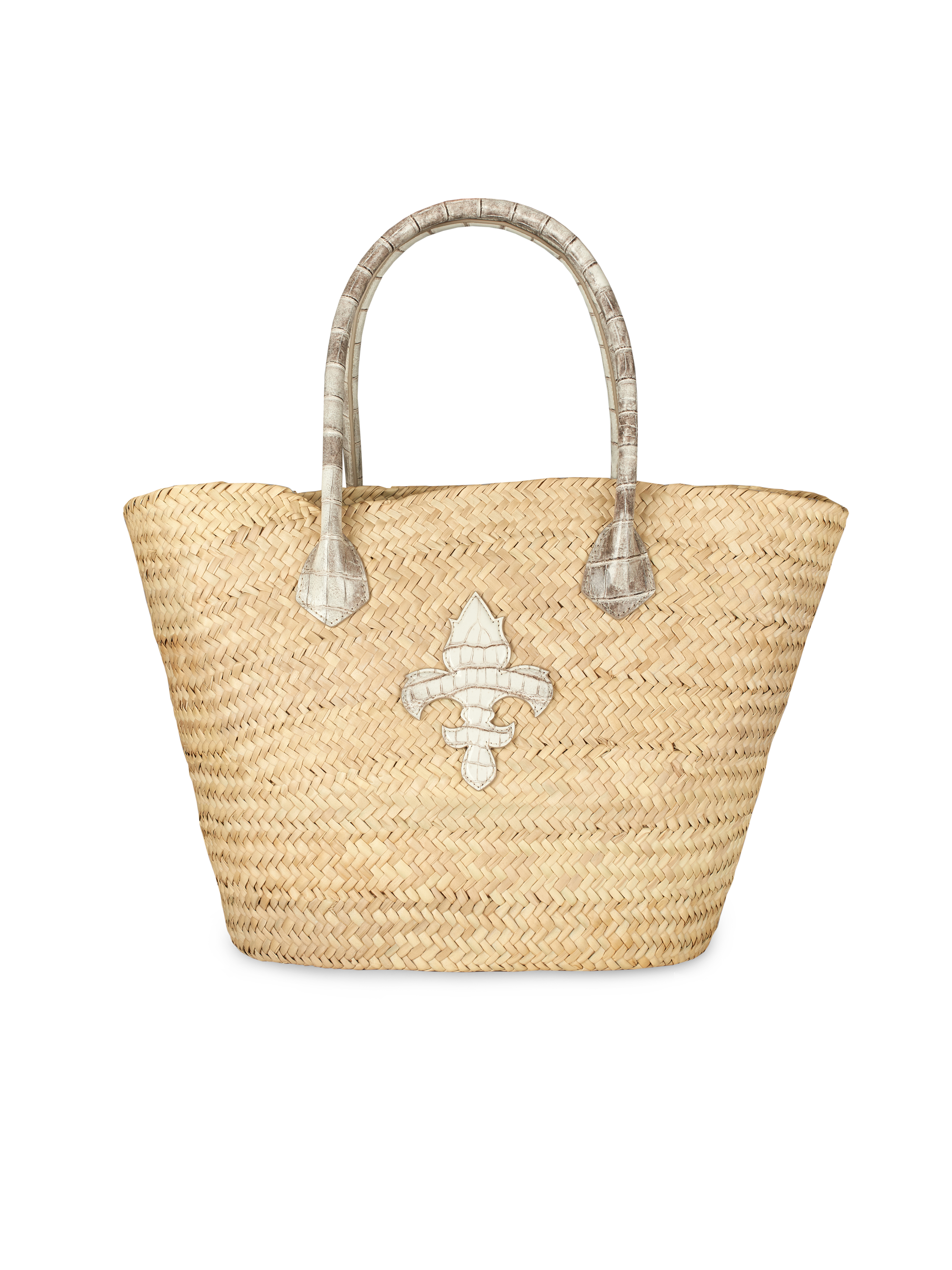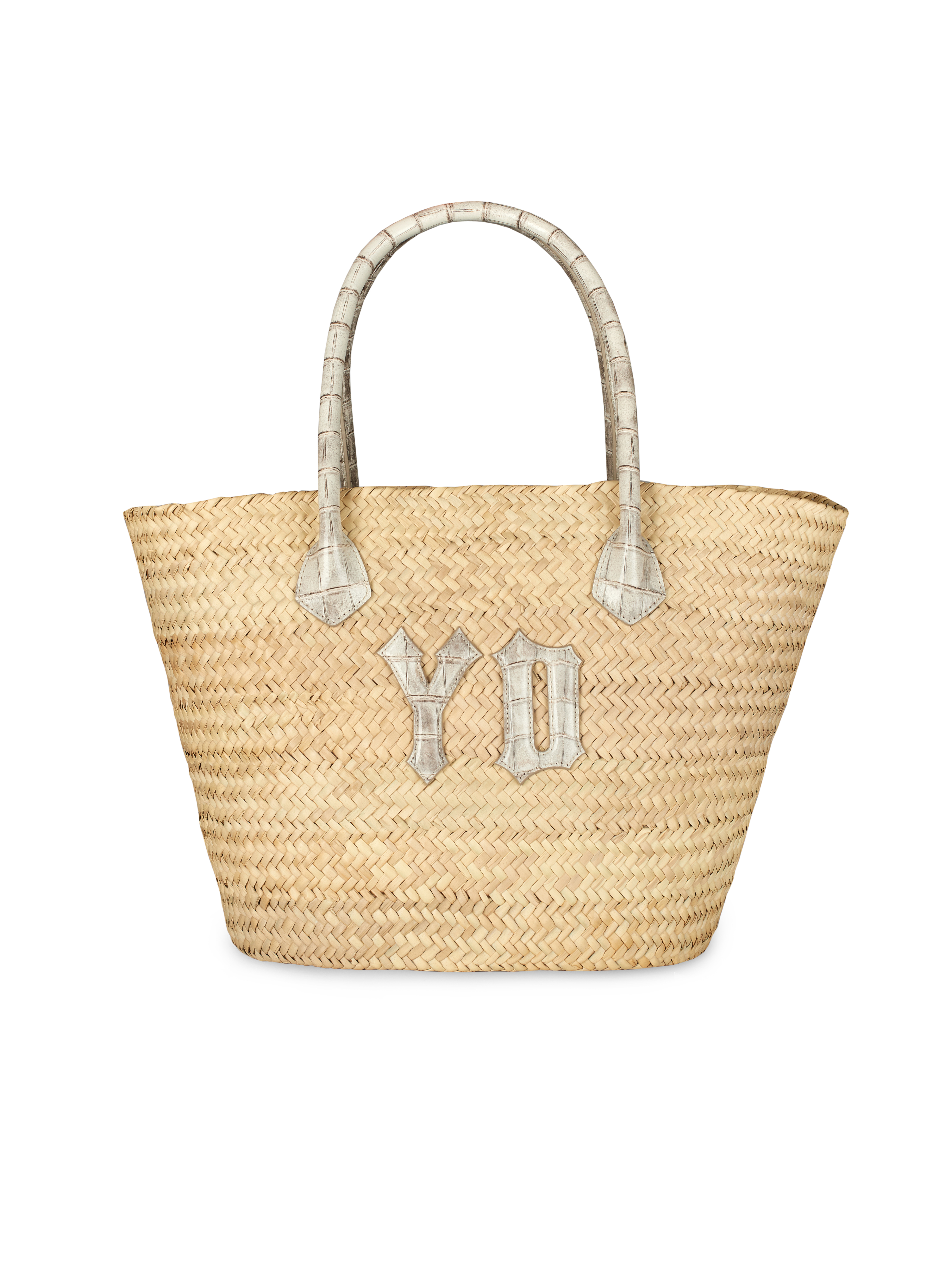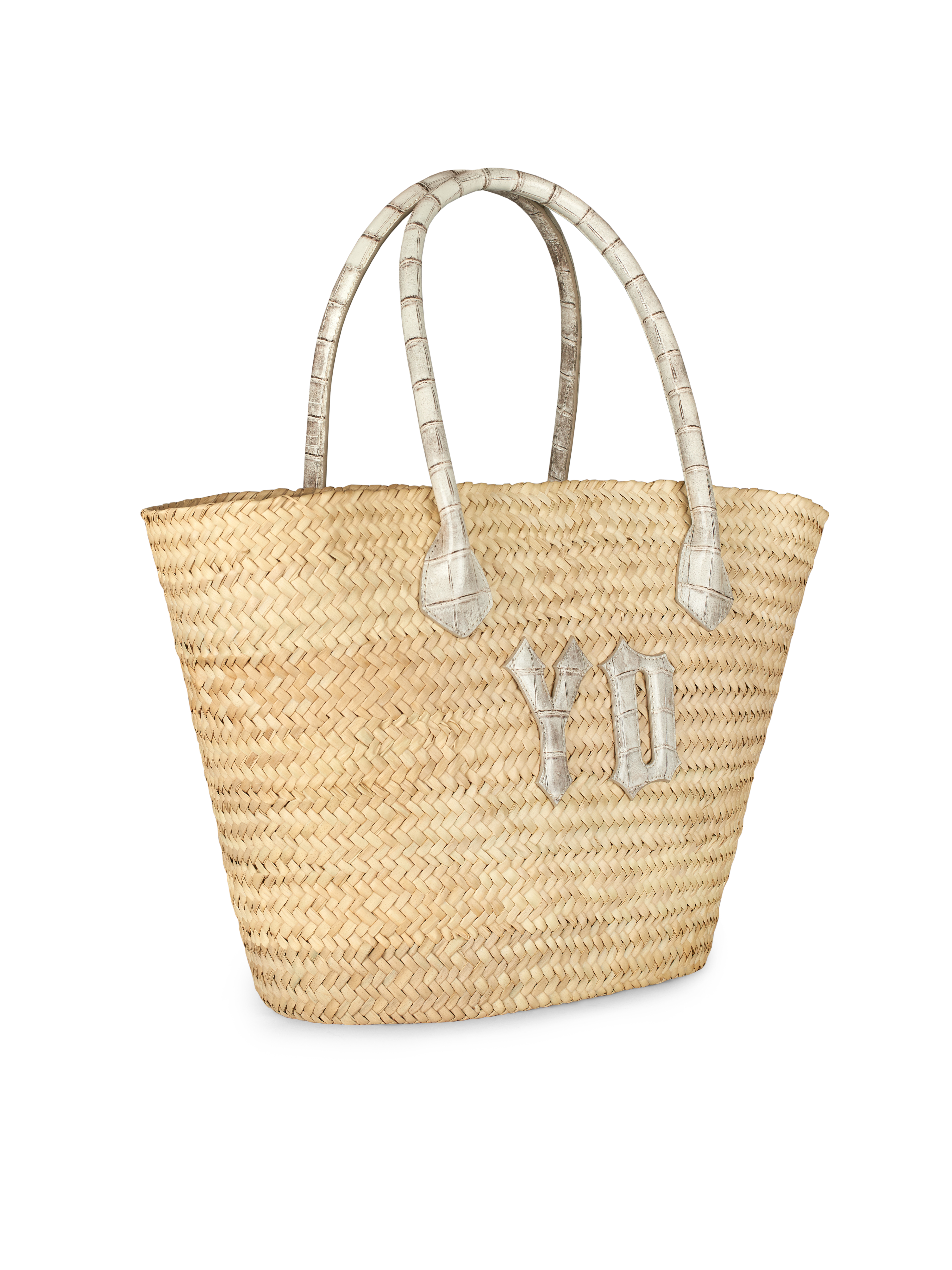 Beige straw tote bag with white trim made of Himalayan crocodile skin with a heraldic lily and the abbreviation Yana Dress. As the main compartment inside, there is a bag that is tightened with a drawstring.