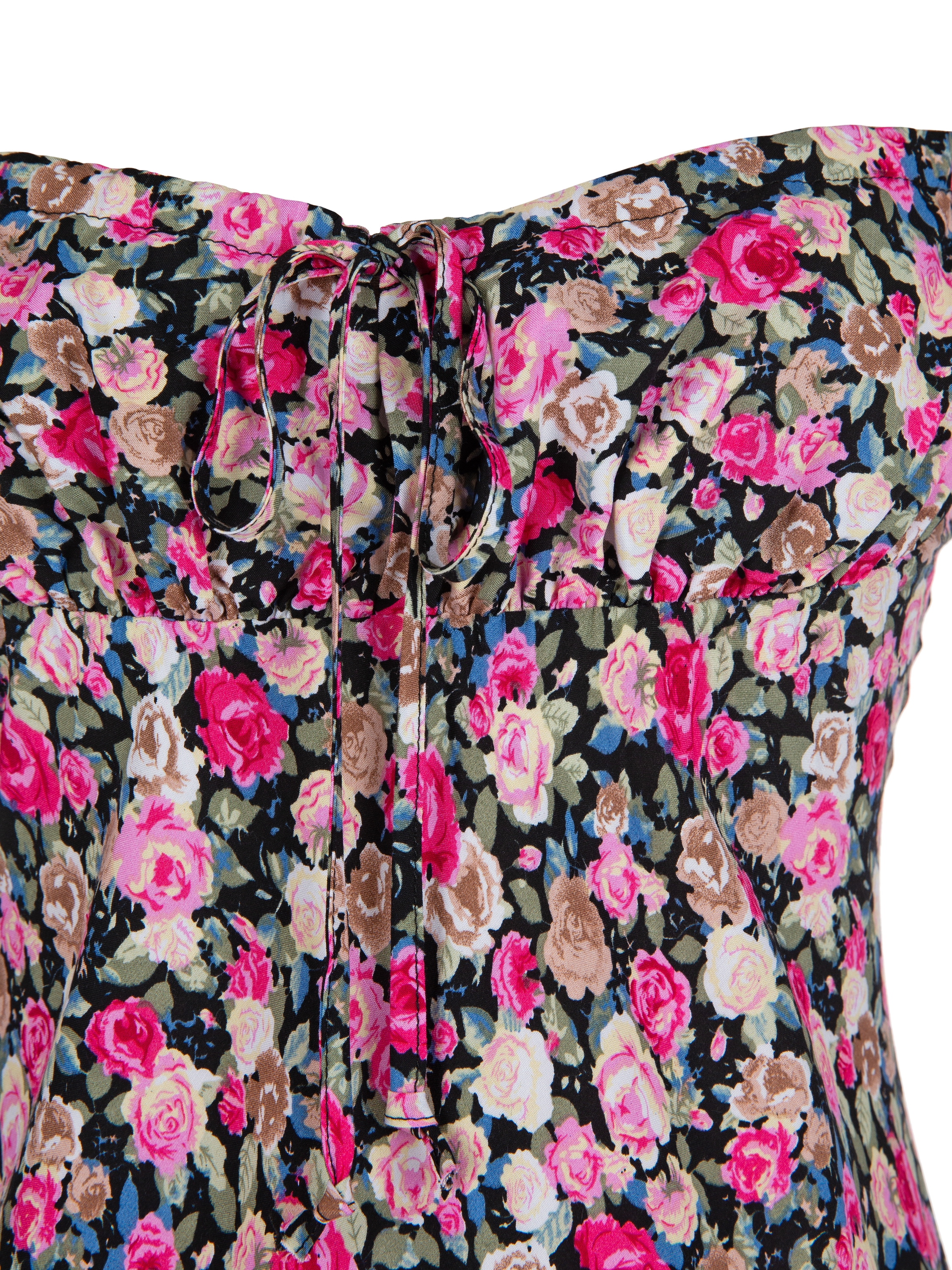 Pinstripe midi dress with floral print turned out to be especially feminine. It's all about the ties that create soft pleats on the bodice. The dress was made of viscose and added a lace braid at the hem.