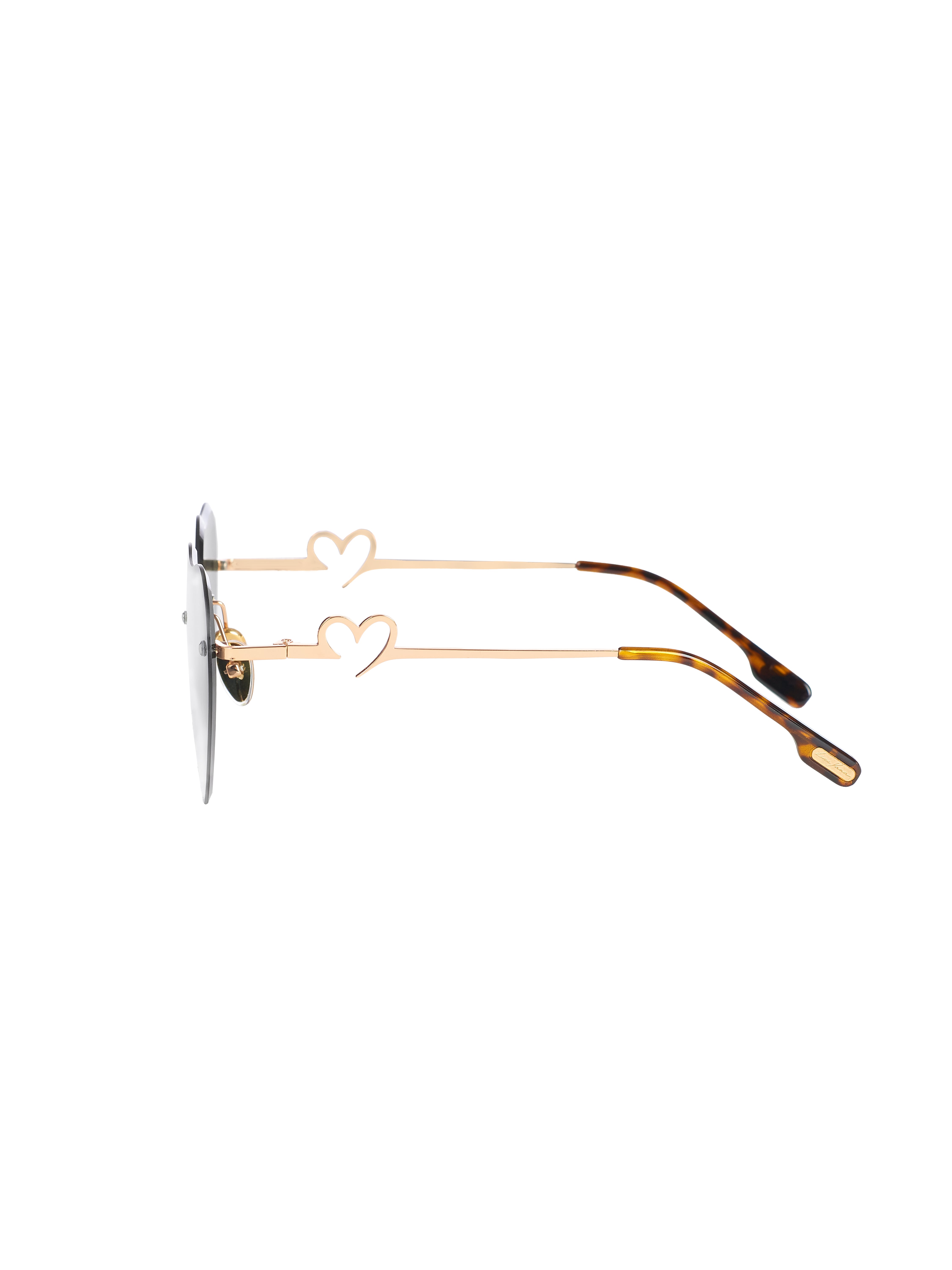 Sunglasses Like Yana with khaki gradient lenses in the shape of hearts in a gold metal frame with hearts on the temples.