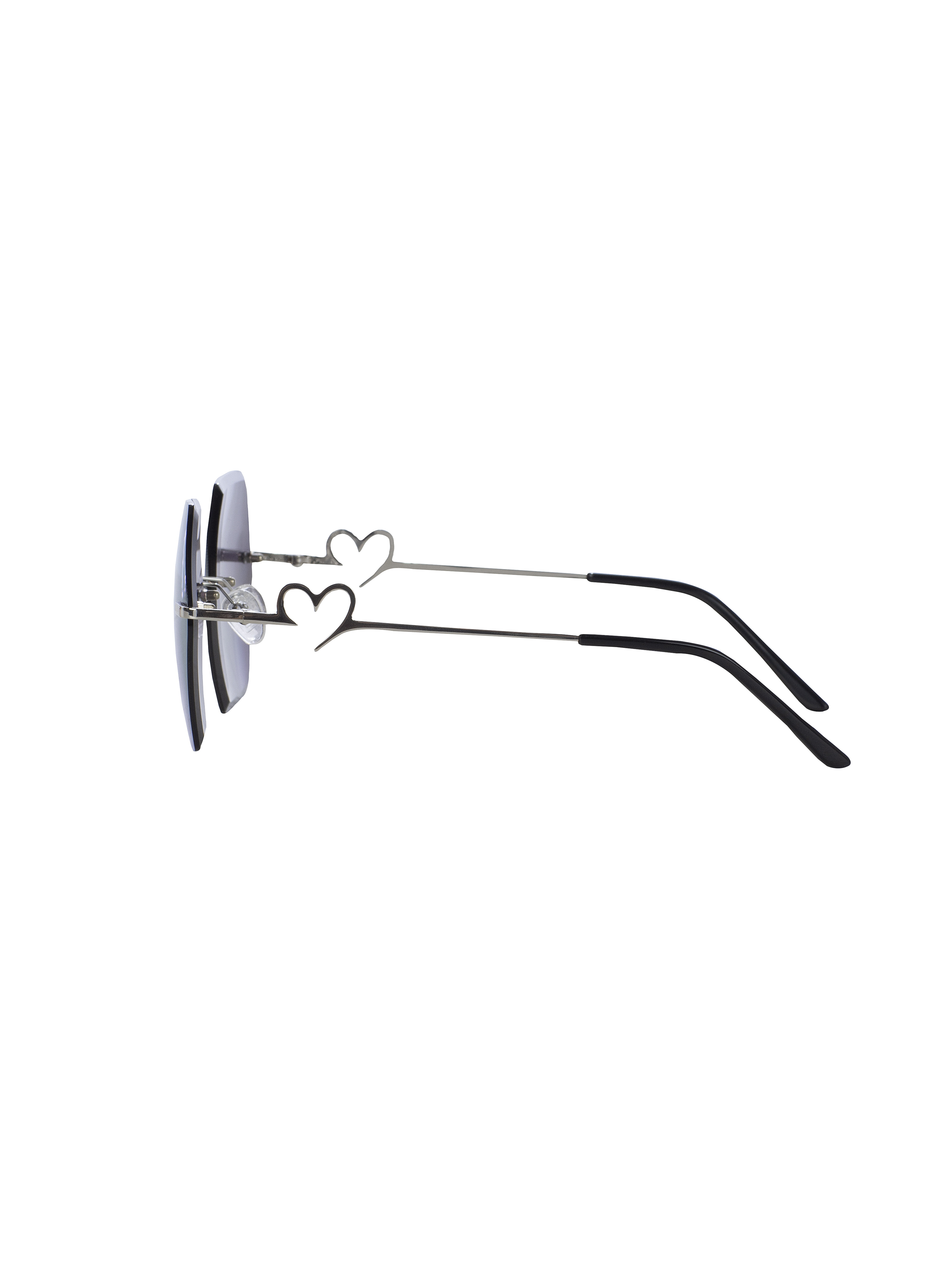 Sunglasses with mirrored lenses in the shape of hexagons in a silver metal frame with hearts on the arms.