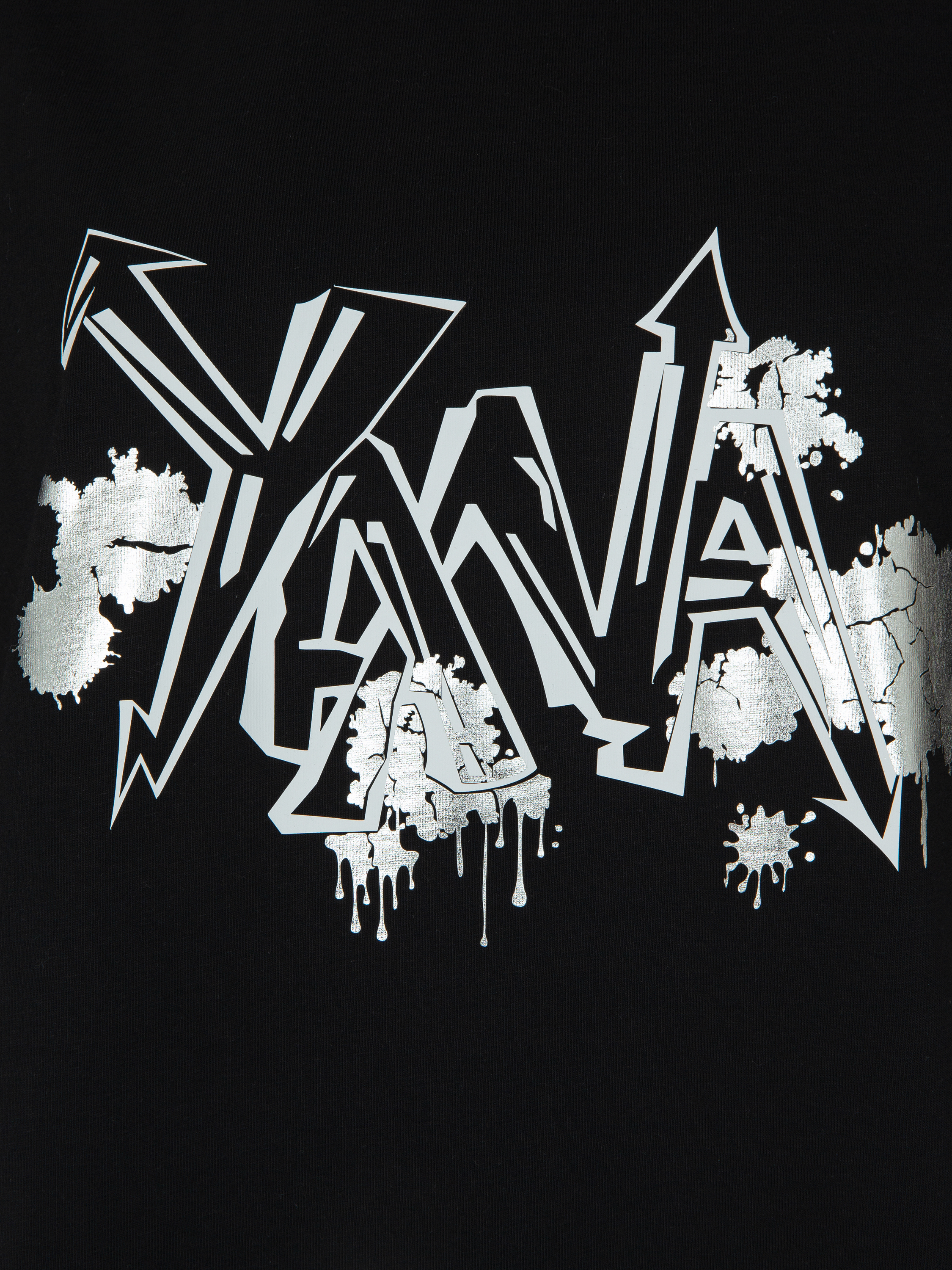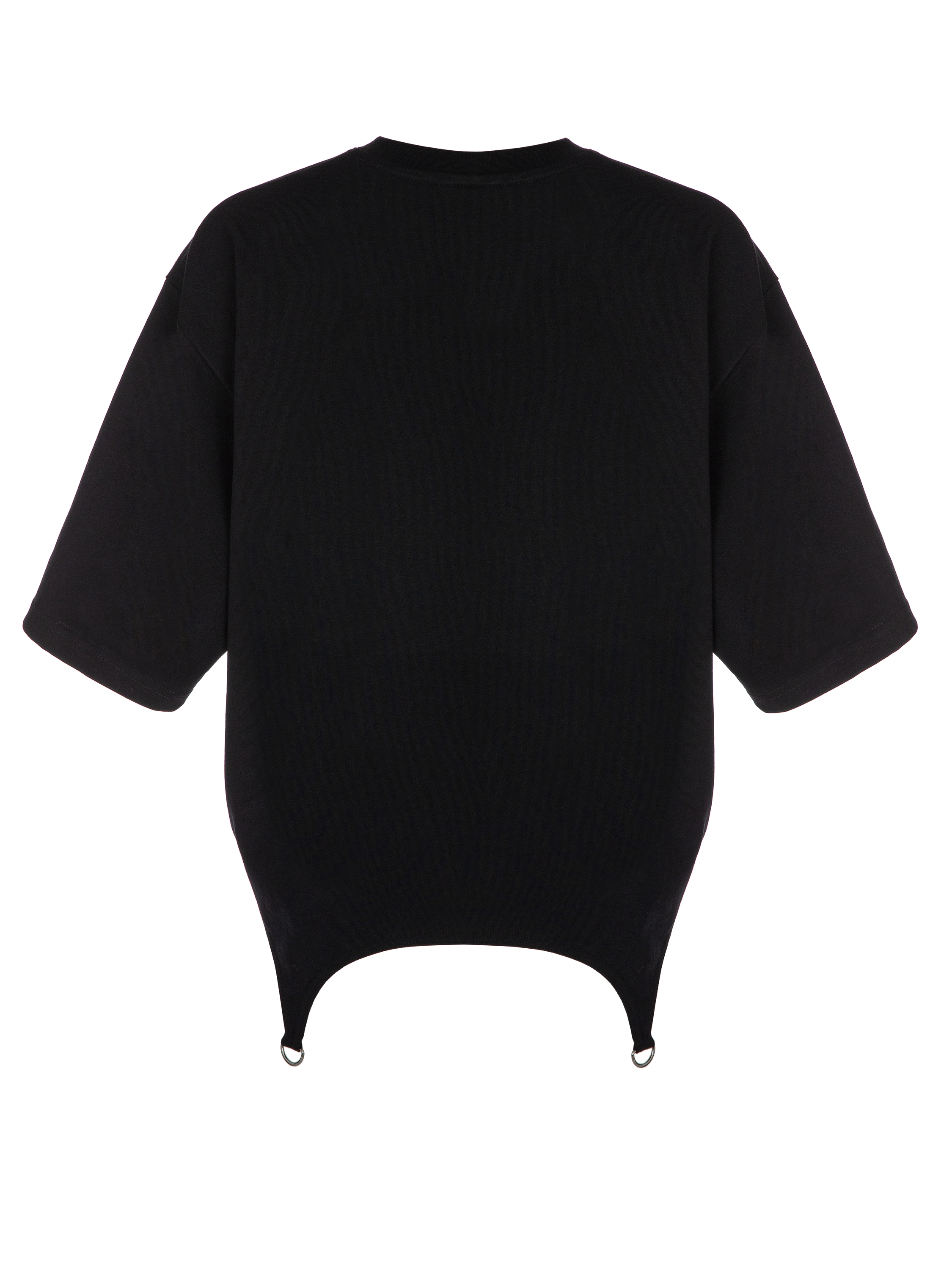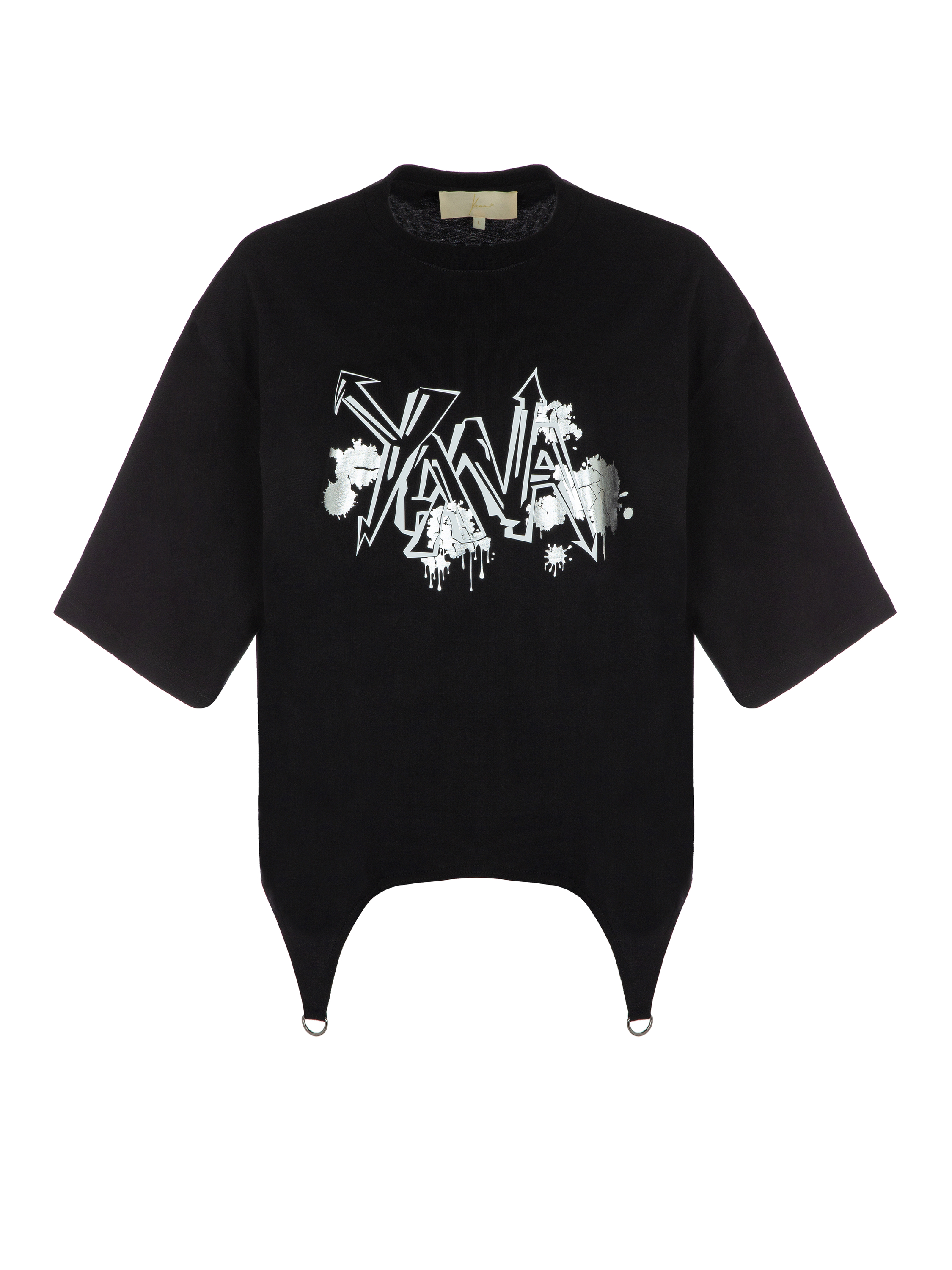 Black T-shirt with a loose fit with the inscription "Yana" is made of natural cotton. The model was supplemented with a curved bottom with metal fittings.