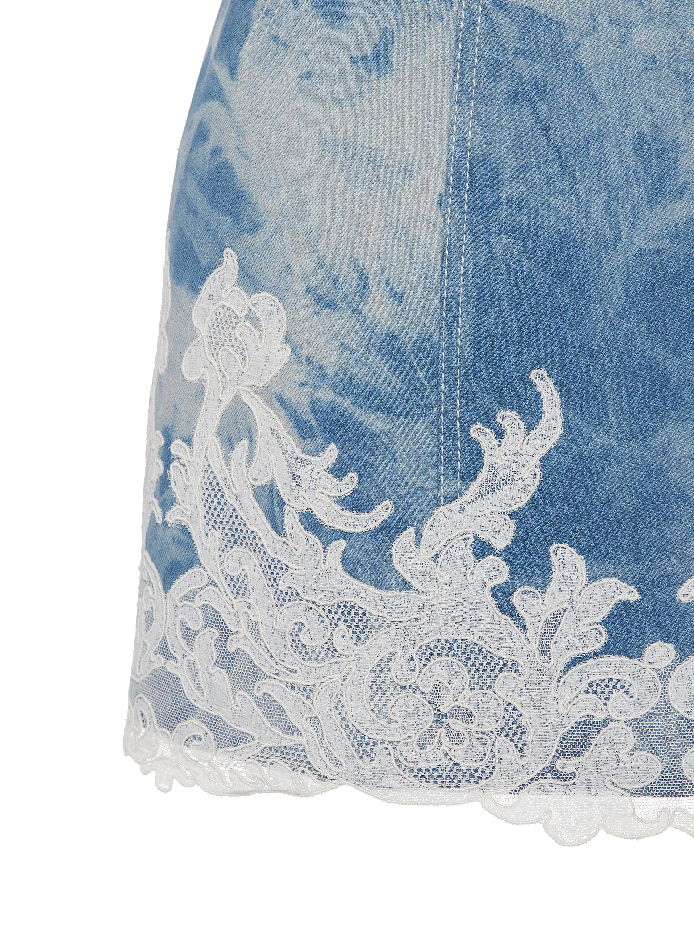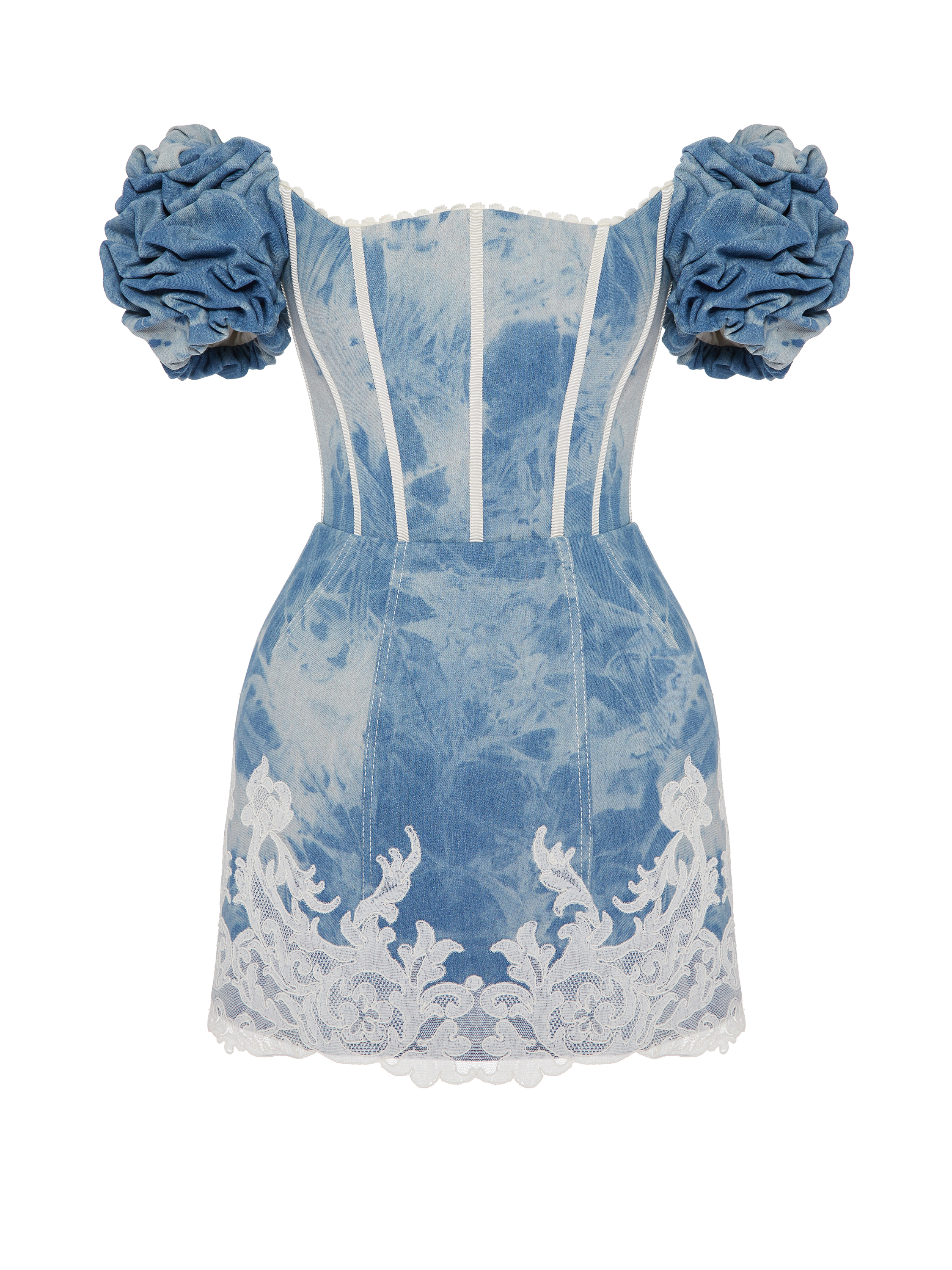 Mini dress with an open shoulder line is made of blue denim fabric in white streaks, made in the tie-dye technique. The corset bodice creates an incredibly sophisticated silhouette, short sleeves are decorated with puffy puffs. The skirt is decorated with fine white lace at the bottom. The dress is fastened with a zipper at the back.